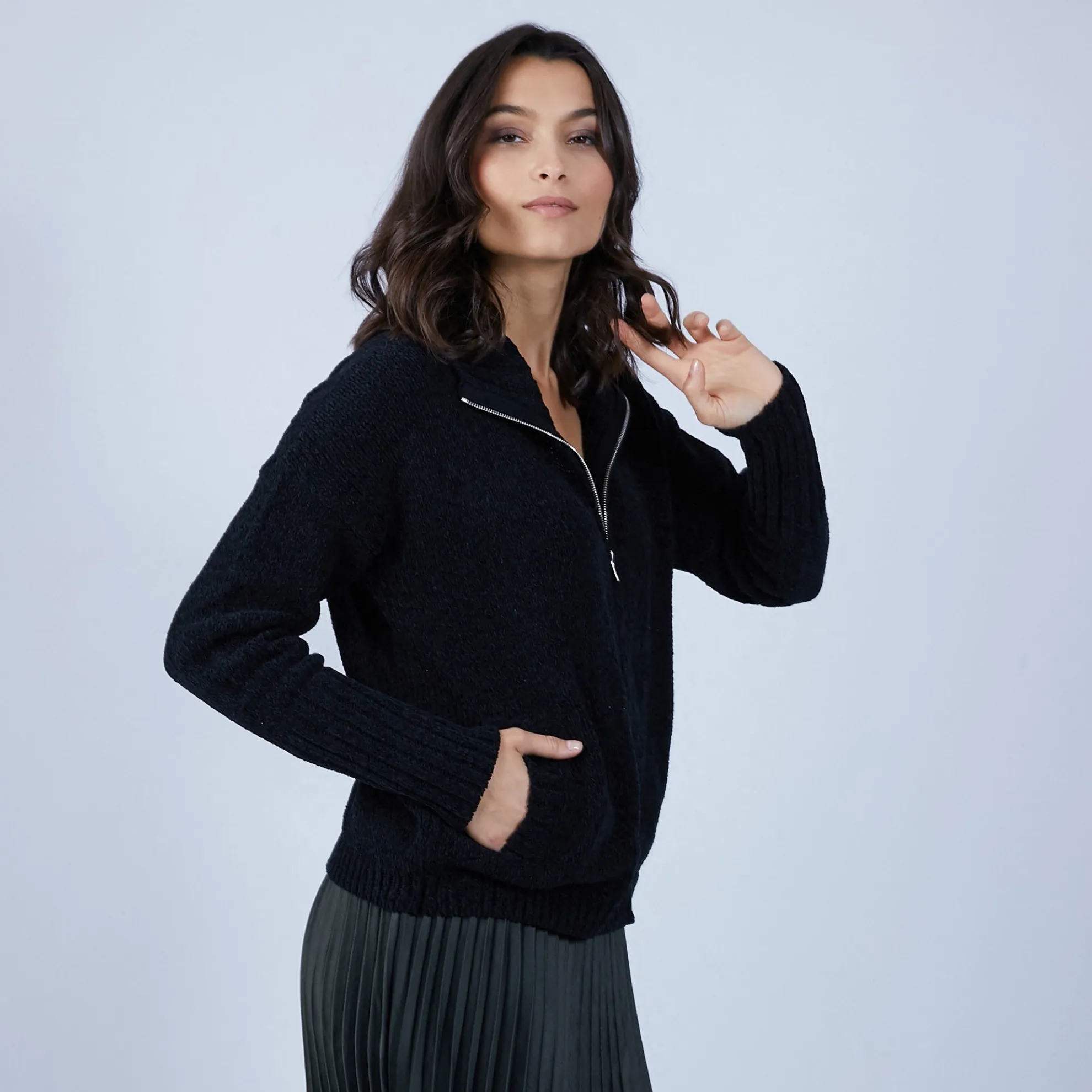 Gilet Col Montant Avec 2 Poches. Fermeture Zippee. Melange Soie Laine Qui Donne Un Aspect Velours A La Matiere. Esprit Blouson Tres Moderne. Un Basique Parmi Les Pulls De La Marque Poles.