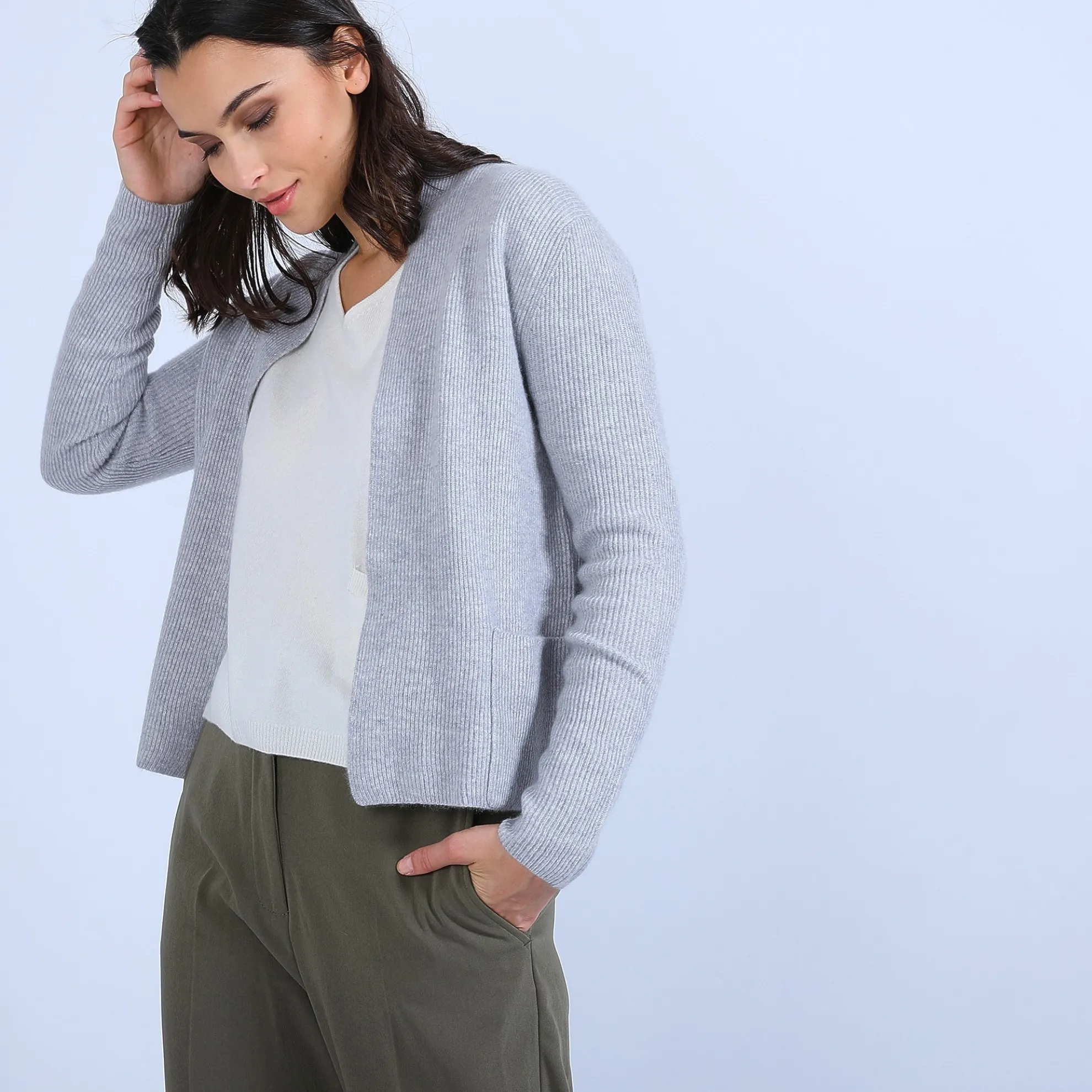 Gilet En Cachemire Pour Femme. Ouvert Sans Fermeture Ni Boutons. 2 Poches Plaquees Sur Les Cotes. Col Chale. Cotes Anglaises. Avec Sa Forme Carree, Il Est Facile A Porter Et Vous Tiendra Chaud En Toutes Circonstances.