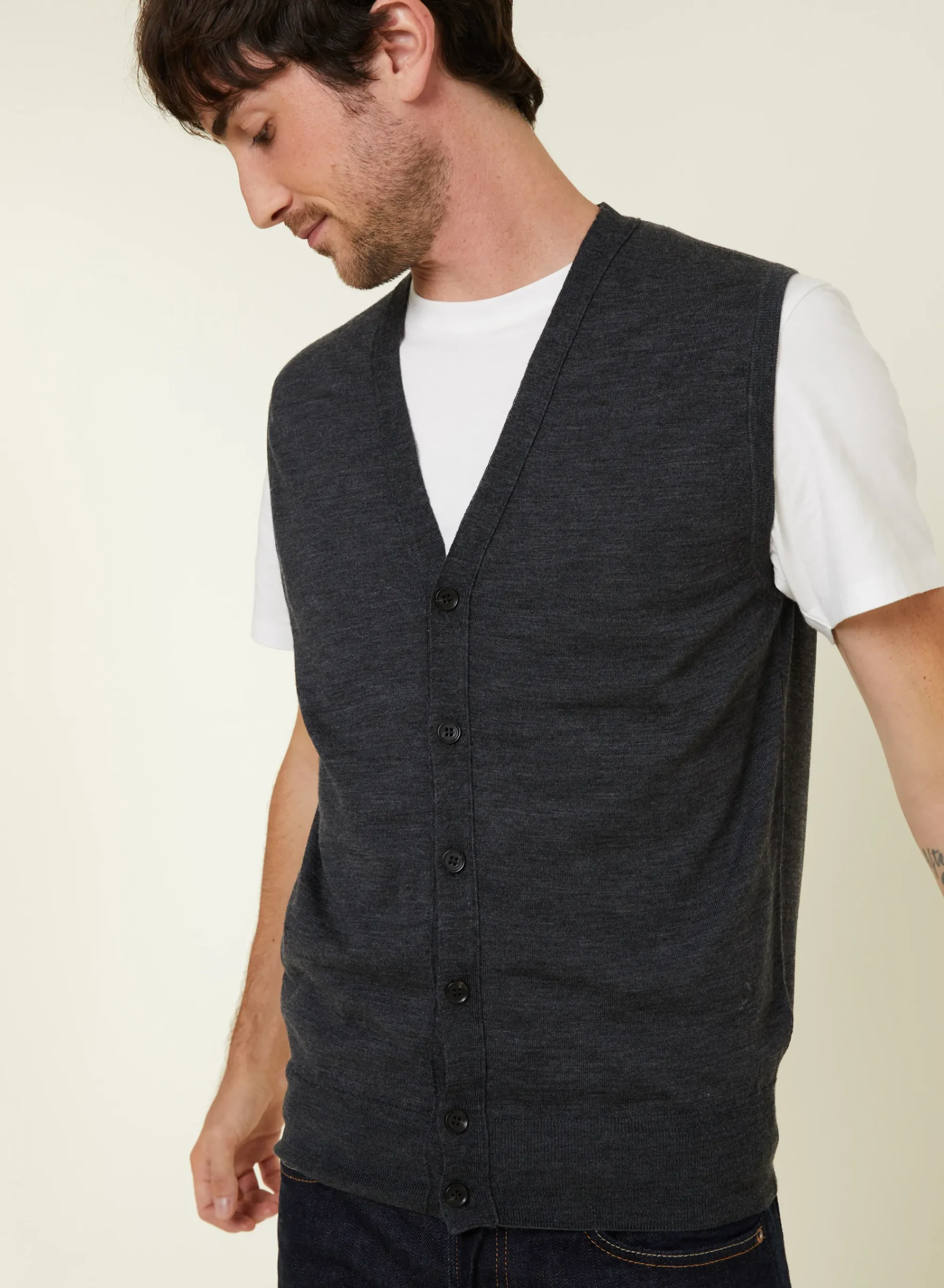 Ce Gilet Sans Manches A Encolure V Tricote En Point Jersey En Laine Merinos Dans Nos Ateliers Reste Une Piece Intemporelle De La Collection Maison Montagut. Notre Modele Se Boutonne Sur Toute Sa Longueur. Ernardo Saura Vous Accompagner Avec Style En Toutes Circonstances. En Bas De Modele Se Presente Le Logo Tricote En Ton Sur Ton. Nous Vous Conseillons De Choisir Votre Taille Habituelle.