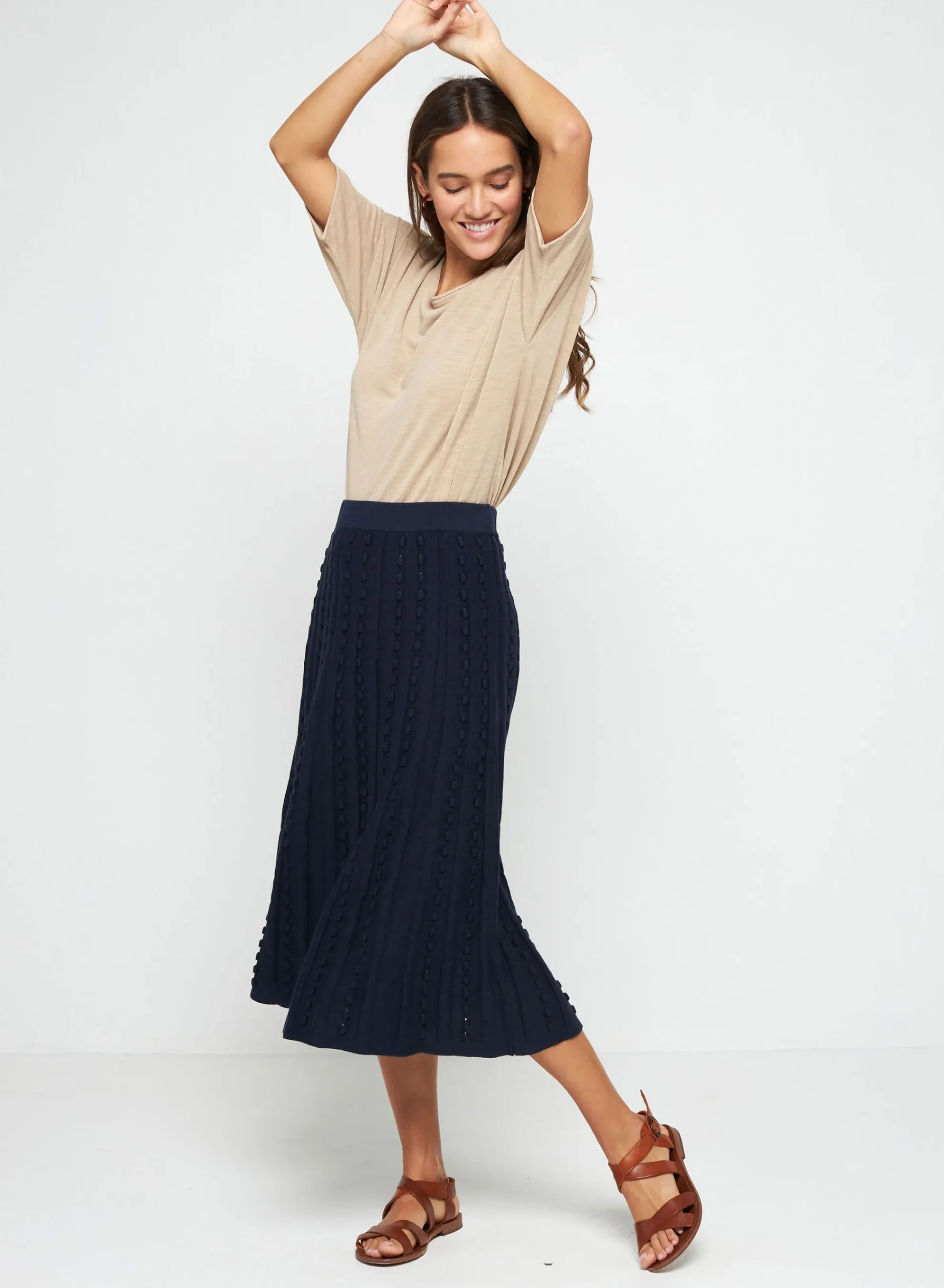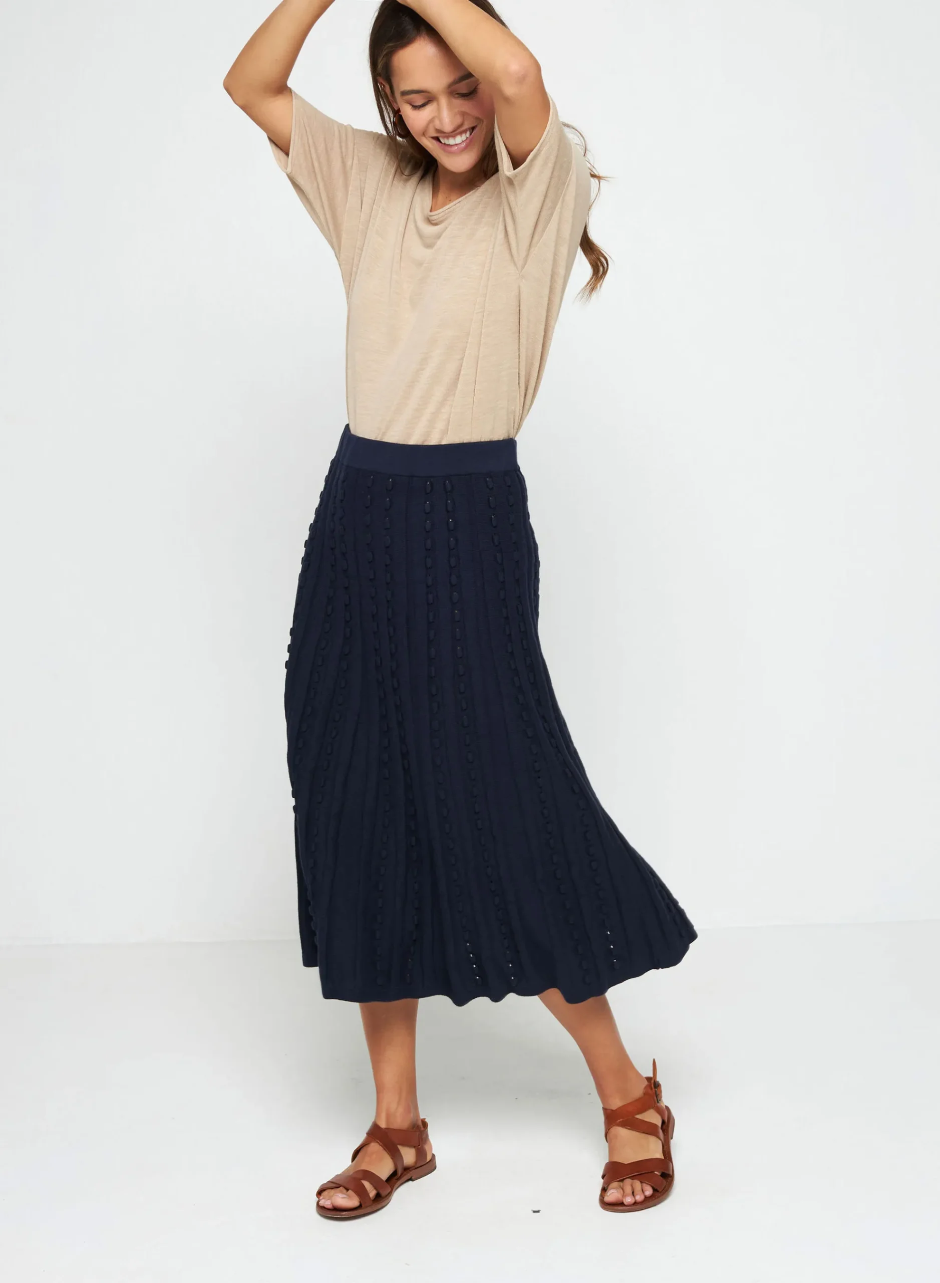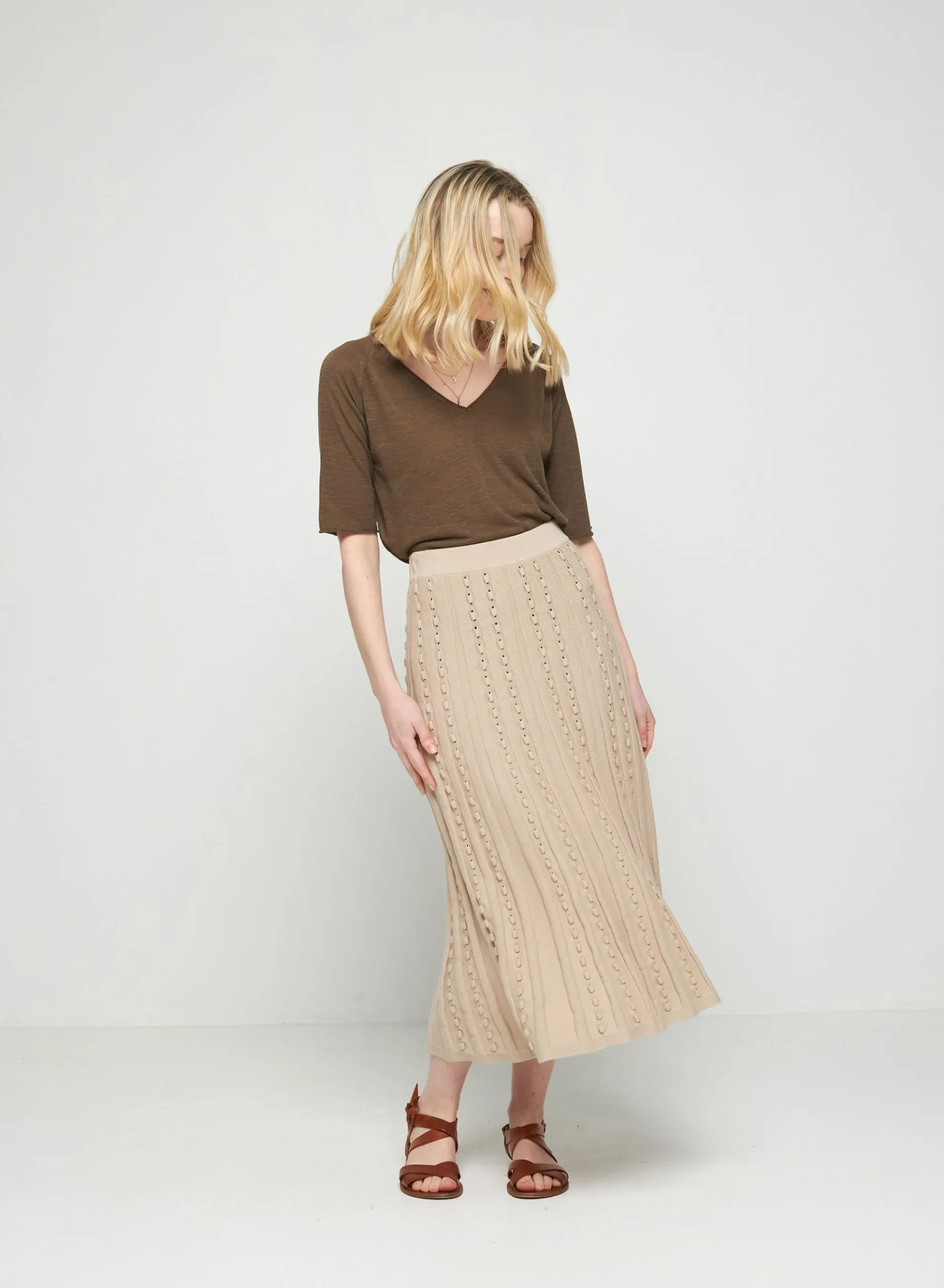 Jupe Longue Legerement Plisse En Coton Bio Tricote Dans Nos Ateliers. A La Fois Souple Et Douce, Optez Pour Notre Jupe Avec Ses Jolis Details Sur L’Ensemble Du Modele. Possede Une Taille Elastique. Nous Avons Associe Notre Jupe A Notre T-Shirt En Lin Flamme : Bonbon.