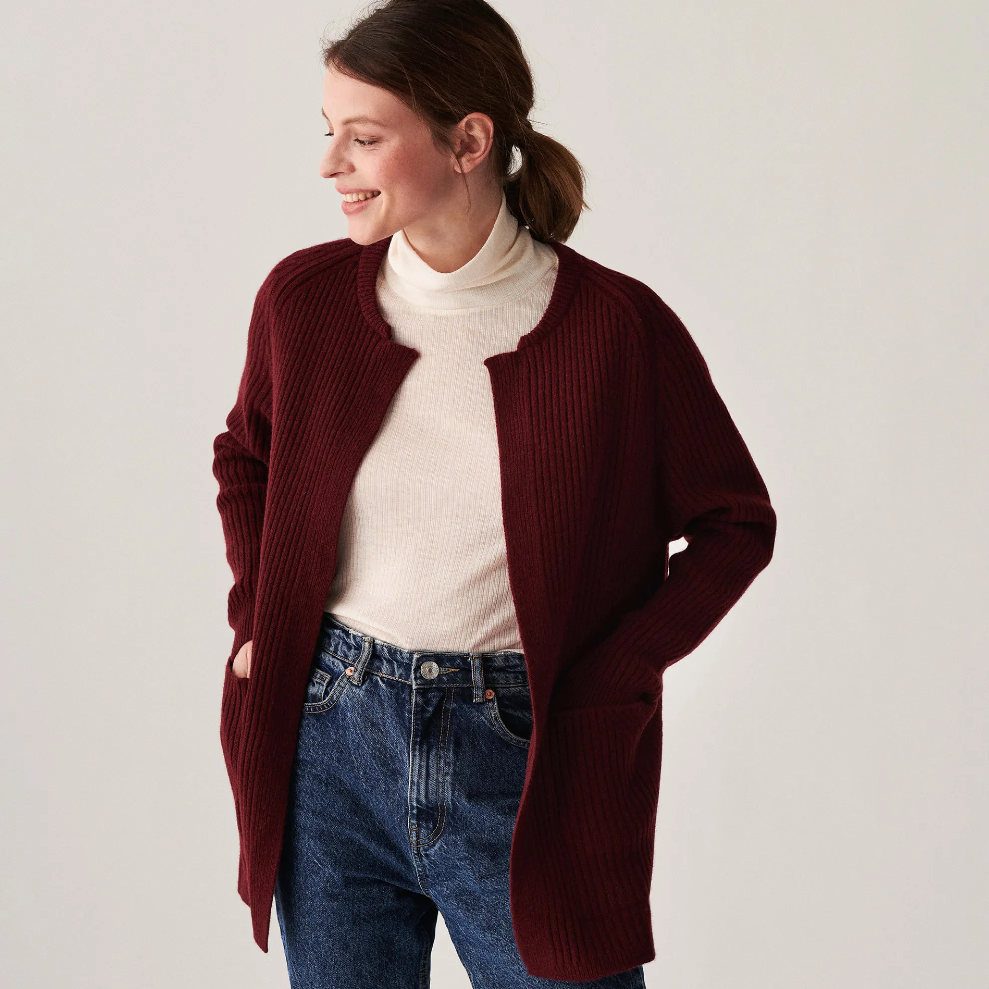 Long Gilet Manches Longues A Encolure Ronde En Cachemire Et Laine Recycles Tricote Au Portugal. Ce Modele Iconique Est La Signature Meme D’Une Mode Plus Responsable Et Attentive A Un Monde Qui Change. Gilet Ouvert A L’Emmanchure Raglan Presente 2 Grandes Poches Plaquees Ainsi Que Des Finitions Bords Cotes Sur L’Ensemble Du Vetement.