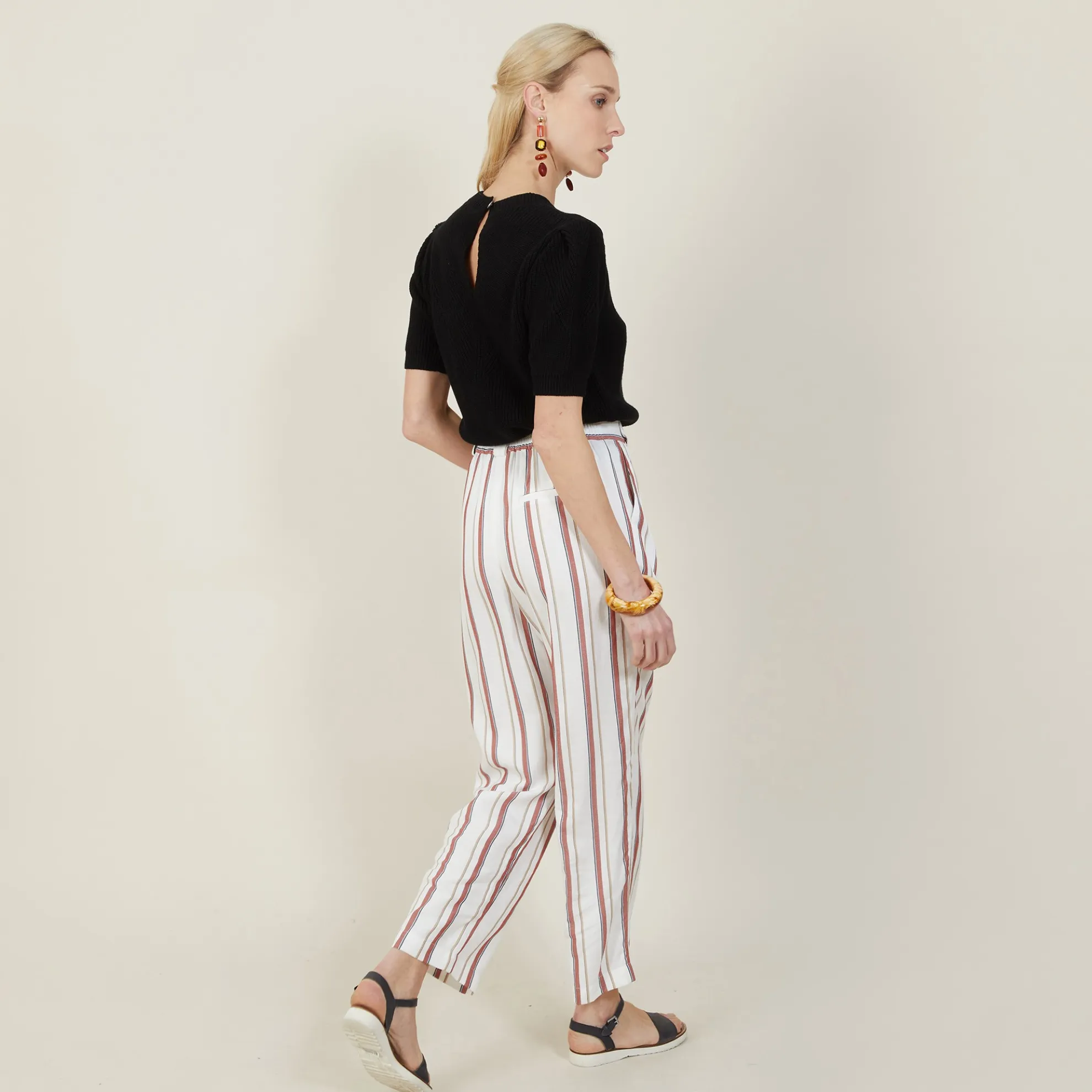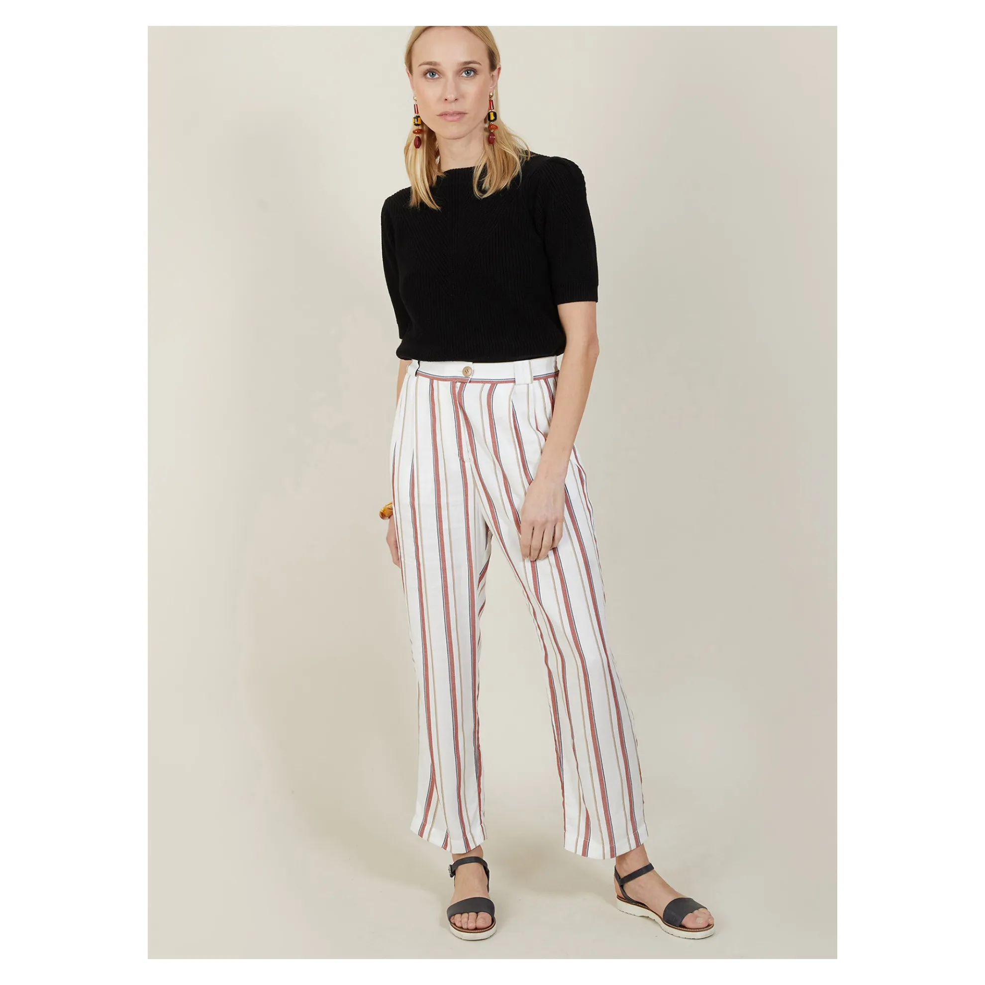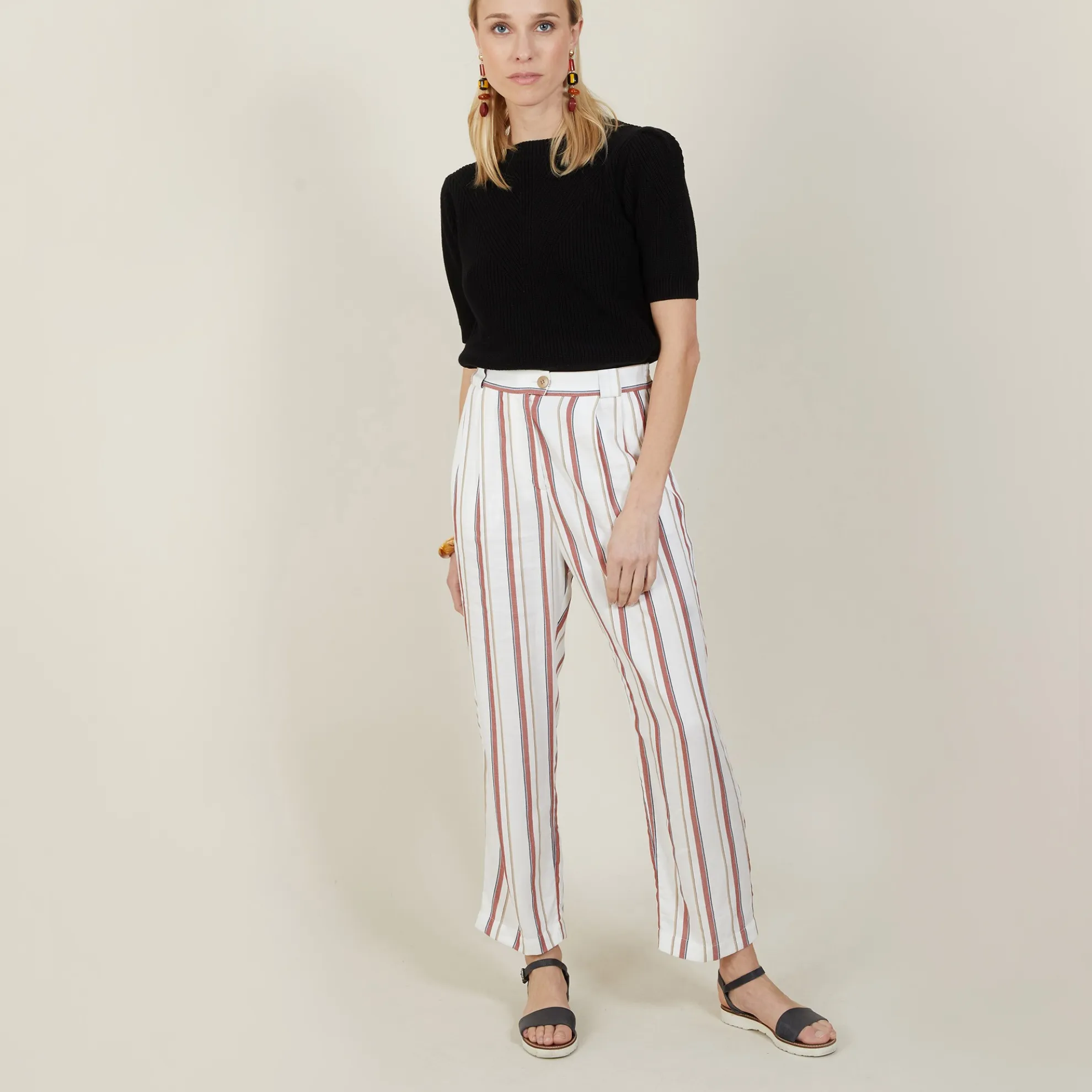 Pantalon A Poches Imprime Raye Exclusif Maison Montagut. Coupe Droite, Tissu Souple.