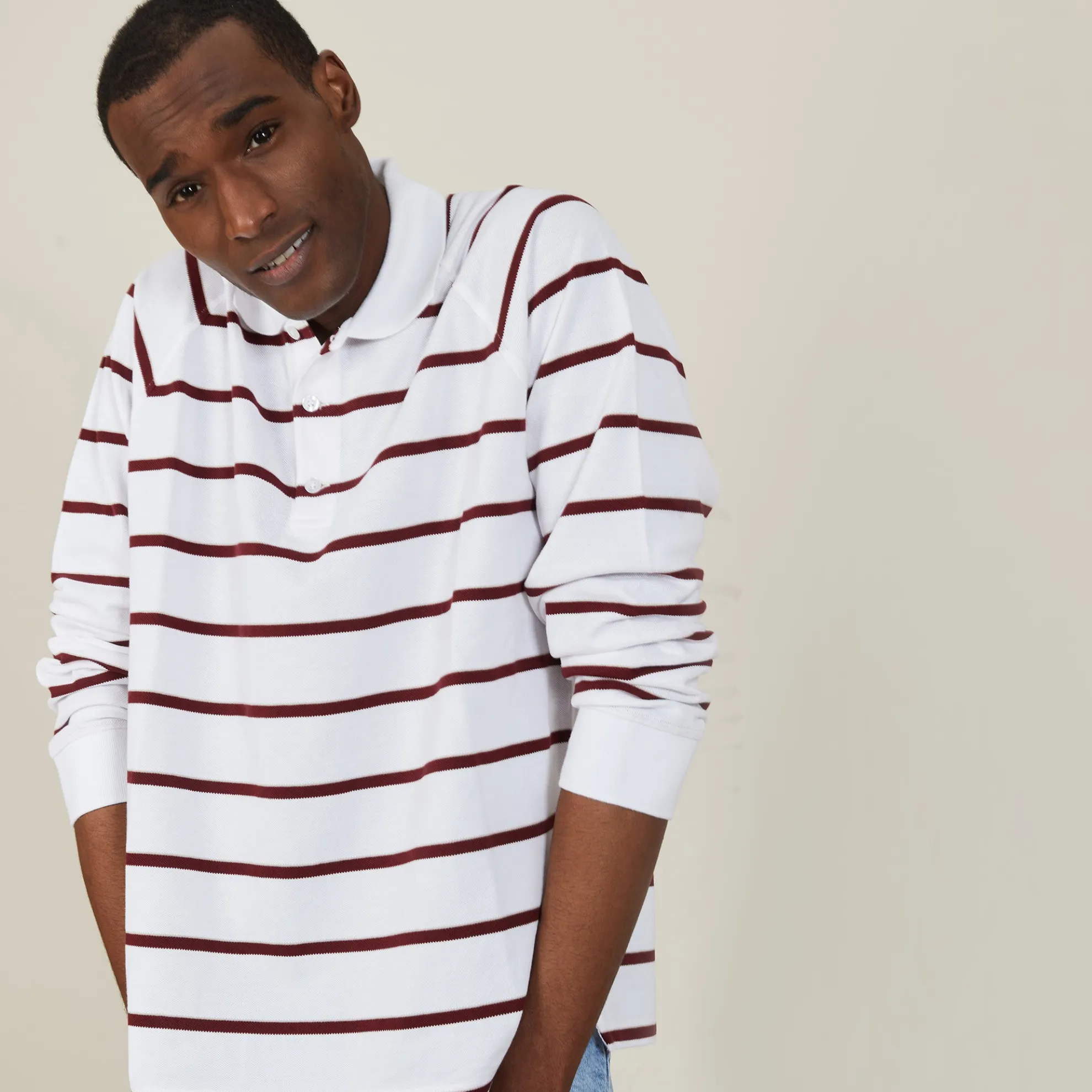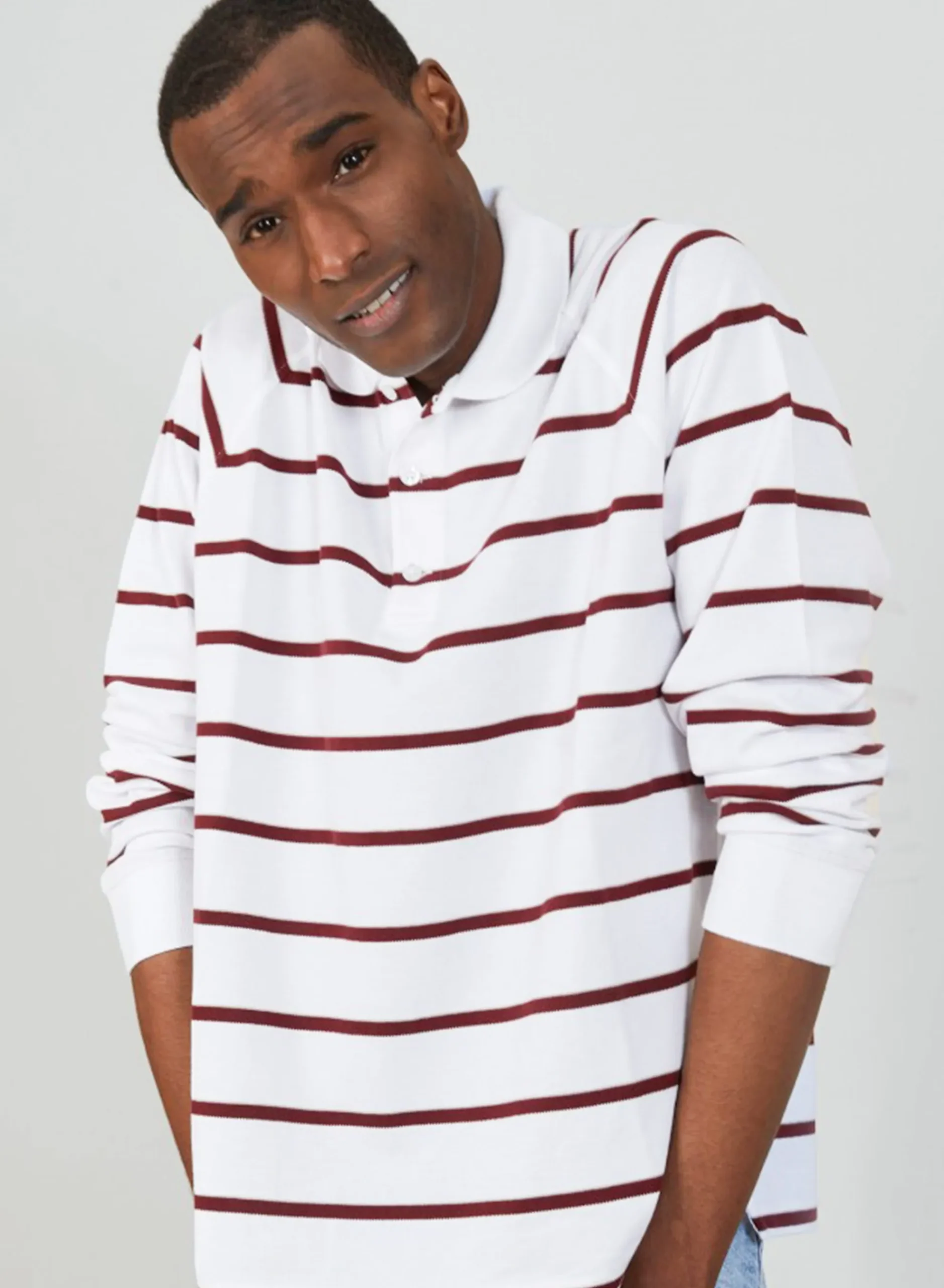 Polo En Coton Tricote En Point Jersey Dans Nos Ateliers De Braga. Coupe Droite, Manches Longues, Encolure Polo, Emmanchures Raglan. Rayures Sur L’Ensemble Du Modele.