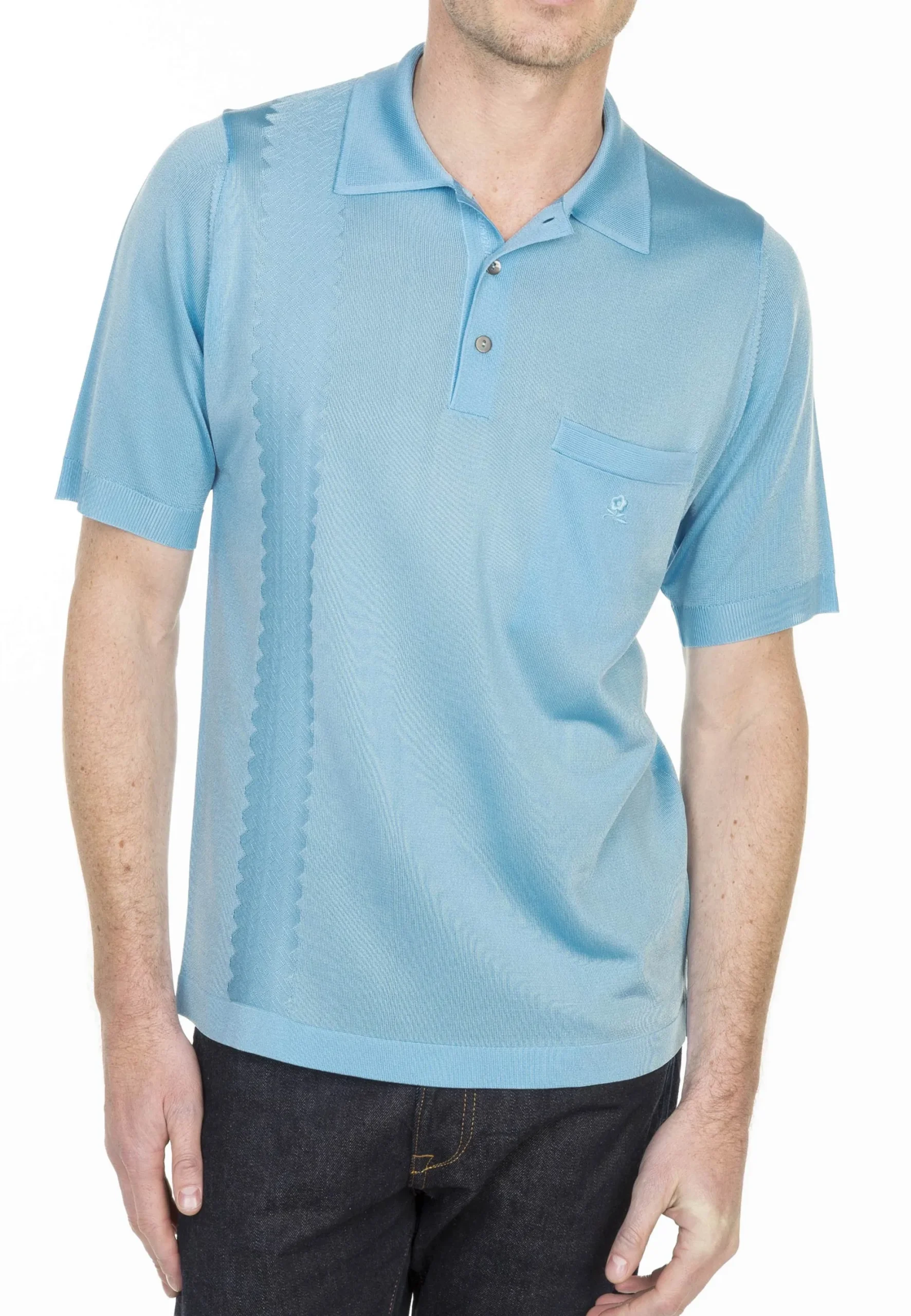 Polo Manches Courtes Pour Homme En Fil Lumiere. Motif Geometrique Sur Le Cote Droit Et Sur Toute La Hauteur Du Vetement, Devant. Logo Montagut Brode Sur La Poche Plaquee Cote Gauche De La Poitrine.