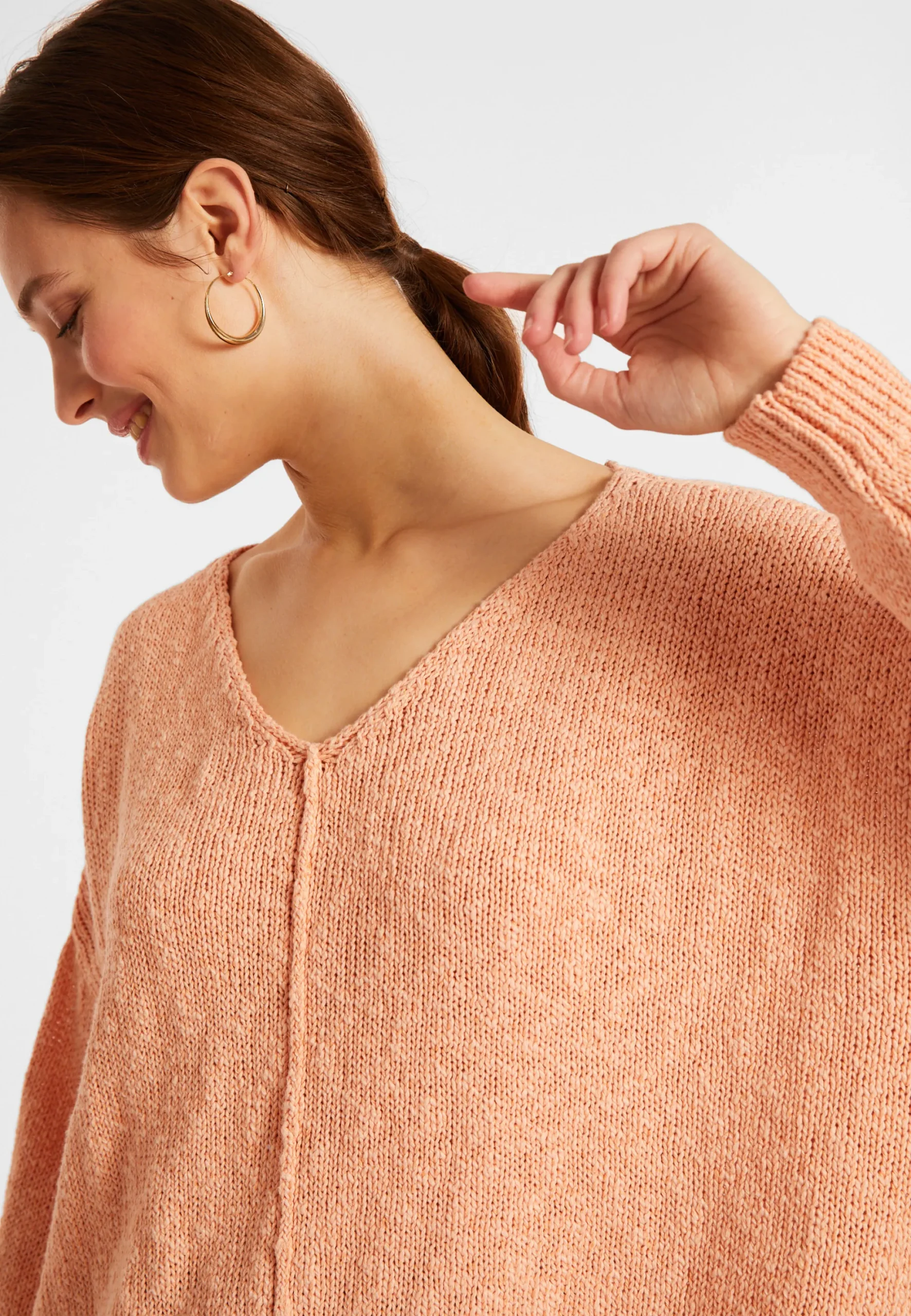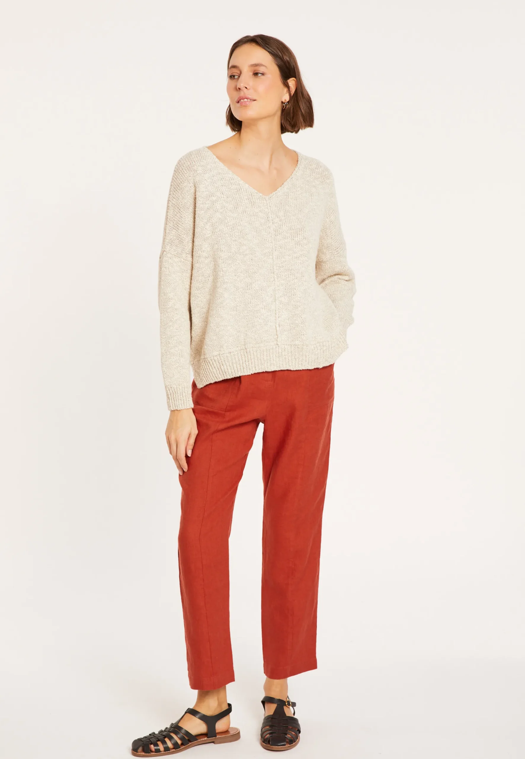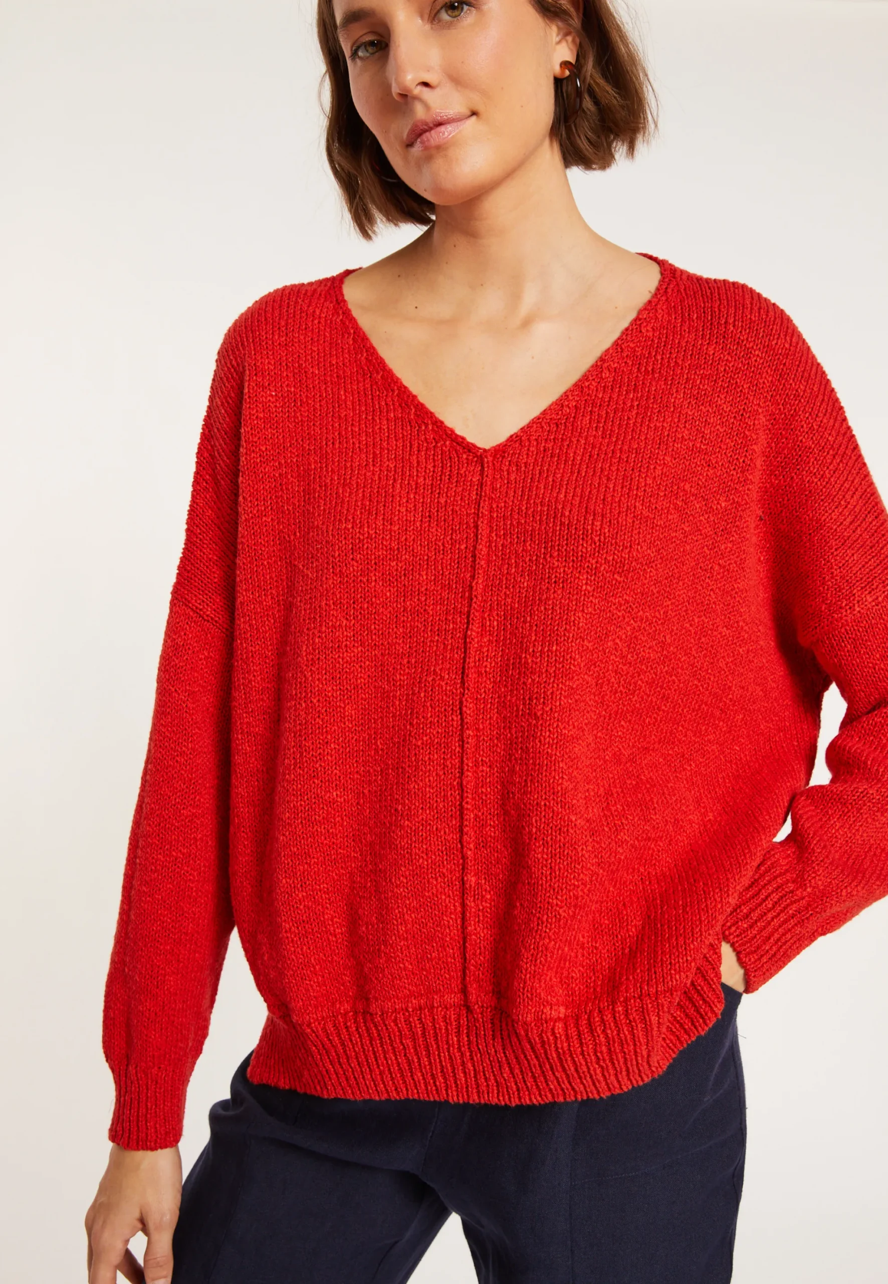 Pull A Encolure V Grosses Mailles Tricote Dans Nos Ateliers En Coton Et Lin. Sa Matiere Legere Et Sa Maille Aeree Apporte De La Legerete Au Pull. Une Touche D’Originalite Avec Les Coutures Legerement Visibles Sur L’Exterieur. Coupe Ample, Emmanchures Basses Pour Une Aisance Extreme, Notre Modele Possede Deux Petites Fentes De Chaque Cote.
