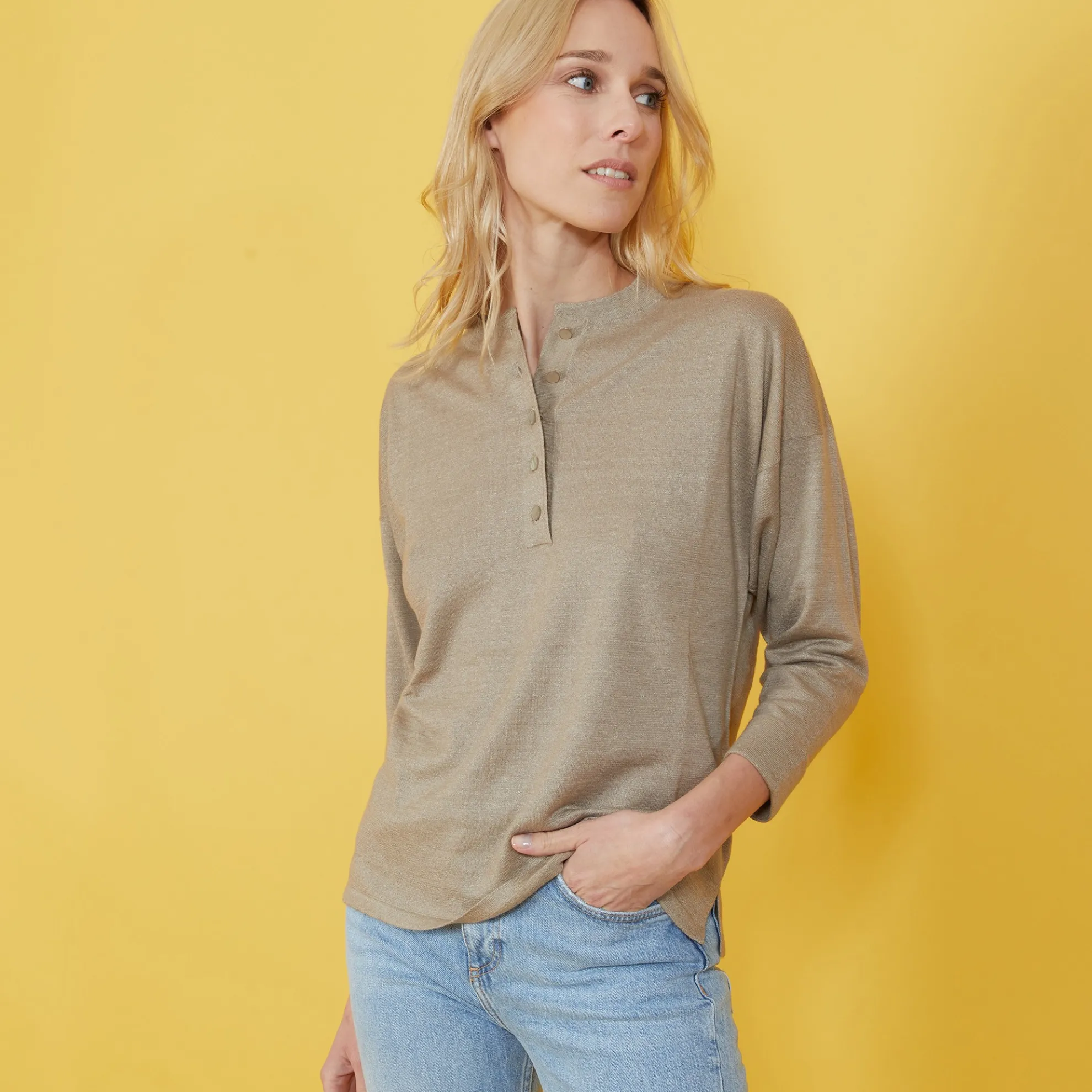 Pull En Maille Fine Point Jersey Tricote Au Portugal. Inspiration Vareuse Avec Son Col Tunisien Et Son Empiecement Boutonne Devant. Manches ¾ Larges Avec Revers Cousu. Emmanchure Basse.