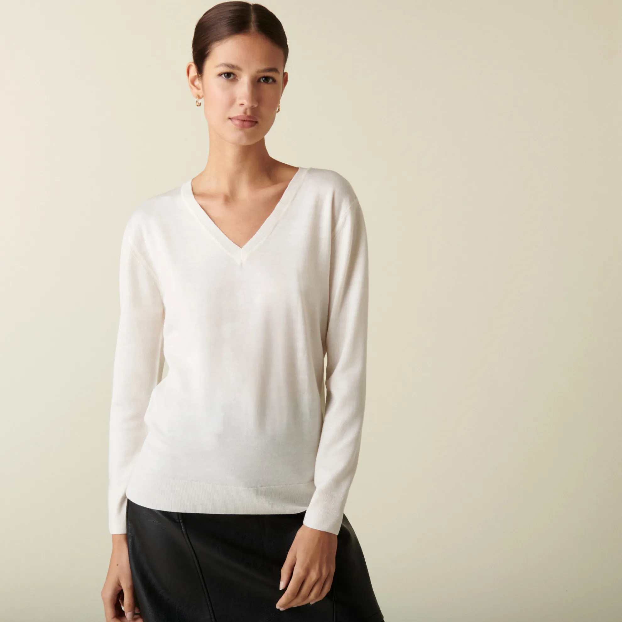 Pull Encolure V Tricote En Laine Merinos, Point Jersey Au Portugal. Coupe Droite A Manches Longues Et Col V. Finitions Bords Cotes Au Niveau Du Col, Sur Le Bas Des Manches Et Du Pull.