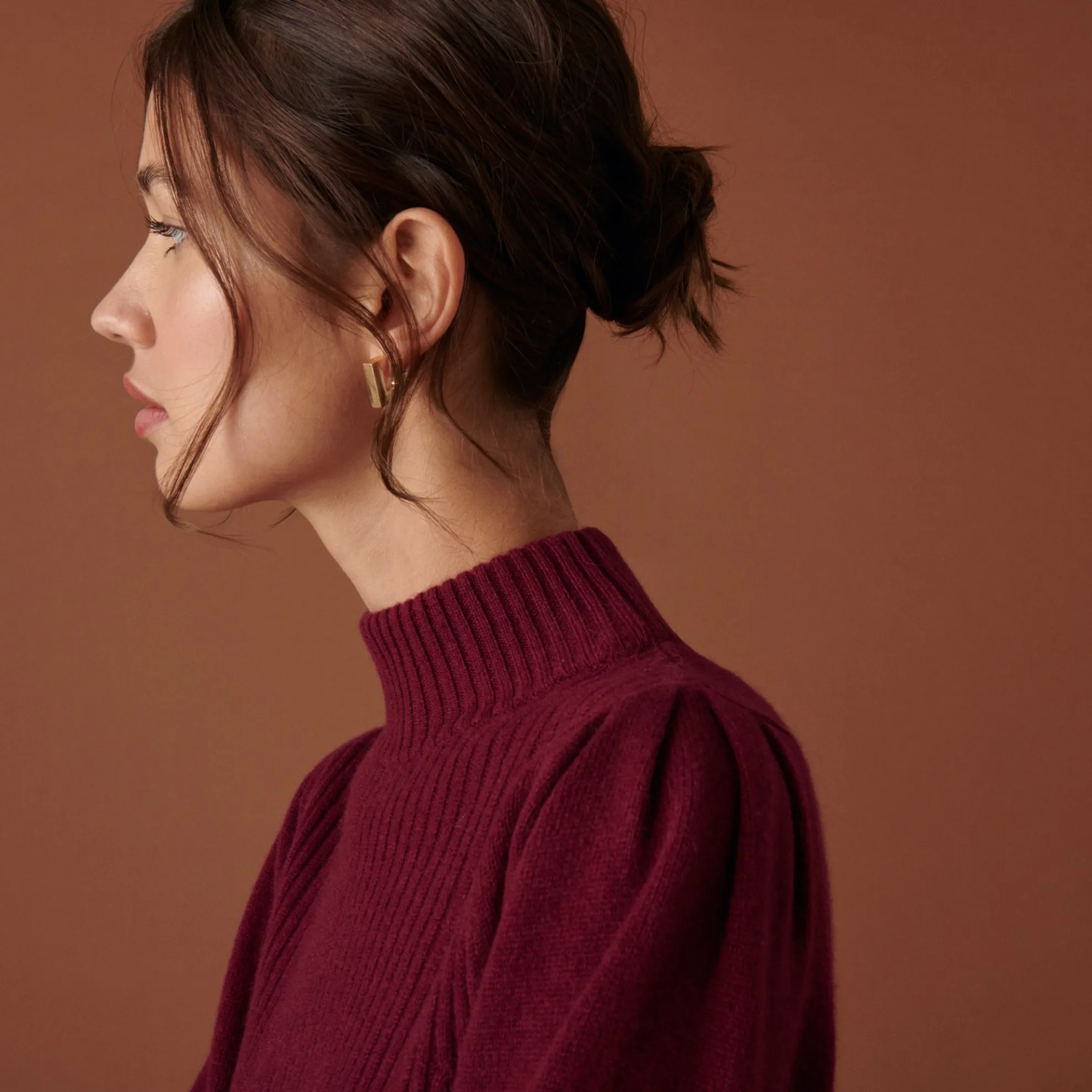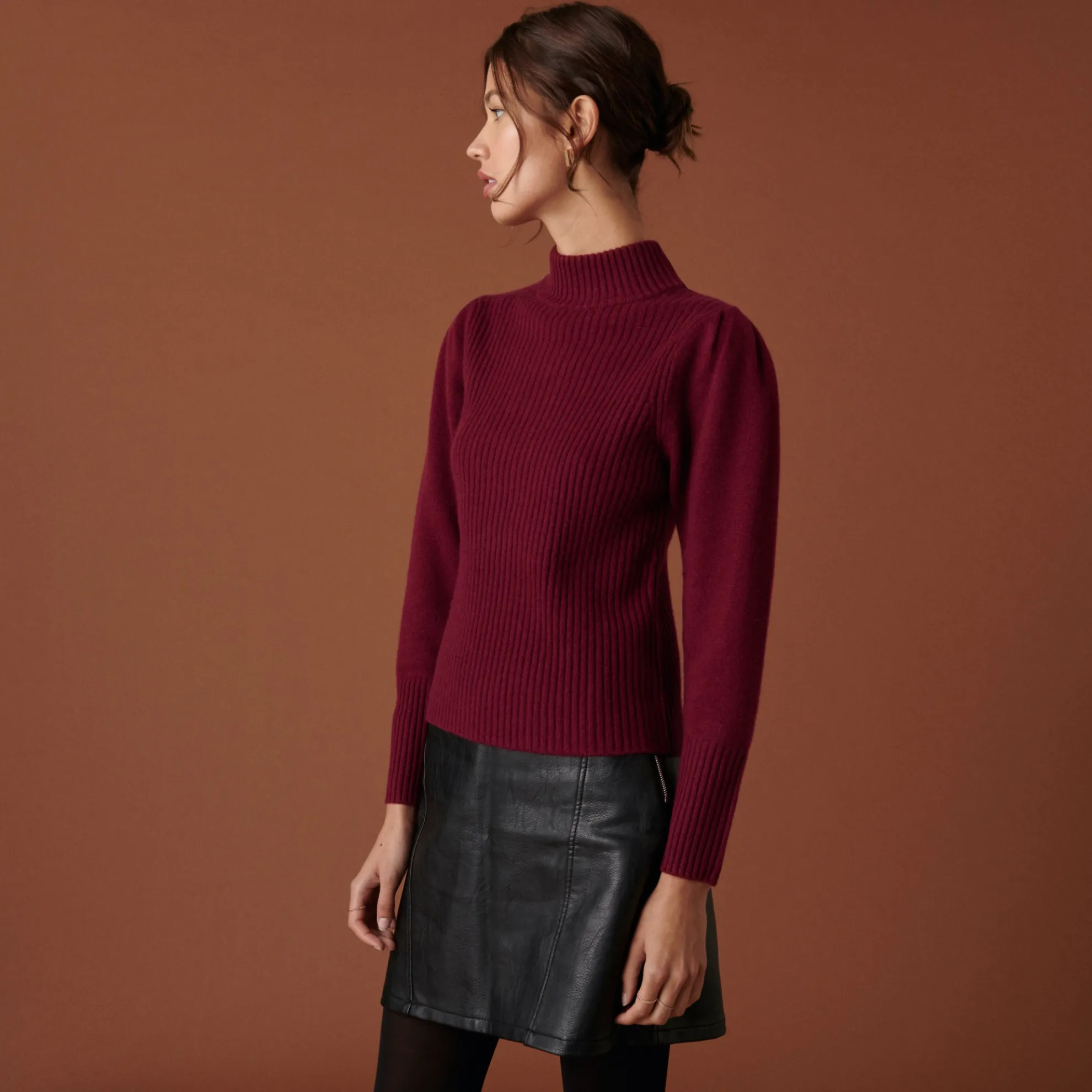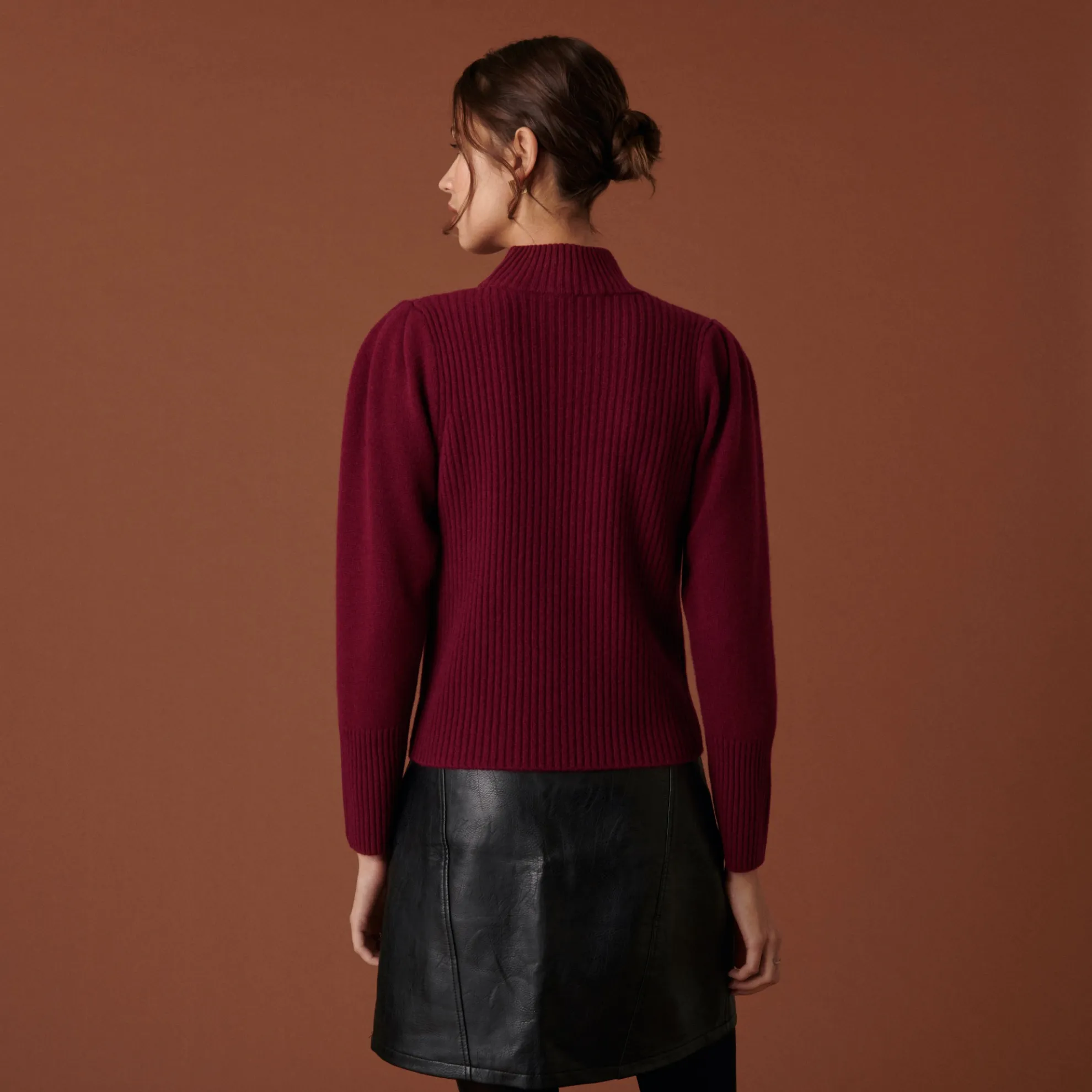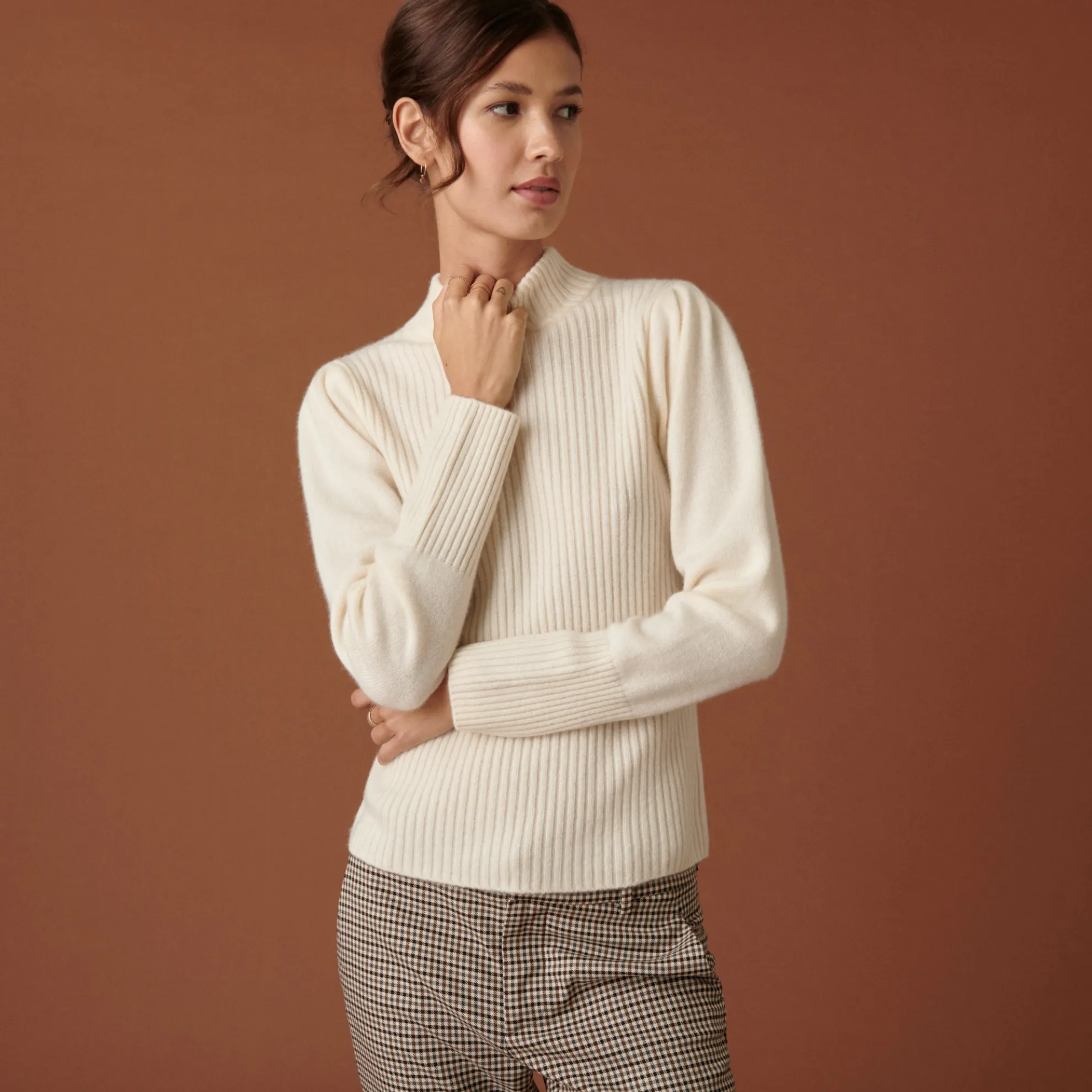 Pull Col Montant En Maille Cotelee Tricote En Cachemire 4 Fils. Manches Ballons, Coupe Droite. Finitions Bords Cotes.