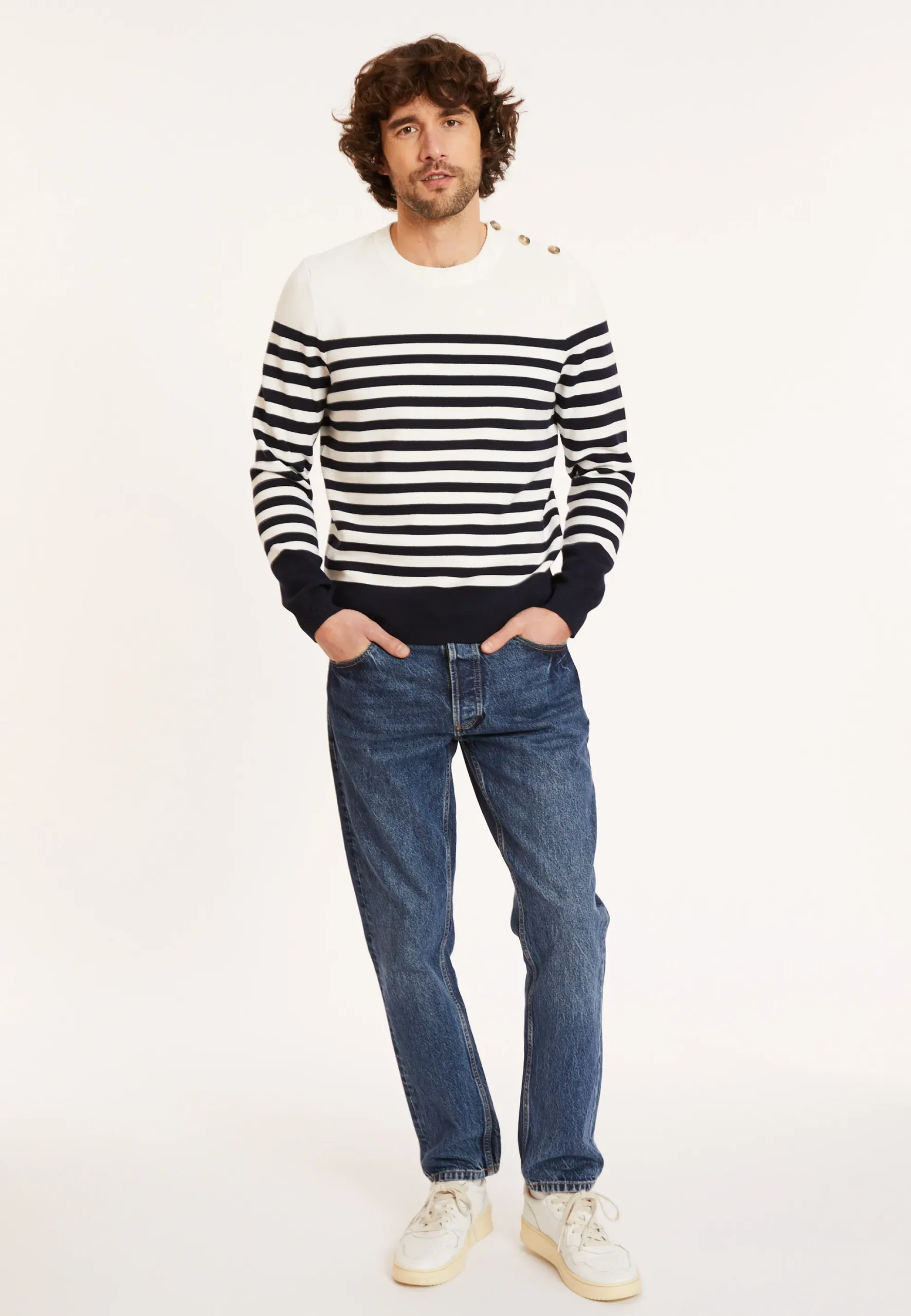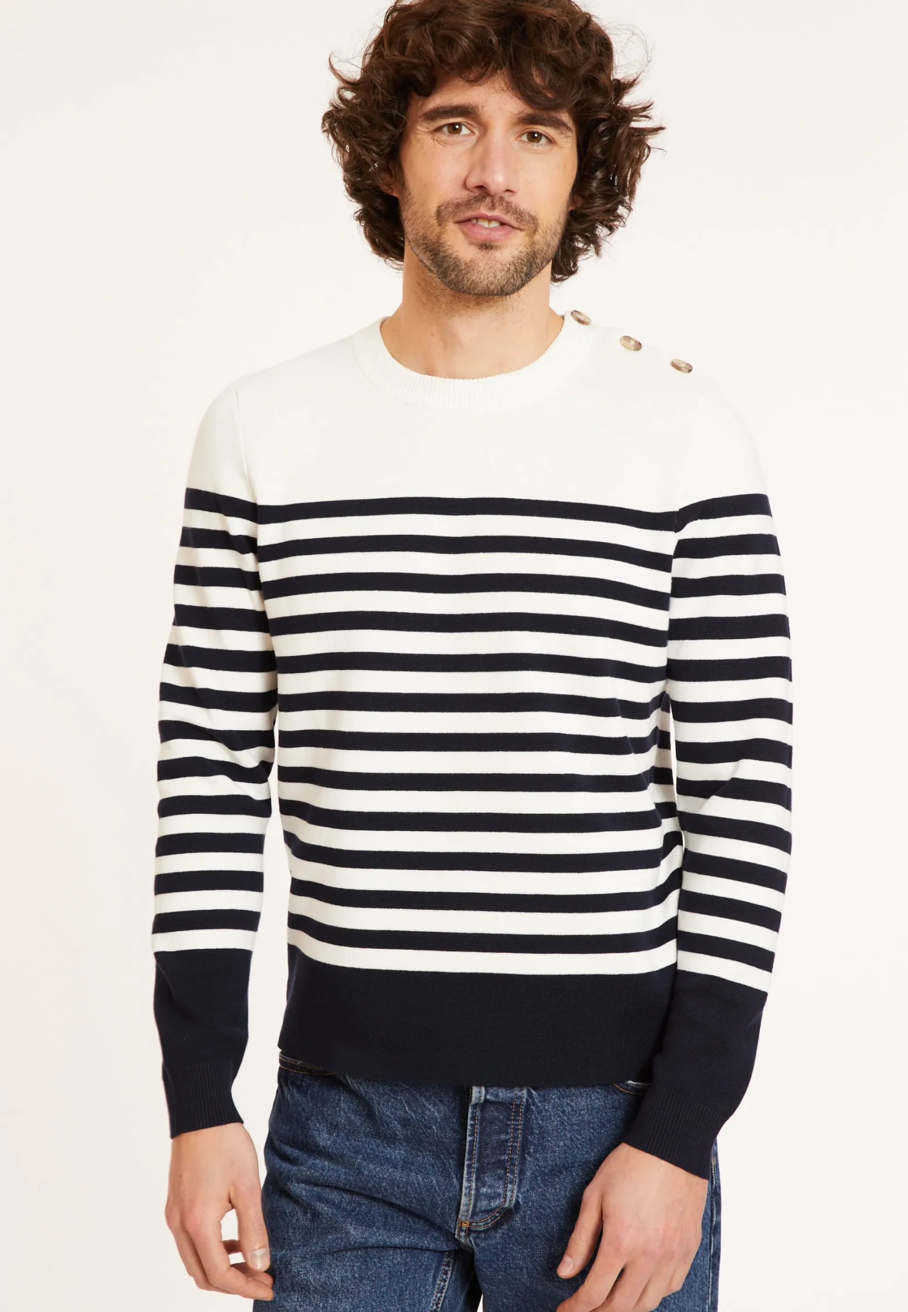 Tricote Dans Nos Ateliers, Ce Pull Intemporel Offre Un Style Classique Et Elegant Avec Une Touche De Modernite. Avec Sa Respirabilite Et Son Confort, Le Pull Est Parfait Pour Differentes Occasions, Du Decontracte Au Plus Formel. Dory Presente Une Rangee De Boutons Au Niveau De L’Epaule, La Coupe Est Ajustee Et Sa Mariniere Intemporelle Ajoute Une Touche De Sophistication Et De Style A Votre Garde-Robe.