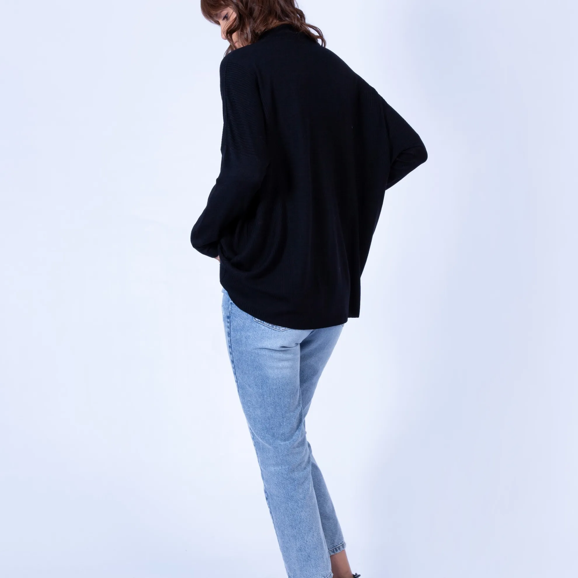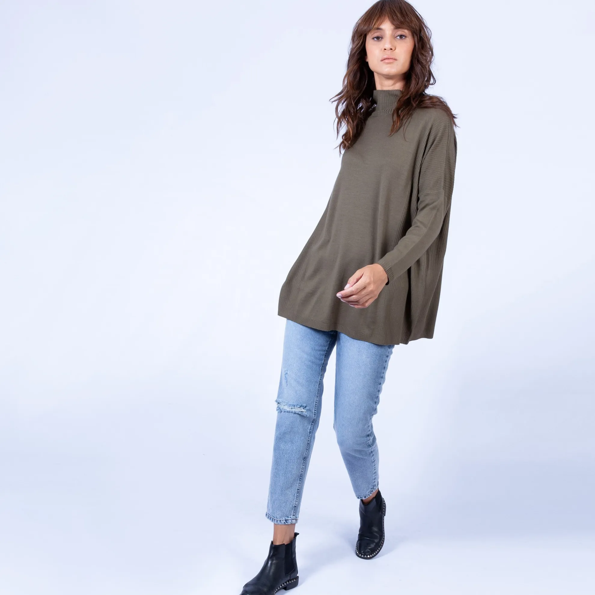 Pull Col Montant En Laine Et Soie Pour Femme. Coupe Large Et Carree Ou L’On Se Sent Forcement A L’Aise. Devant Et Dos : Jeu De Cotes Sur Les Epaules Jusqu’En Bas Du Vetement Avec Un Rappel Sur Les Poignets. Decline Dans 4 Coloris Faciles A Combiner Avec Tous Vos Bas.