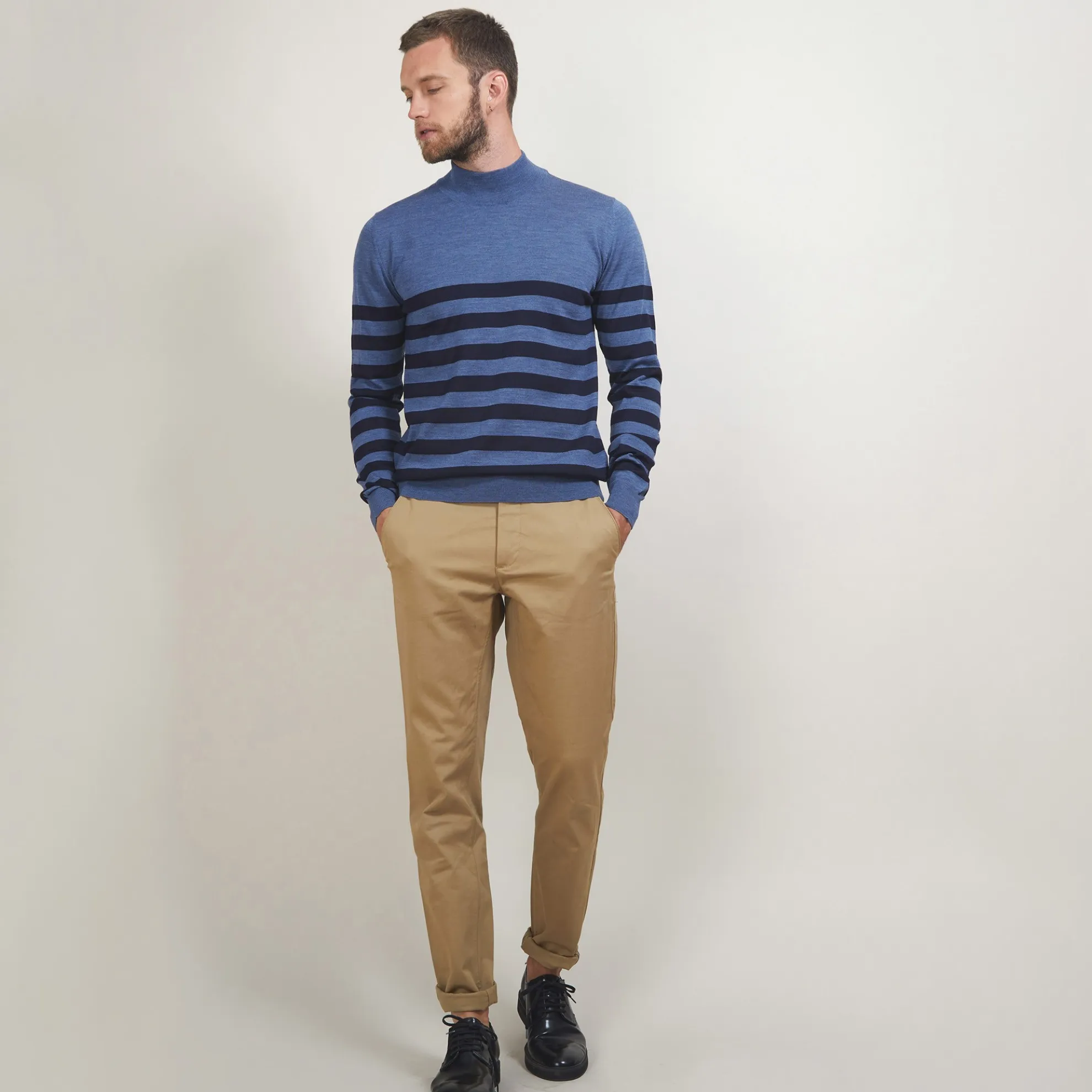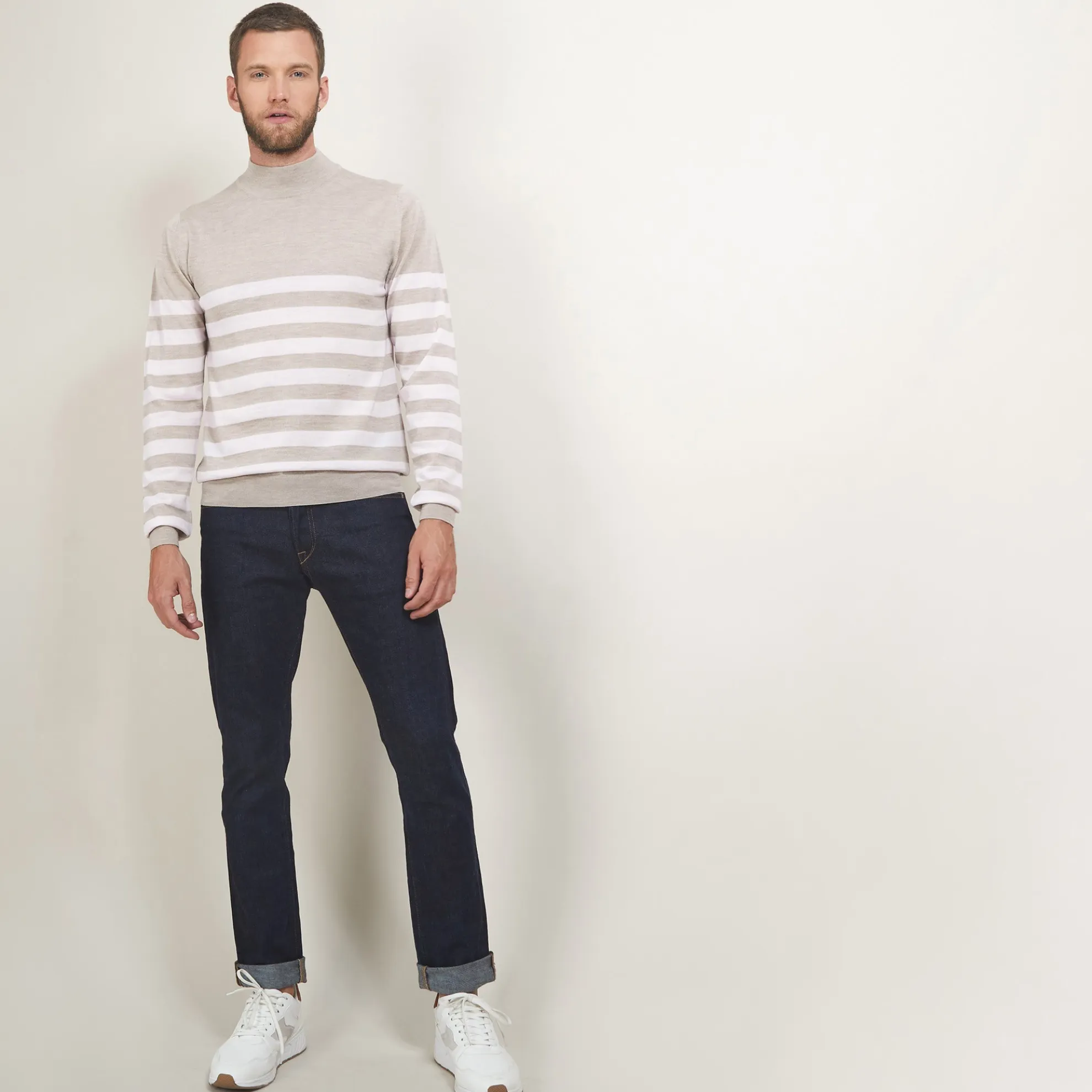 Pull Col Montant En 100% Laine Merinos, L’Indispensable Pull Marin Raye Qui S’Accordera Facilement Avec Toutes Vos Tenues D’Hiver. A Associer Avec Un Chino Ou A Un Jean Brut Pour Un Style Decontracte Ou Chic.