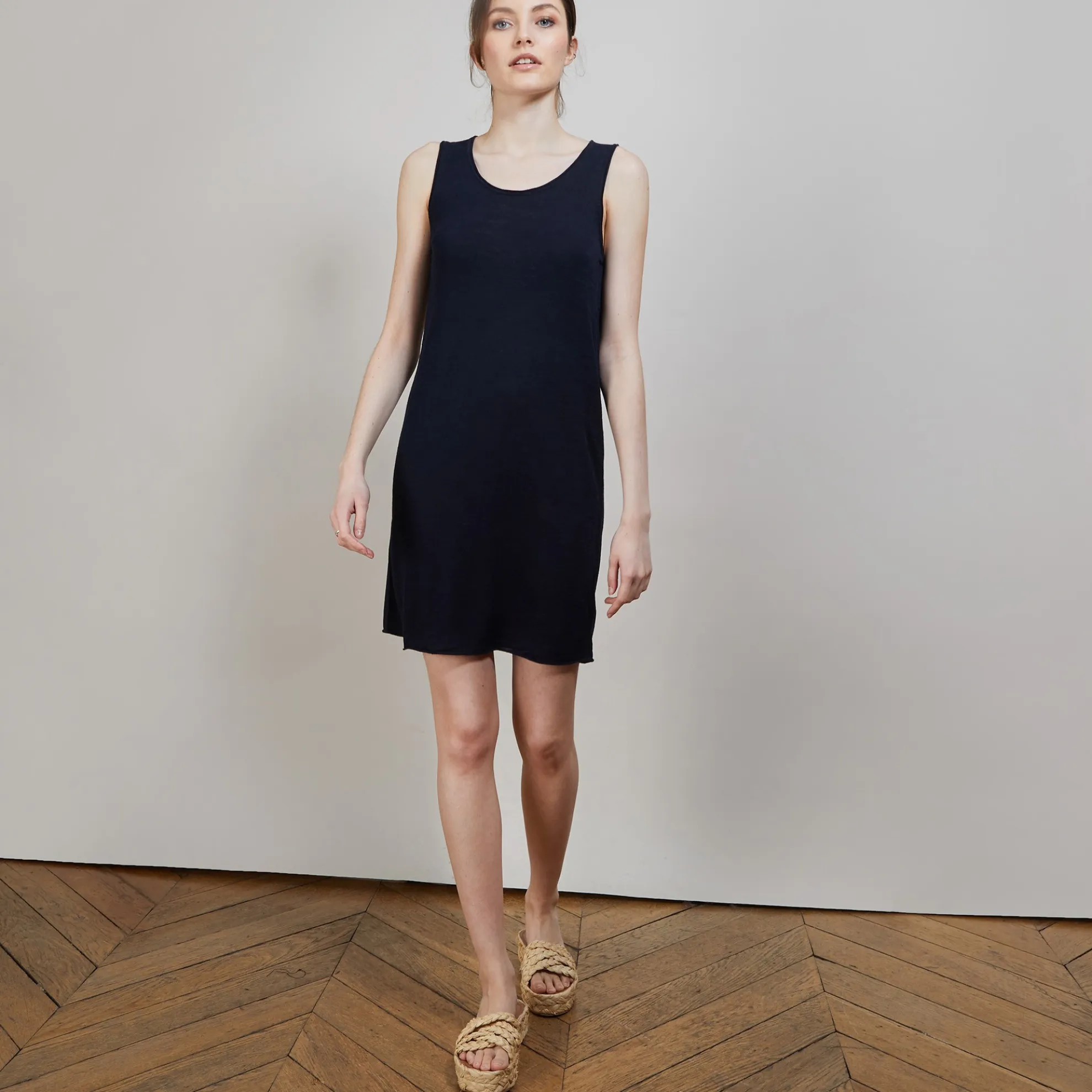Robe En Lin Flamme Tricote Dans Nos Ateliers. Robe A Porter En Toute Simplicite Avec Son Melange De Matiere Viscose Lin Et Polyamide Qui La Rend Tres Legere Et Agreable A Porter A Meme La Peau En Periode Estival. Elle Peut Aussi Etre Portee En Tant Que Fond De Robe Pour Les Autres Saisons.