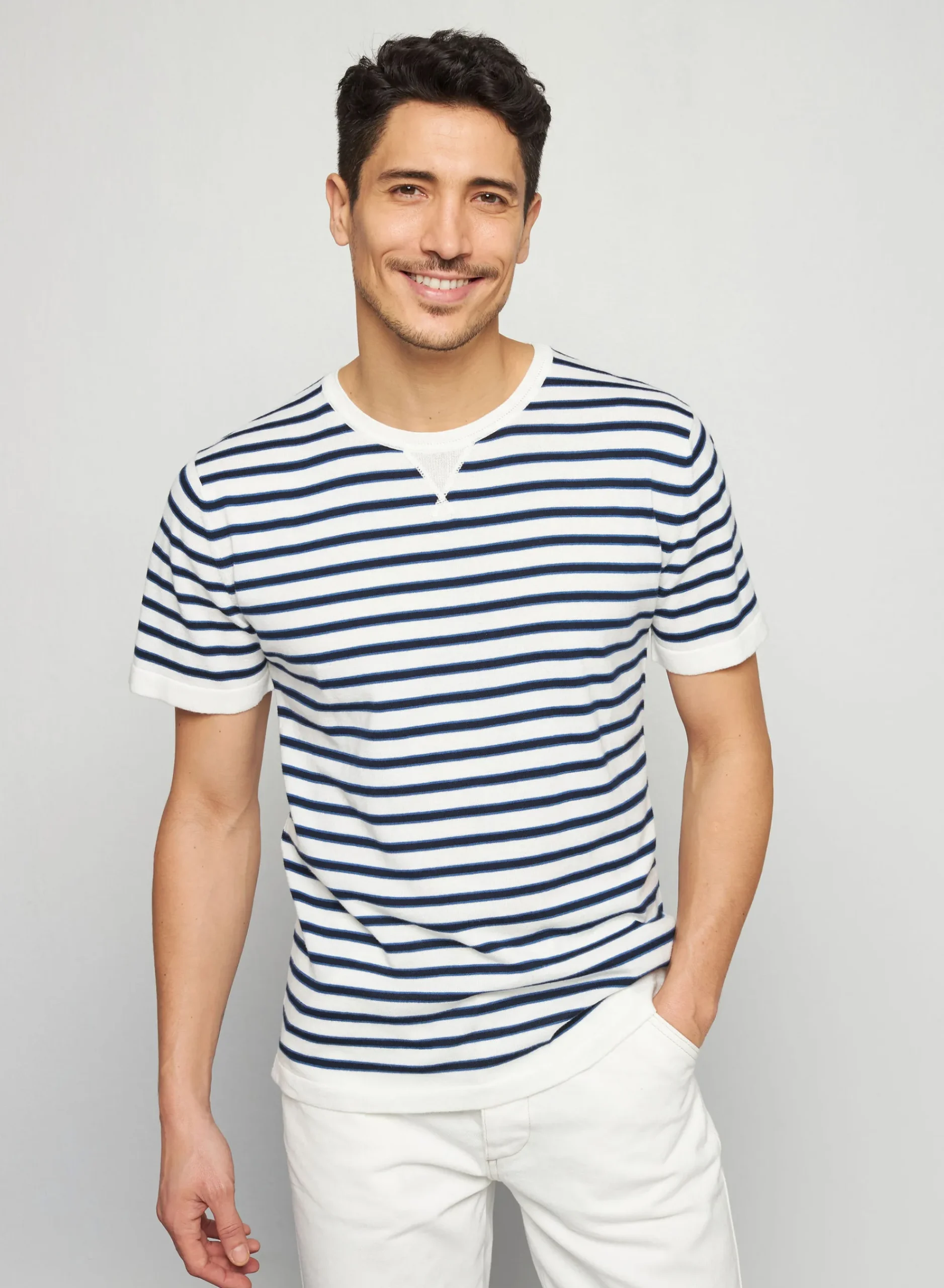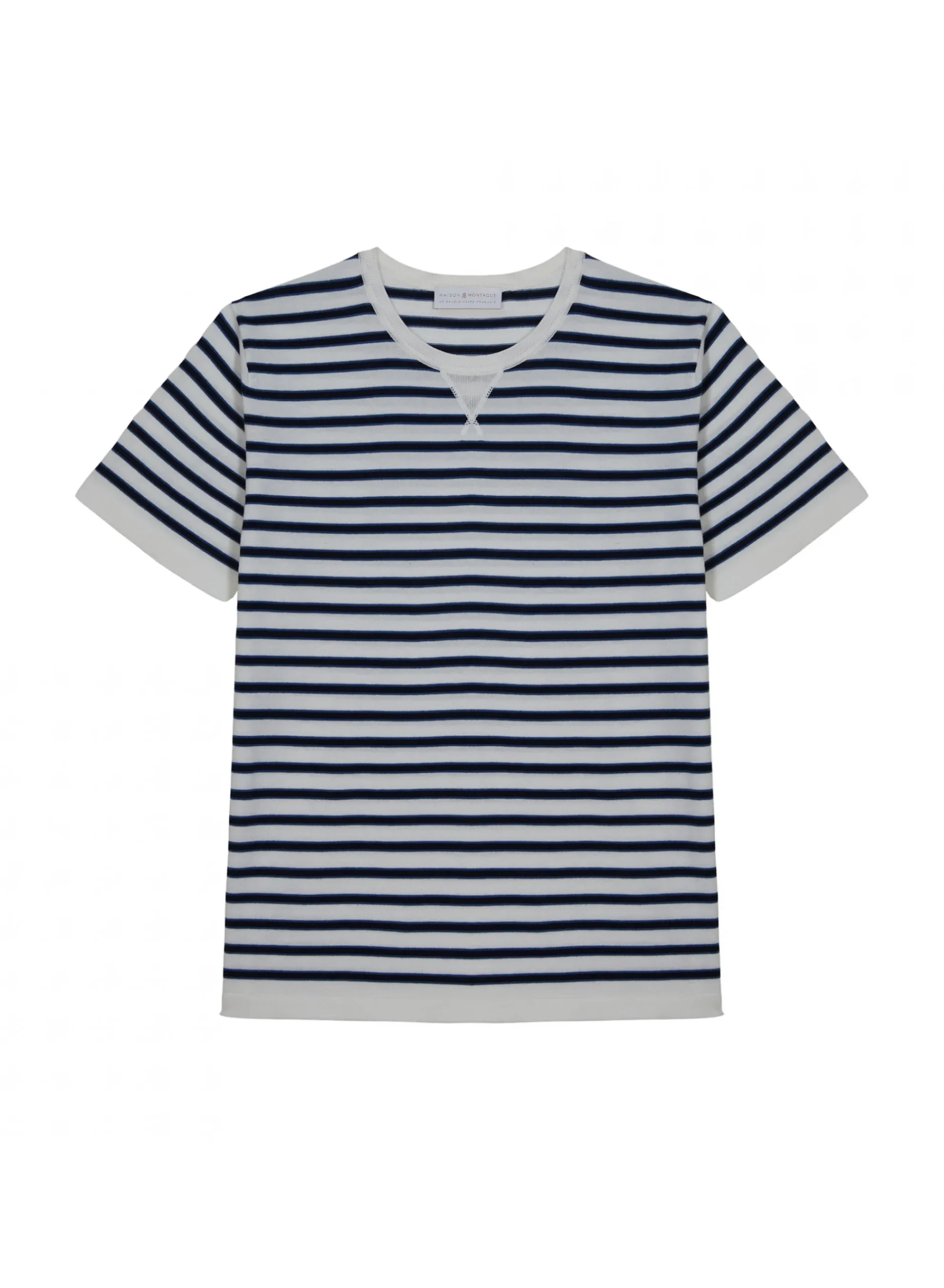 T-Shirt En Coton Bio Tricote En Point Jersey Dans Nos Ateliers De Braga. Coupe Droite, Manches Courtes, Encolure Ronde, Emmanchures Droites. Rayures Sur L’Ensemble Du Modele.