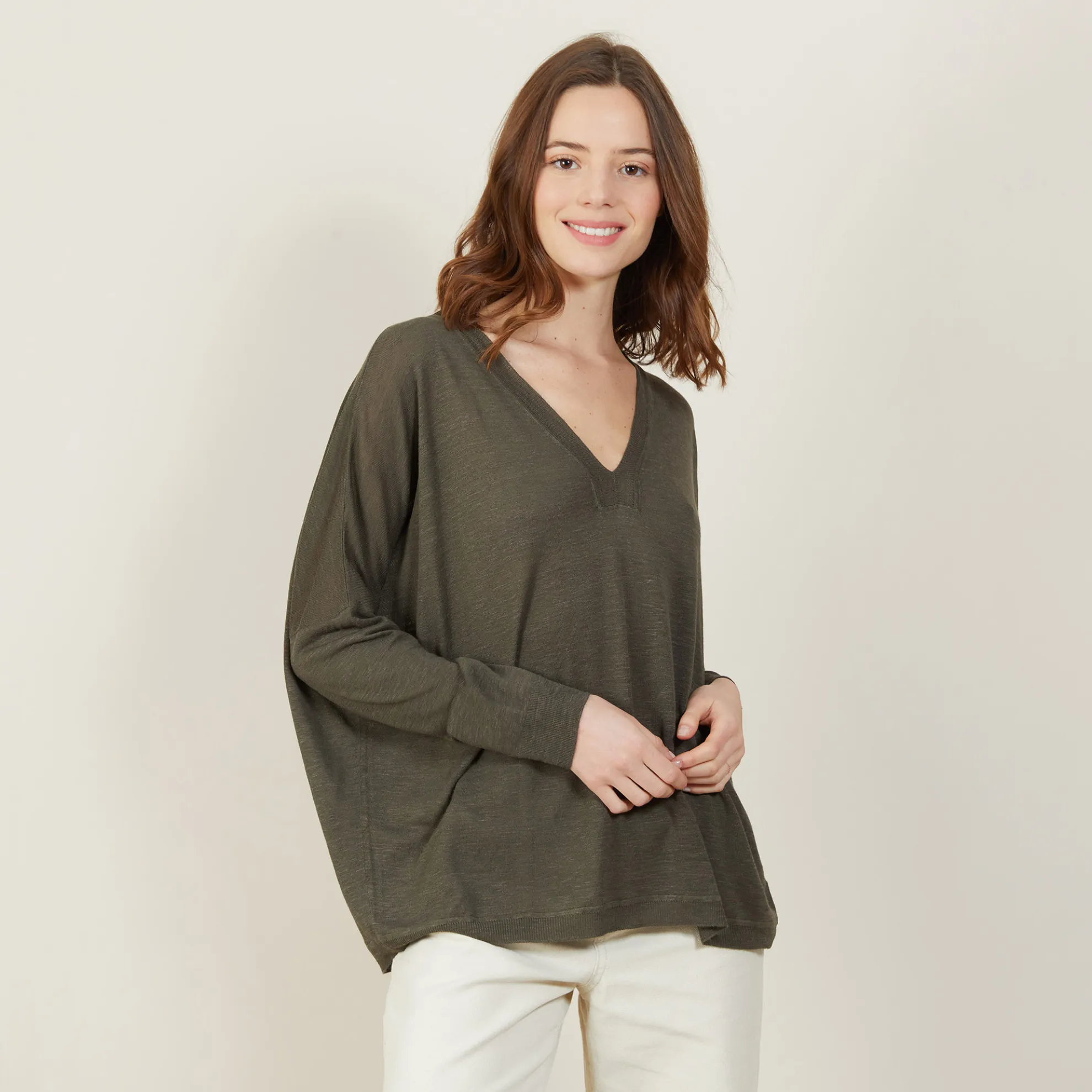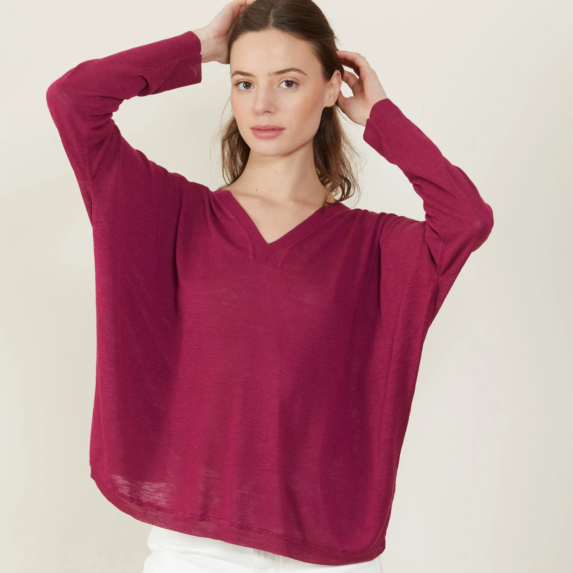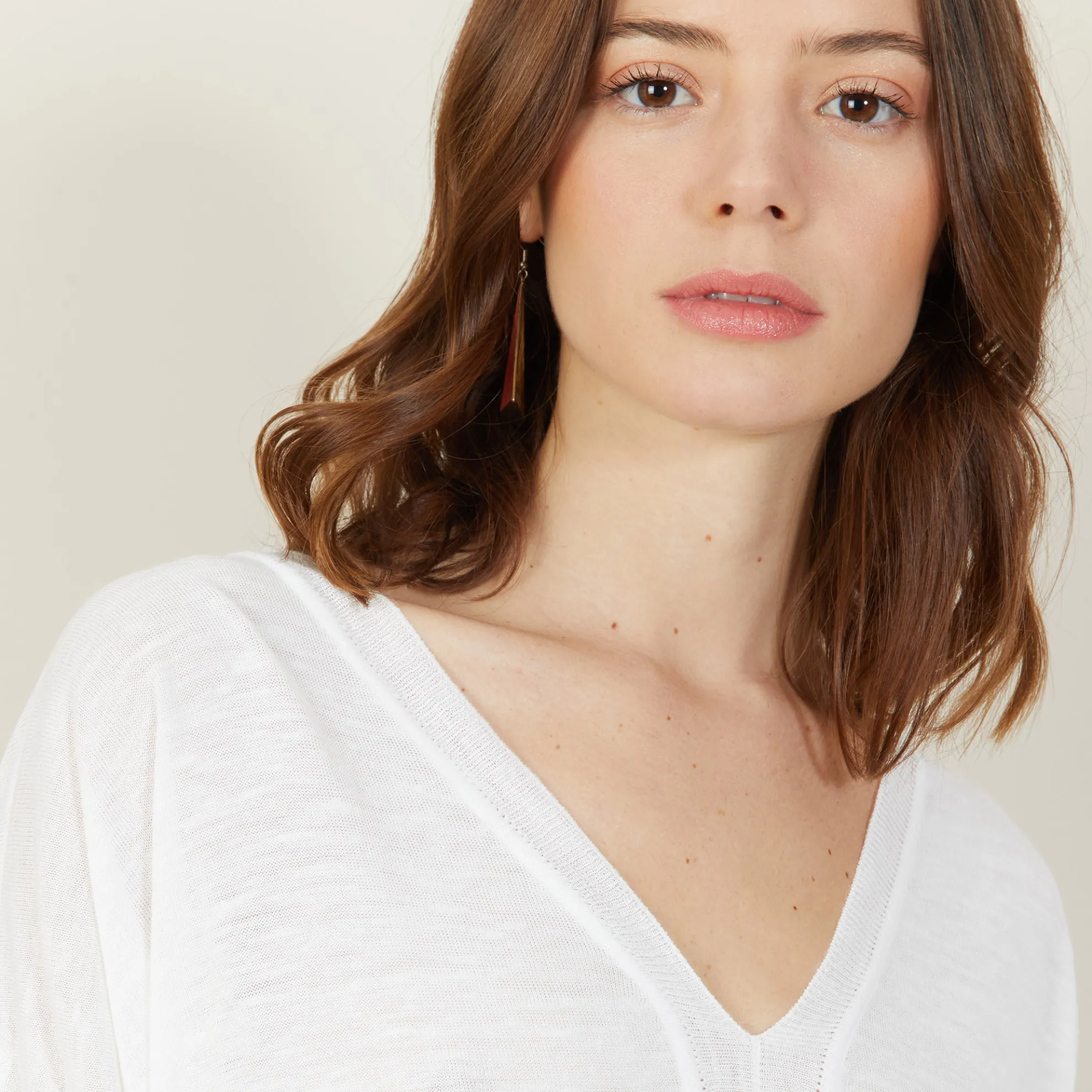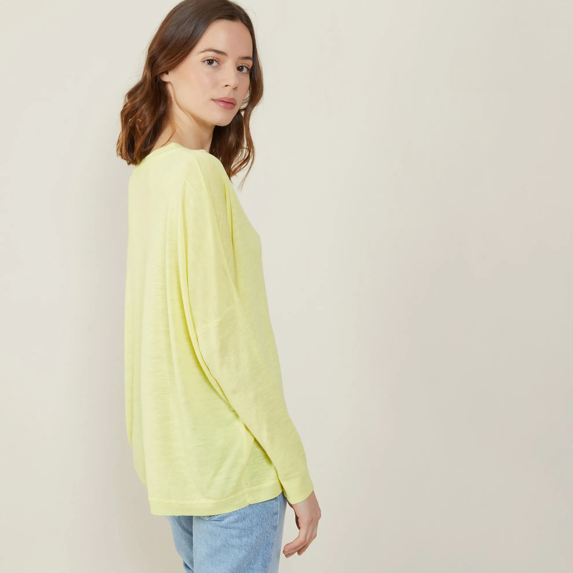 T-Shirt Manches Longues A Encolure En V Tricote En Point Jersey Au Portugal. Emmanchures Basses. Detail Au Niveau Du Col. Matiere Legere, Ideale A Porter En Periode De Forte Chaleur.