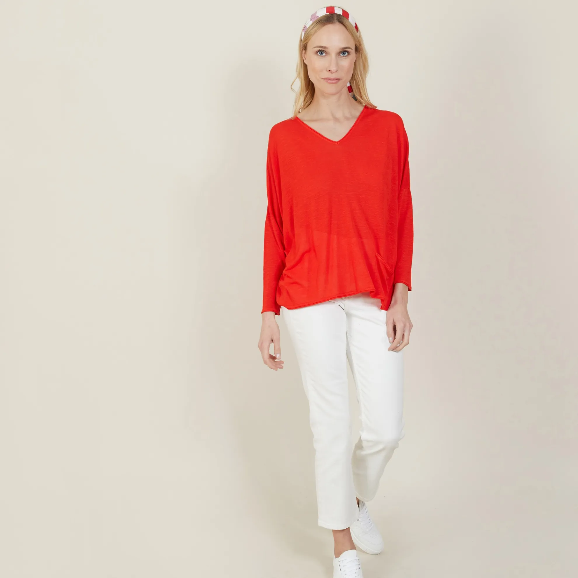 T-Shirt Manches Longues A Encolure En V Tricote En Point Jersey Au Portugal. Emmanchures Basses. Poche Plaquee Avant. Matiere Legere, Ideale A Porter En Periode De Forte Chaleur.