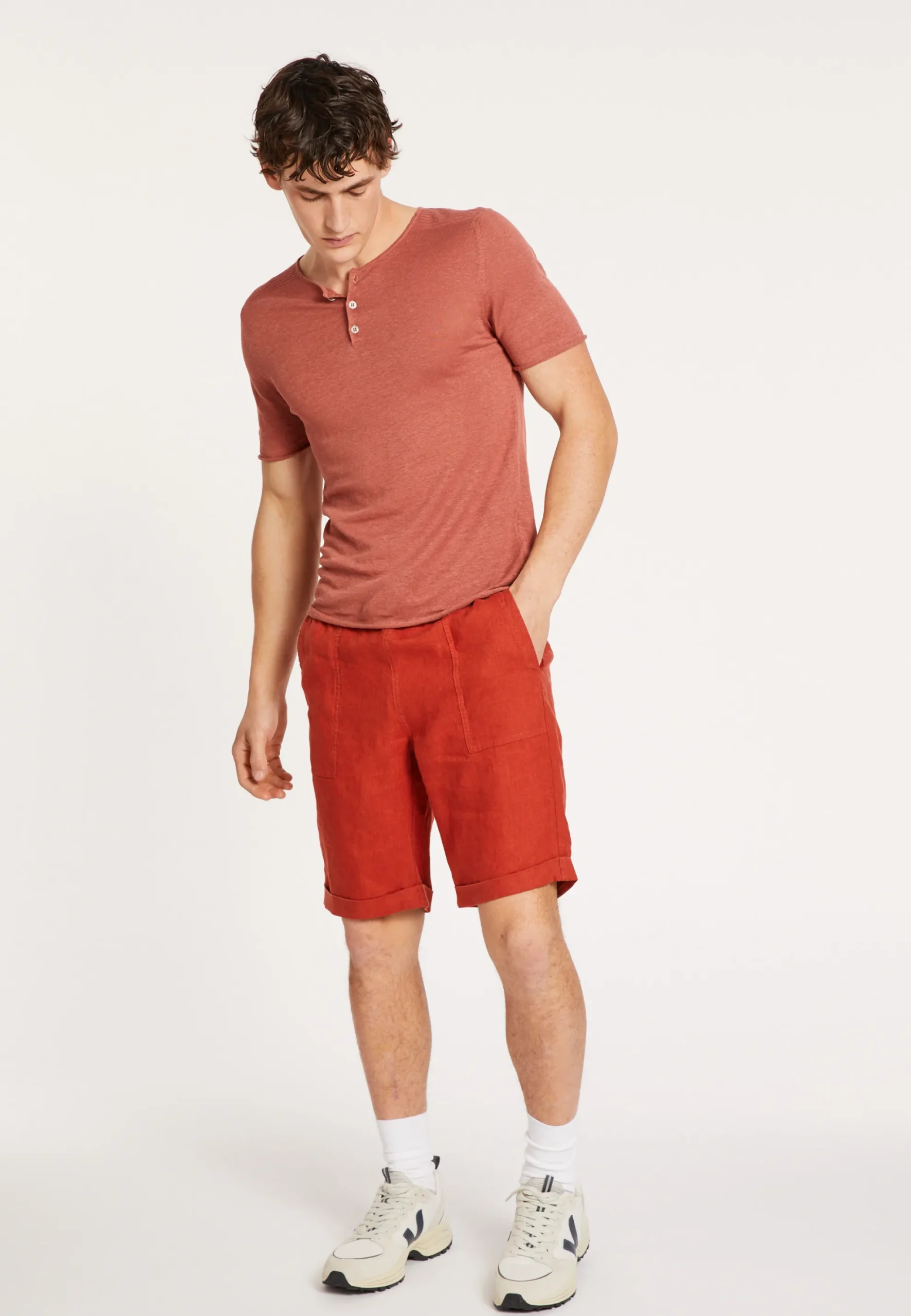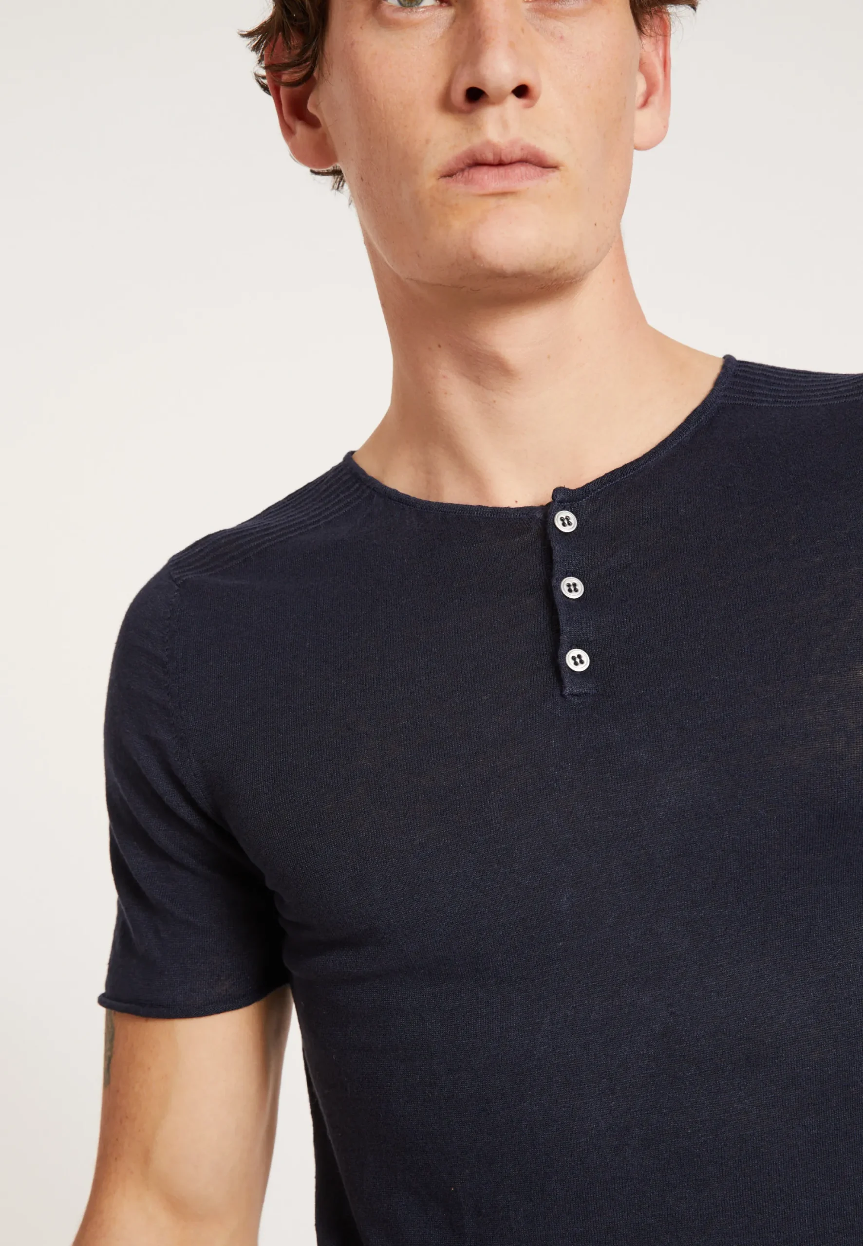 T-Shirt Col Tunisien Boutonne En Lin. Esprit Decontracte Avec Ce T-Shirt En 100% Lin, Tres Facile A Porter. Fines Cotes Sur Les Epaules. Finitions Roulottees Aux Manches Et En Bas Du T-Shirt.