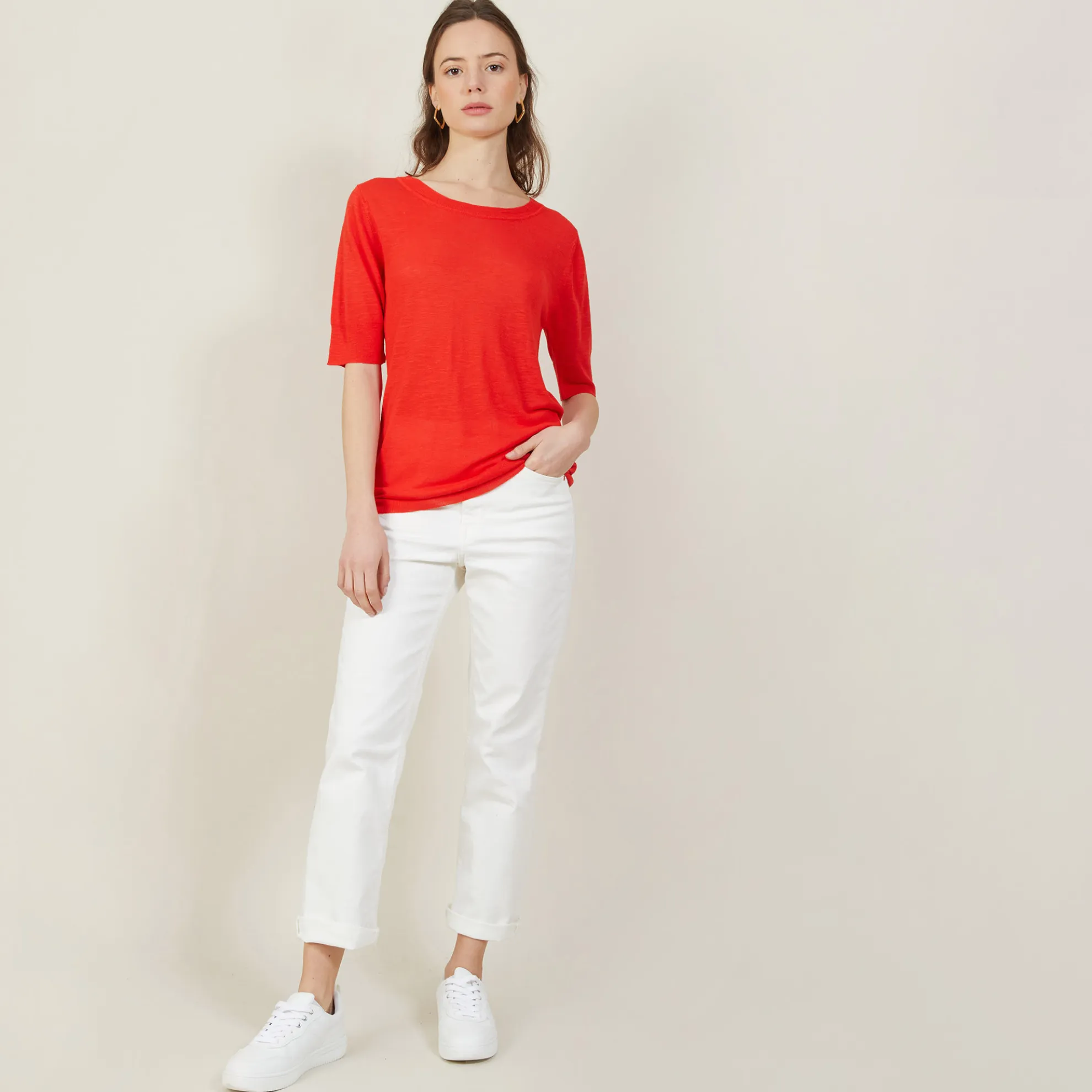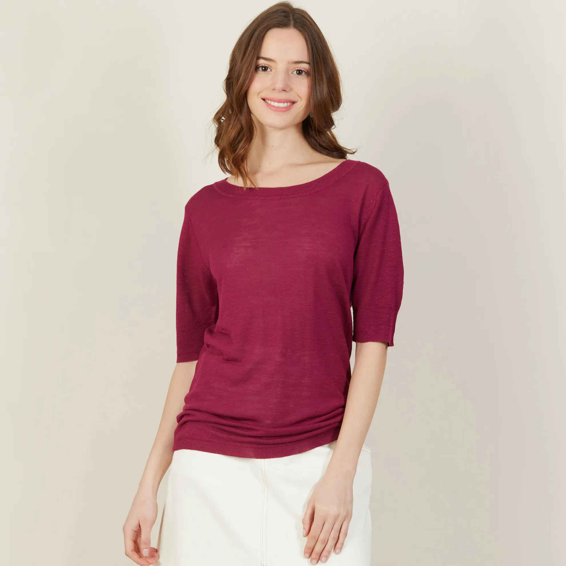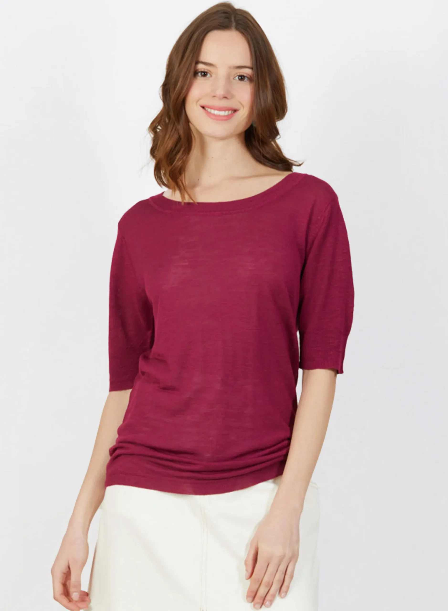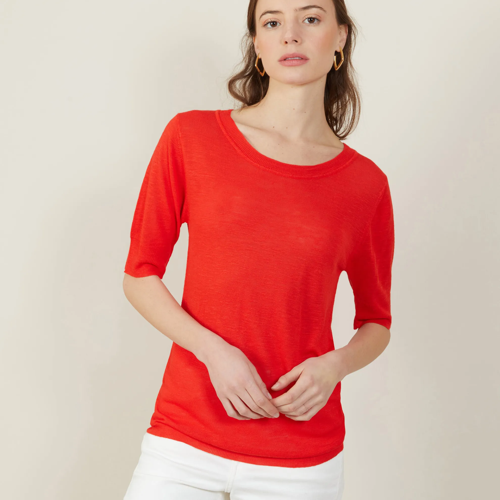 T-Shirt Encolure Ronde Tricote En Point Jersey Au Portugal. Manches Coudes. Coupe Droite. Matiere Legere, Ideale A Porter En Periode De Forte Chaleur.