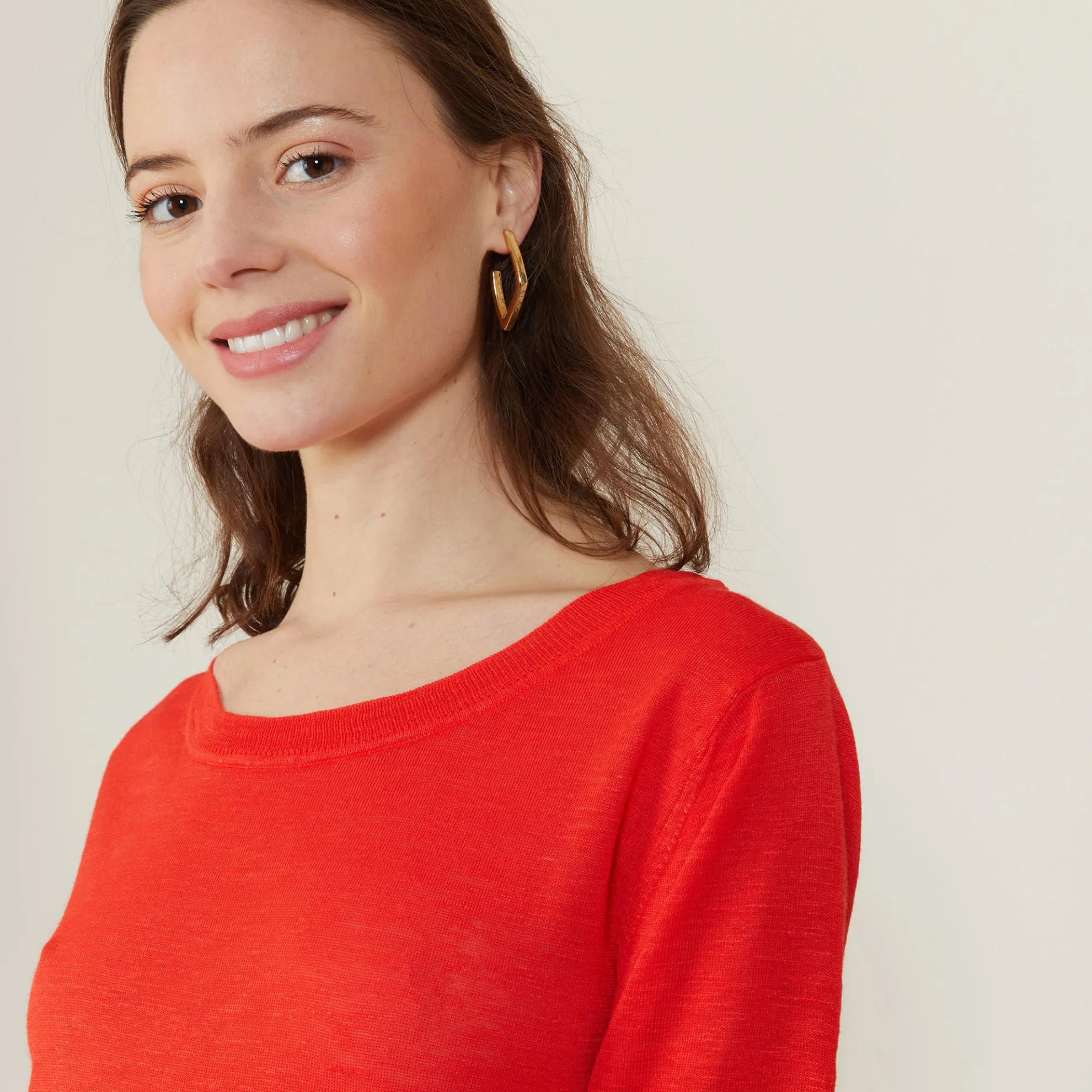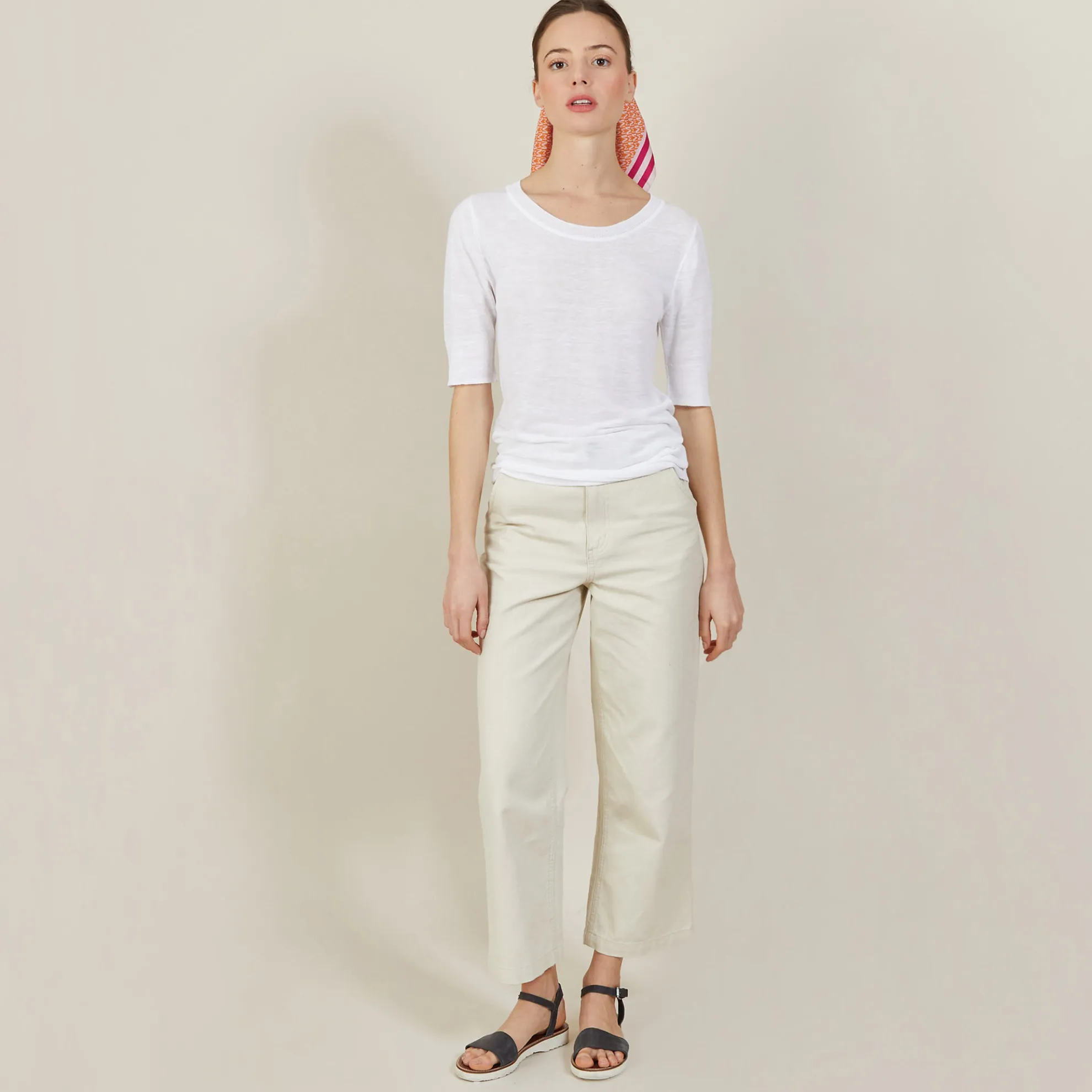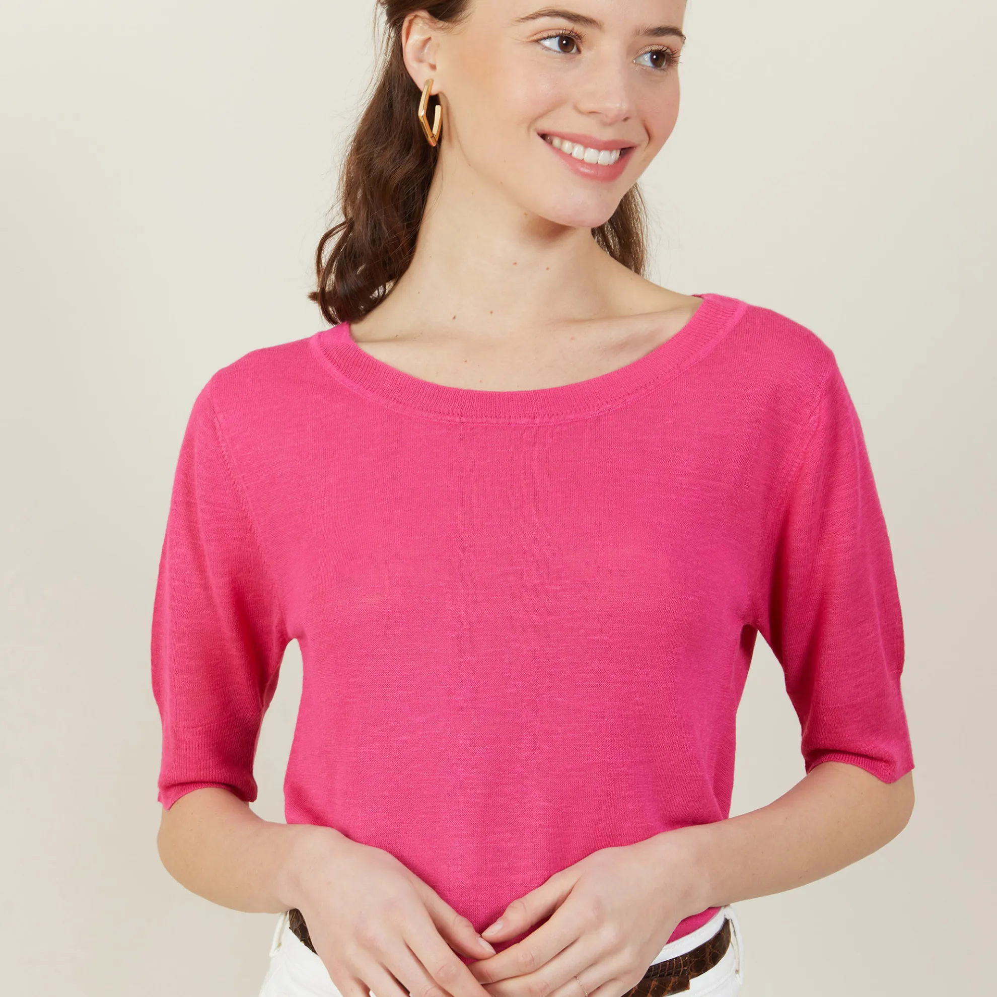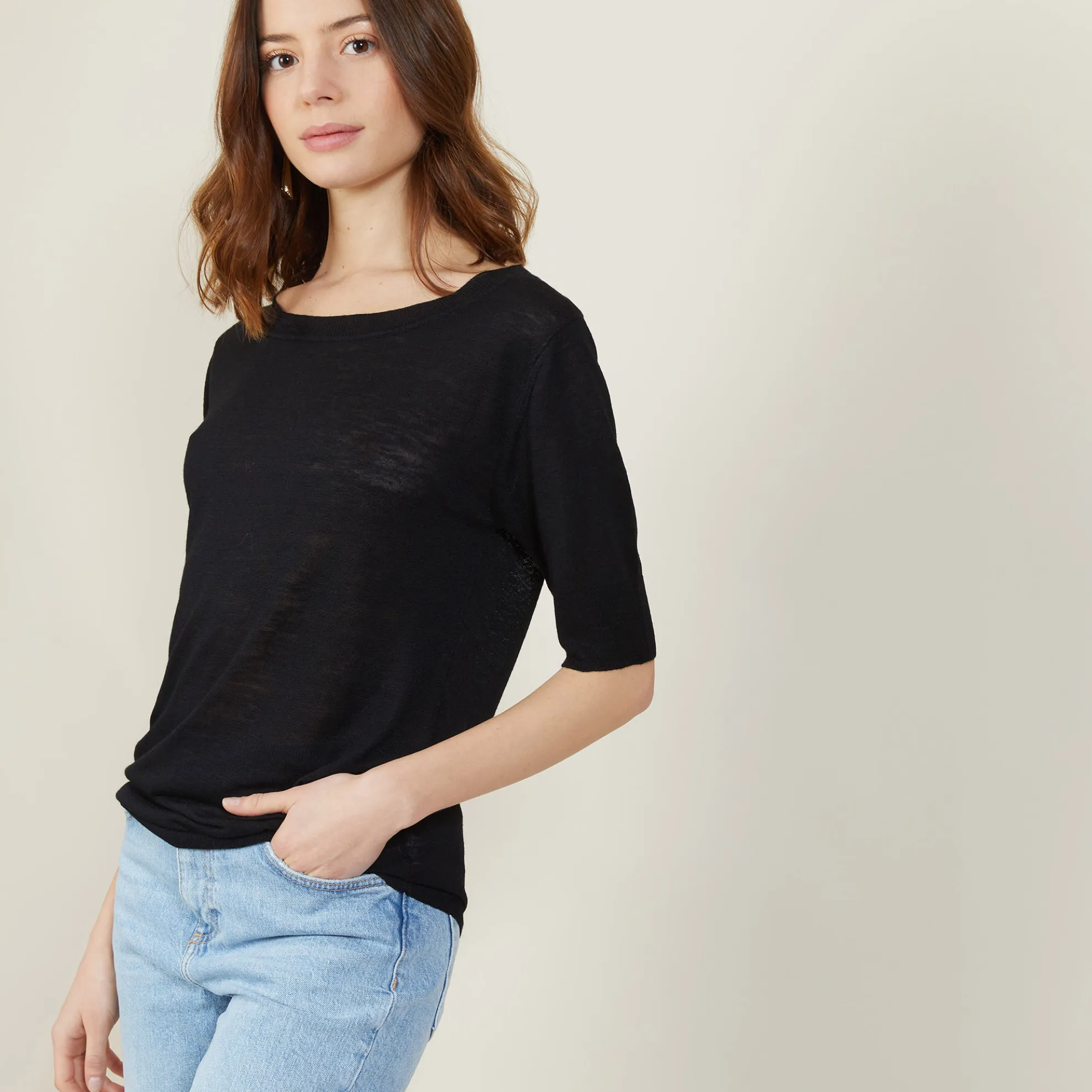 T-Shirt Encolure Ronde Tricote En Point Jersey Au Portugal. Manches Coudes. Coupe Droite. Matiere Legere, Ideale A Porter En Periode De Forte Chaleur.