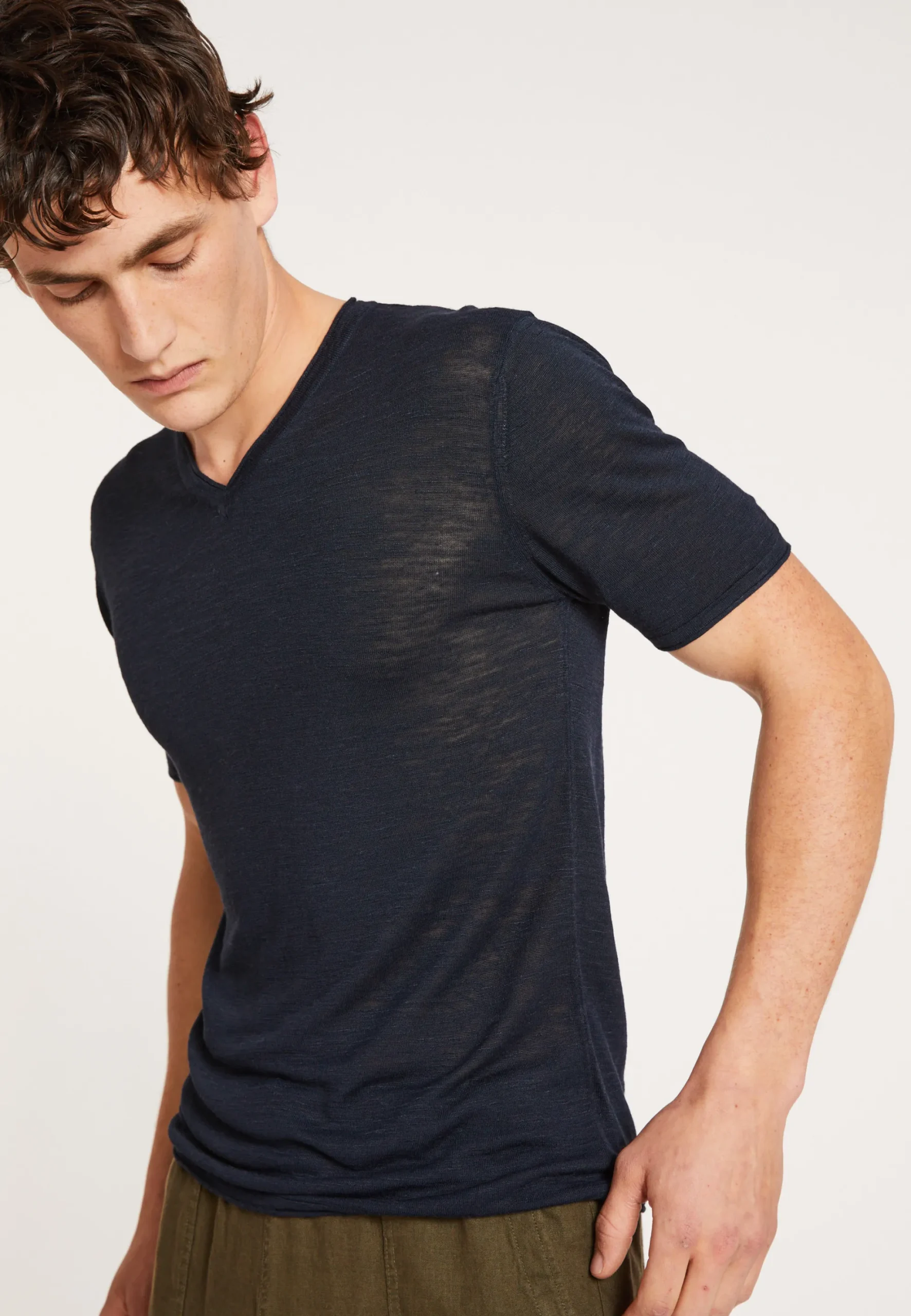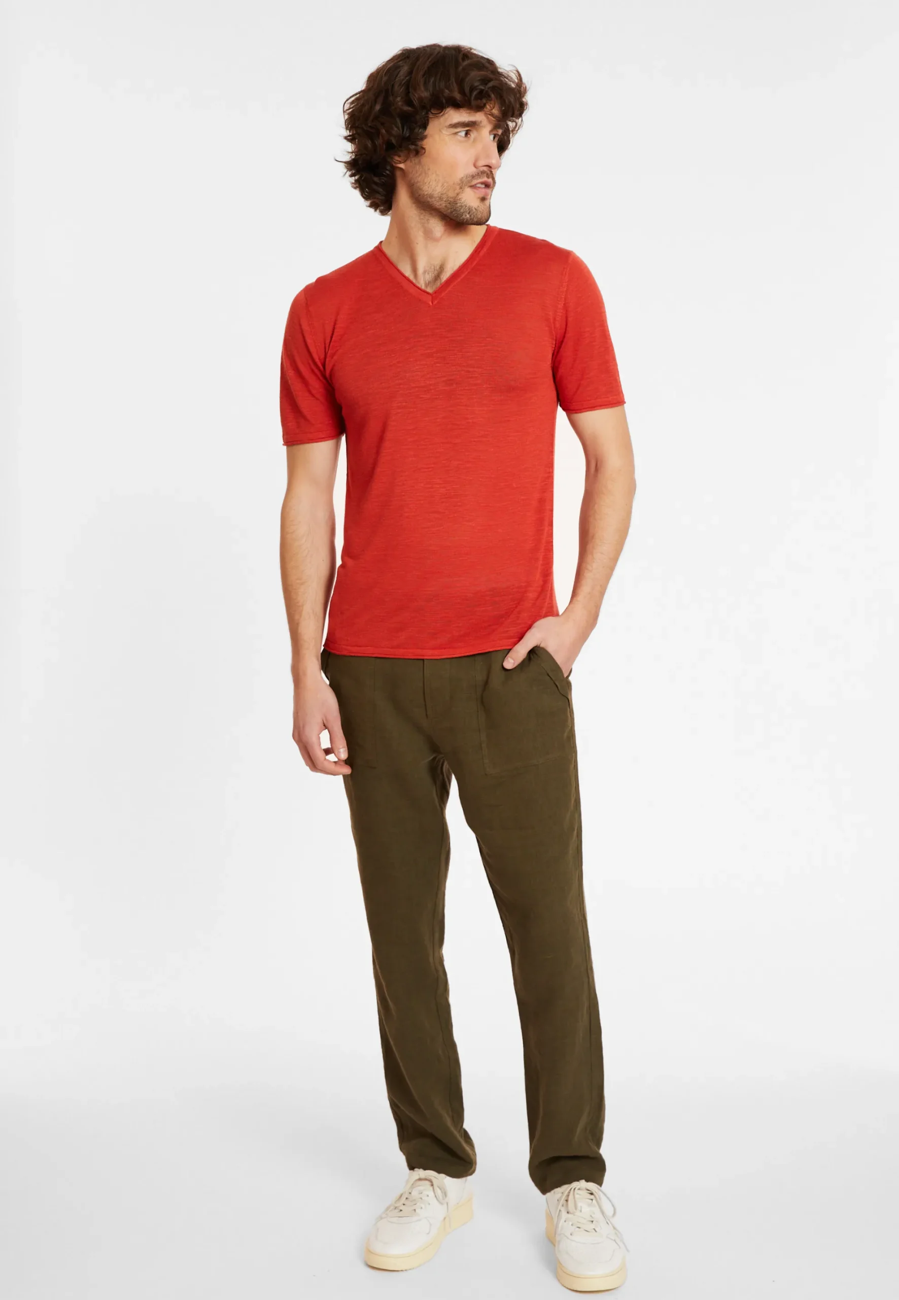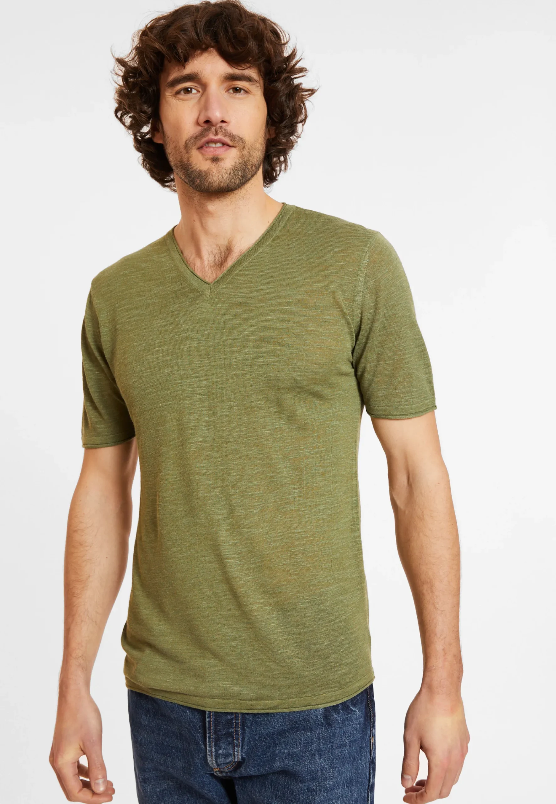 T-Shirt A Manches Courtes, Col V En Lin Flamme Pour Homme. Un T-Shirt Leger Et Tres Agreable A Porter Pendant La Periode Estivale. Ce Modele A Coupe Droite Non Moulante Possede Des Finitions Roulees Sur Son Col Pour Un Effet Moderne. Dans Le Meme Style, Vous Allez Apprecier Ce Meme Modele Mais En Version Col Rond : Renaud
