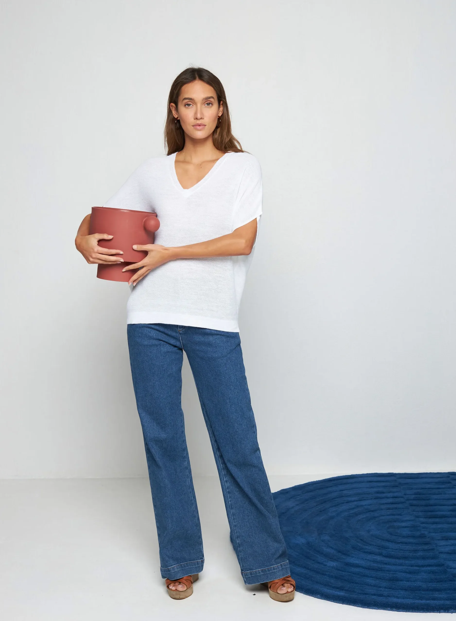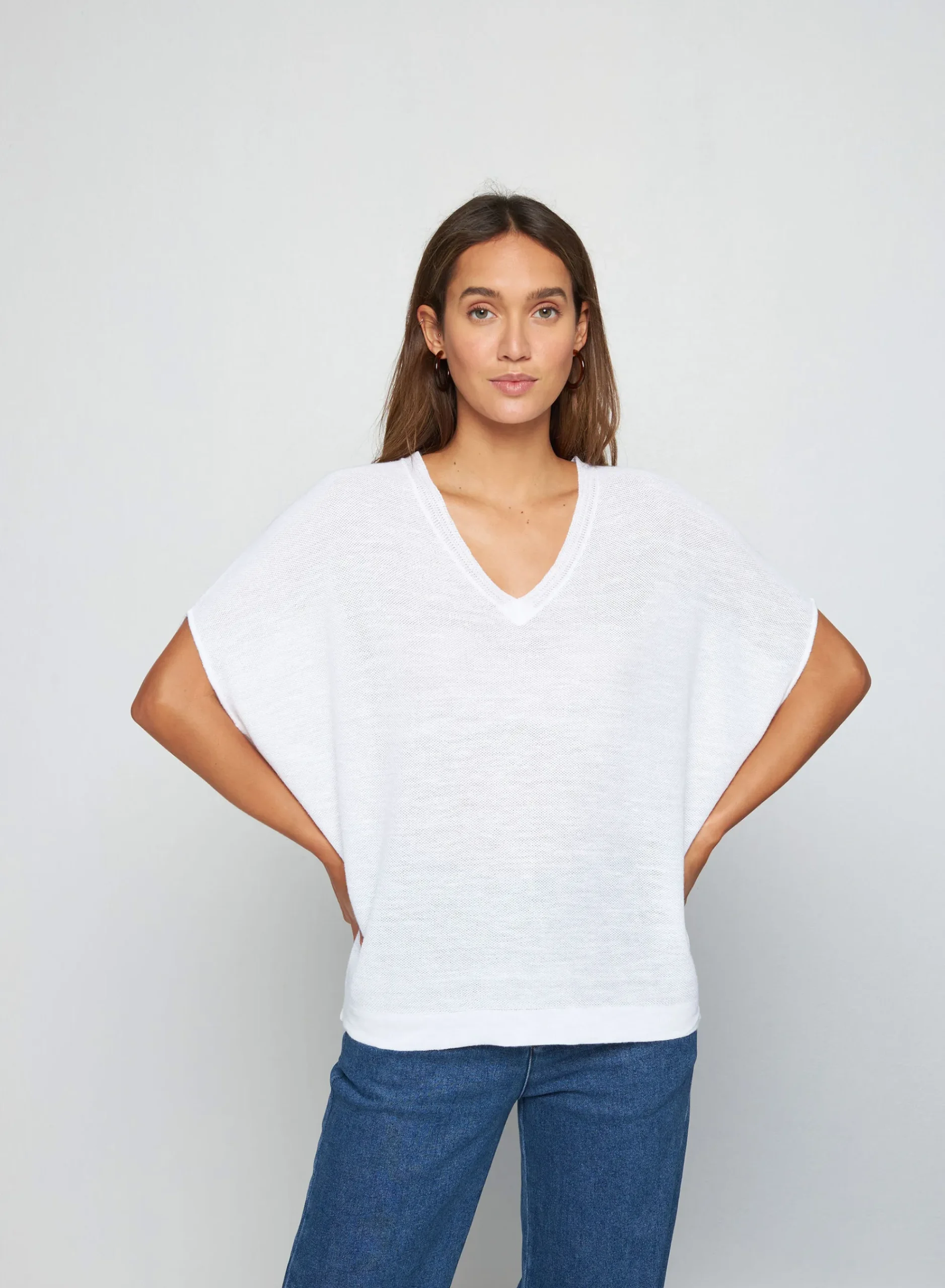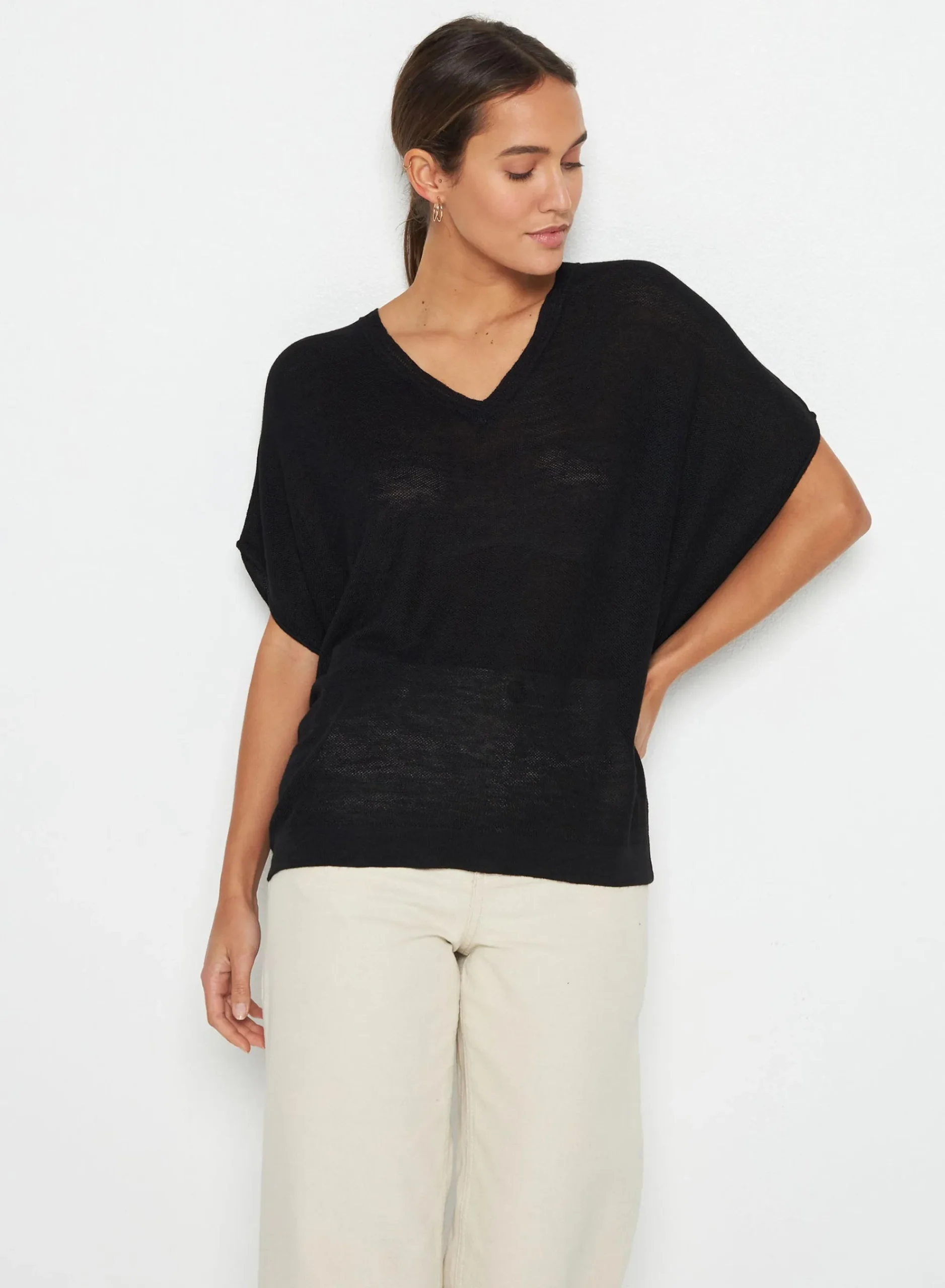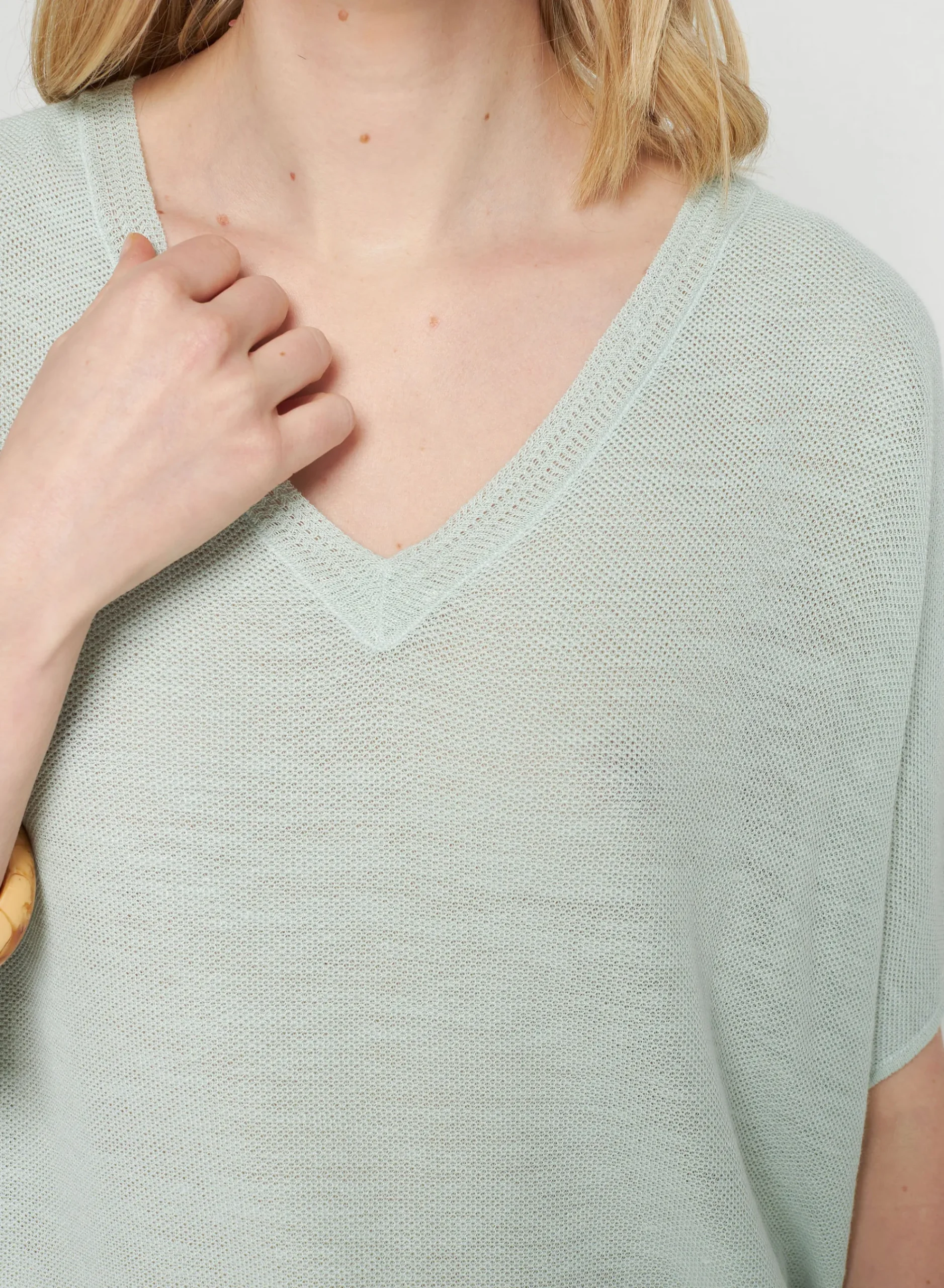 T-Shirt En Col V Manches Courtes Et Chauves-Souris Tricote Dans Nos Ateliers En Lin Flamme. Optez Pour Le Confort De Notre Modele Tarra, Avec Ses Manches Chauves-Souris Pour Vous Apporter Un Confort Optimum. Notre Lin Flamme Fluide Et Leger Est Ideal A Porter En Periode De Fortes Chaleurs.