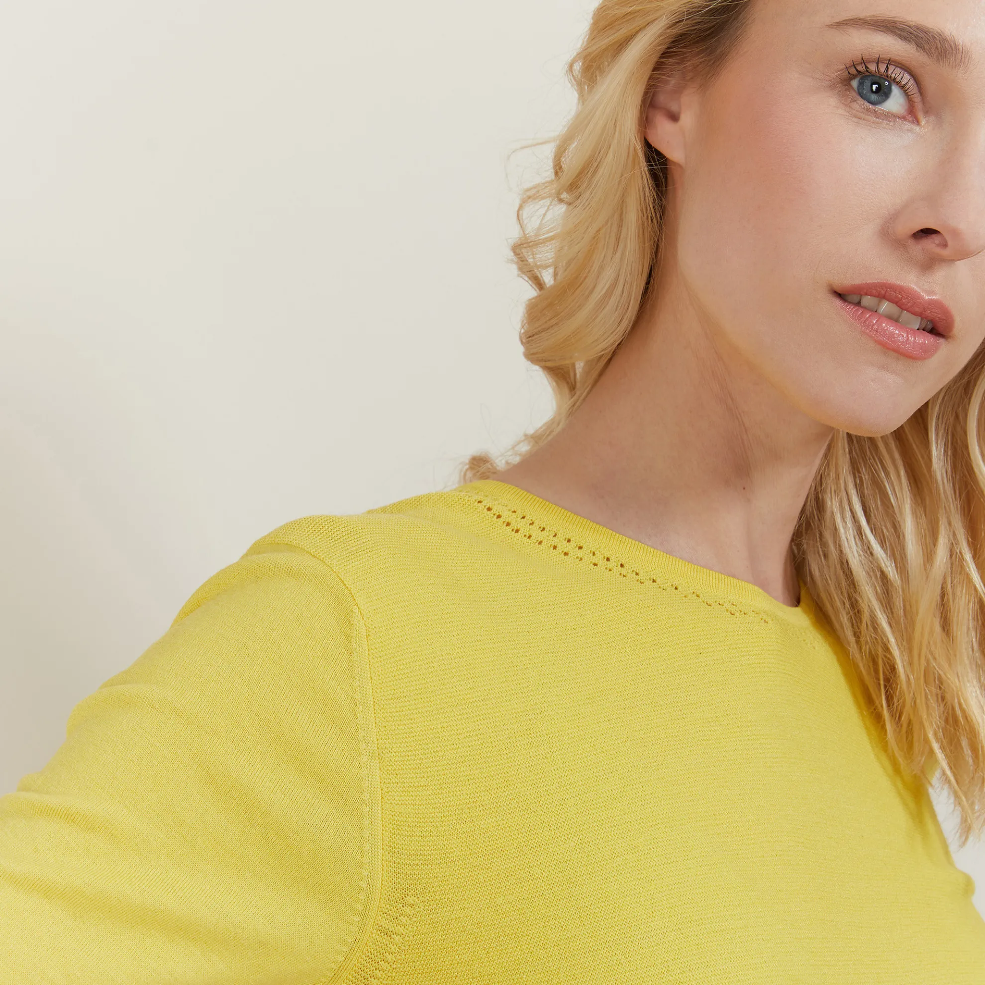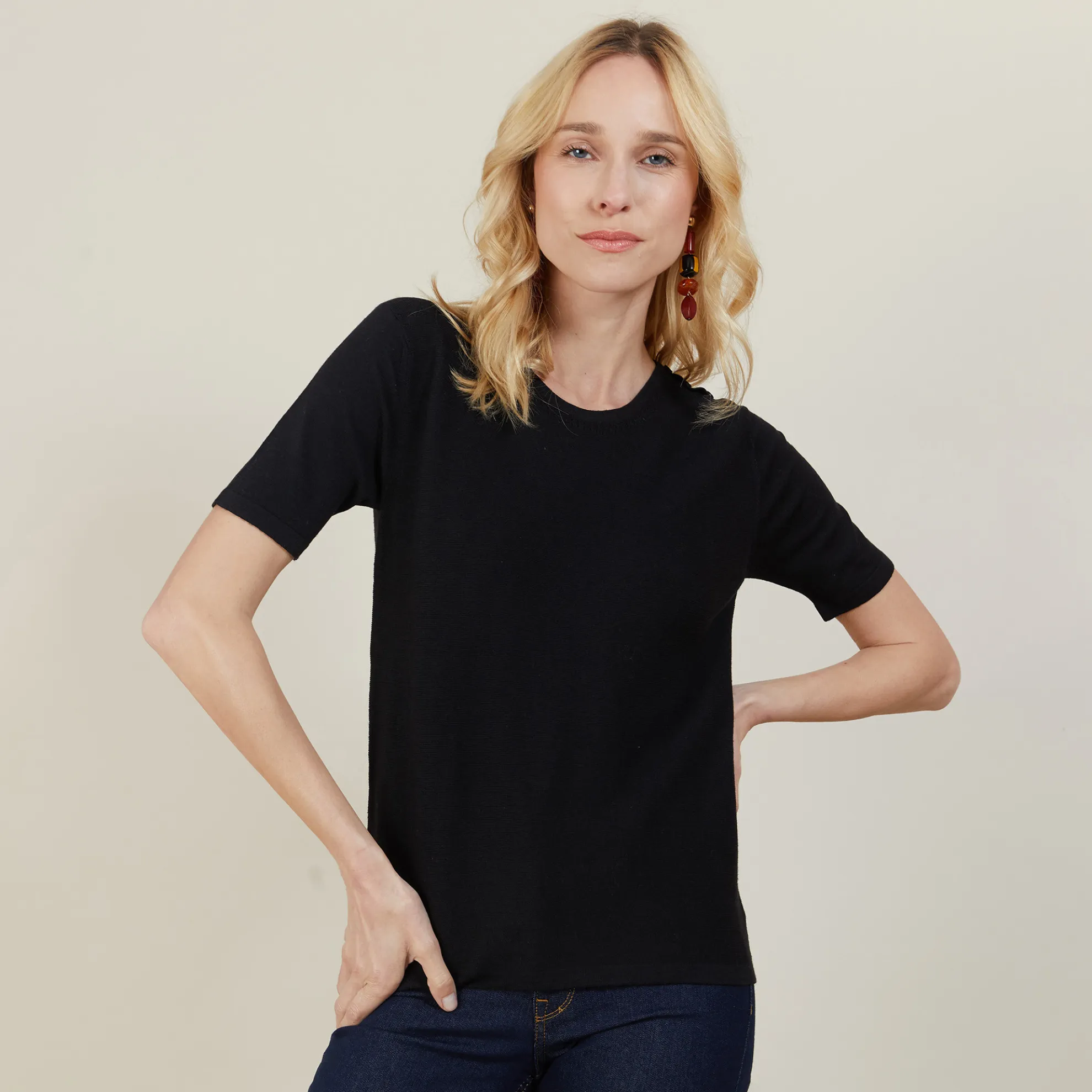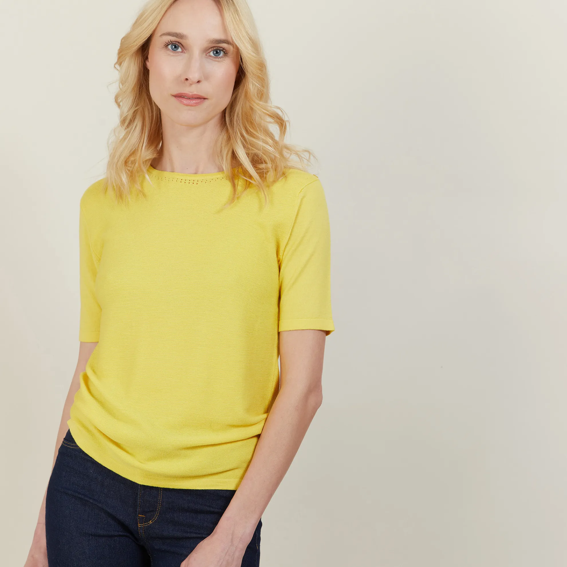 Top Femme En Laine Et Soie Extremement Doux Et Fin Grace A Un Point Mousse. Au Niveau Du Col Rond, La Maille Est Ajouree Pour Un Effet Tres Raffine. Le Melange Laine Et Soie Fait Partie Des Matieres Les Plus Agreables A Porter En Toute Saison. 4 Boutons Cousus Sur Epaule Gauche.