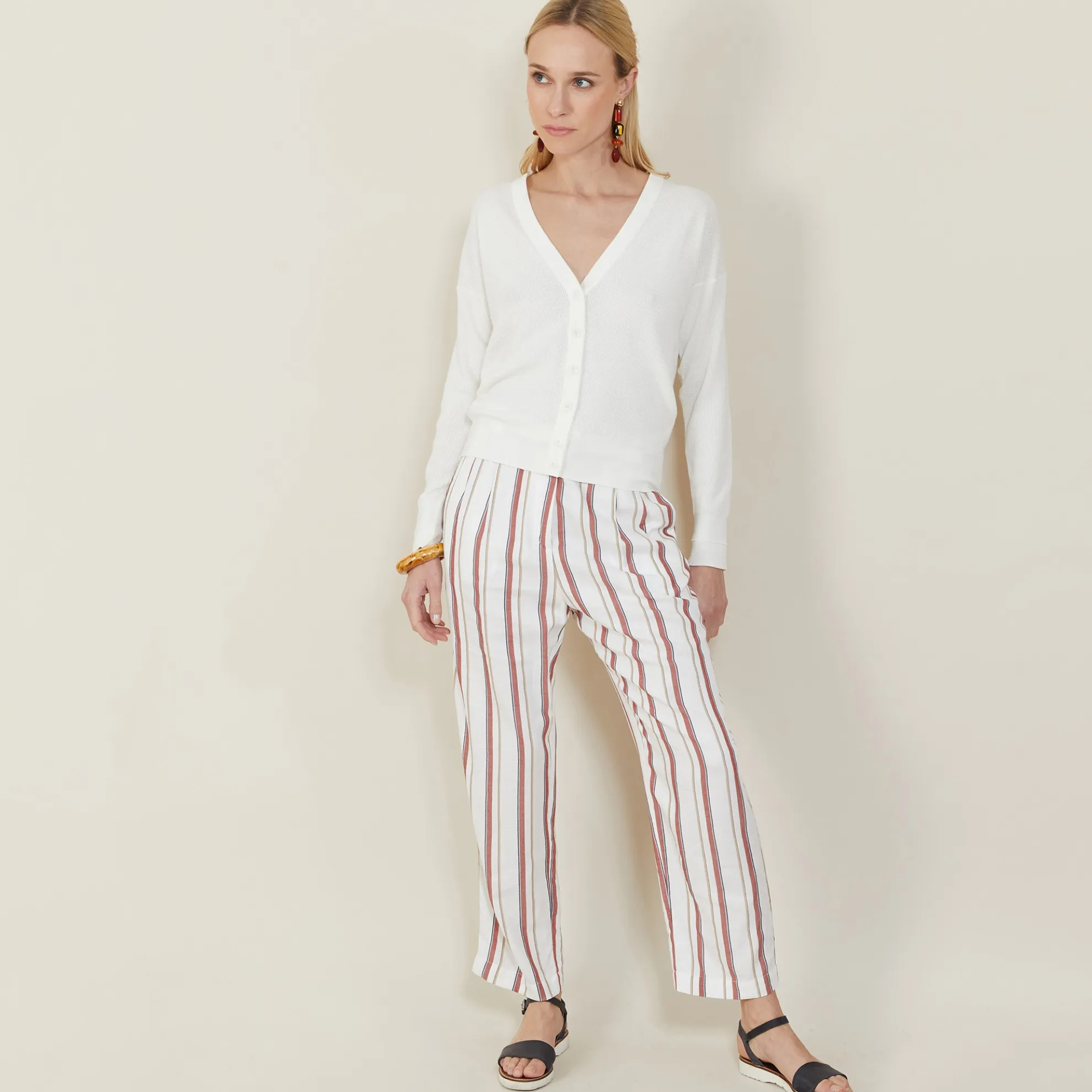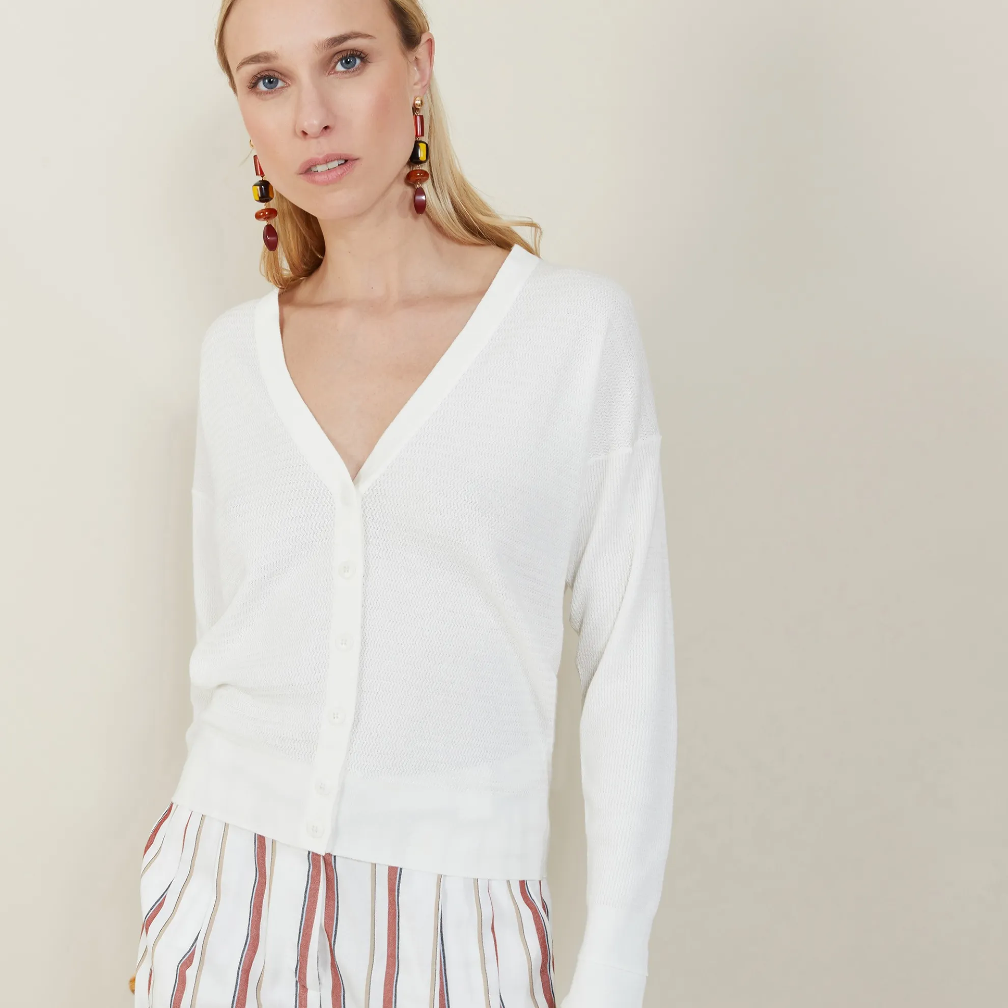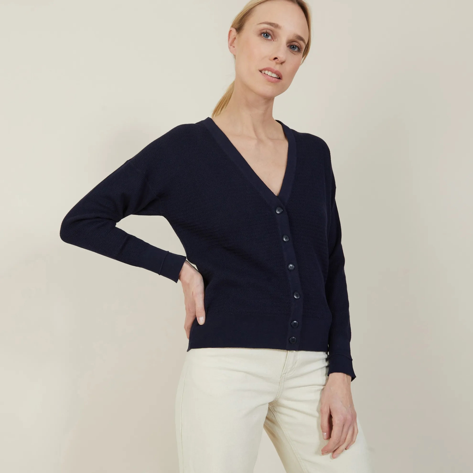 Cardigan En Maille Fine A Jeux De Points Fantaisie. Col V, Fermeture Par Boutons. Maille Souple.