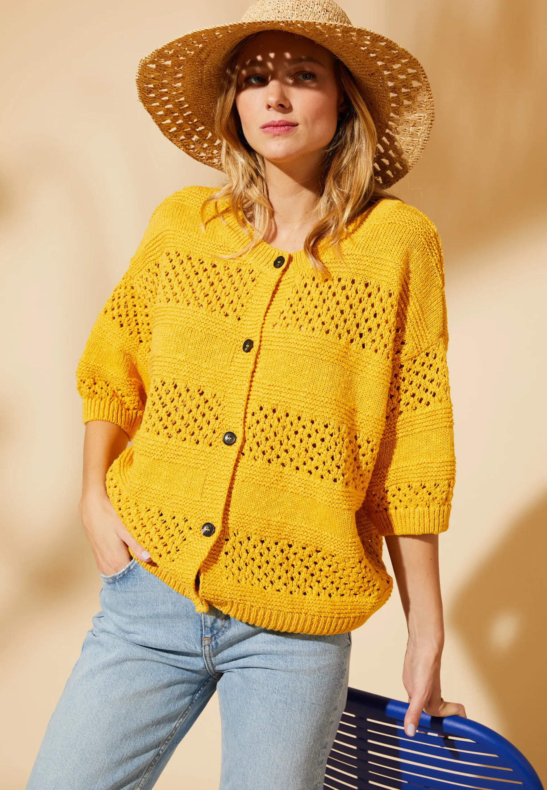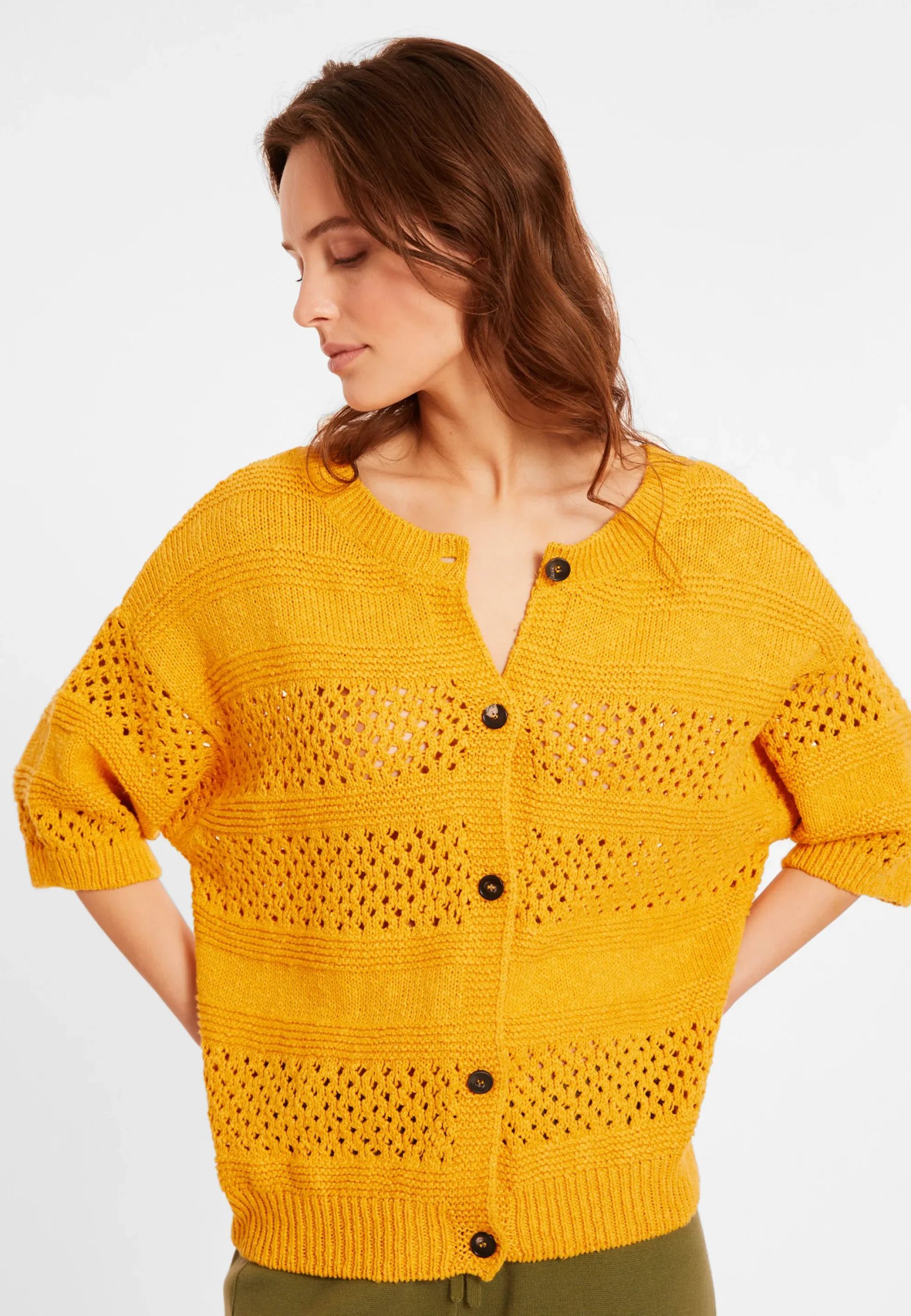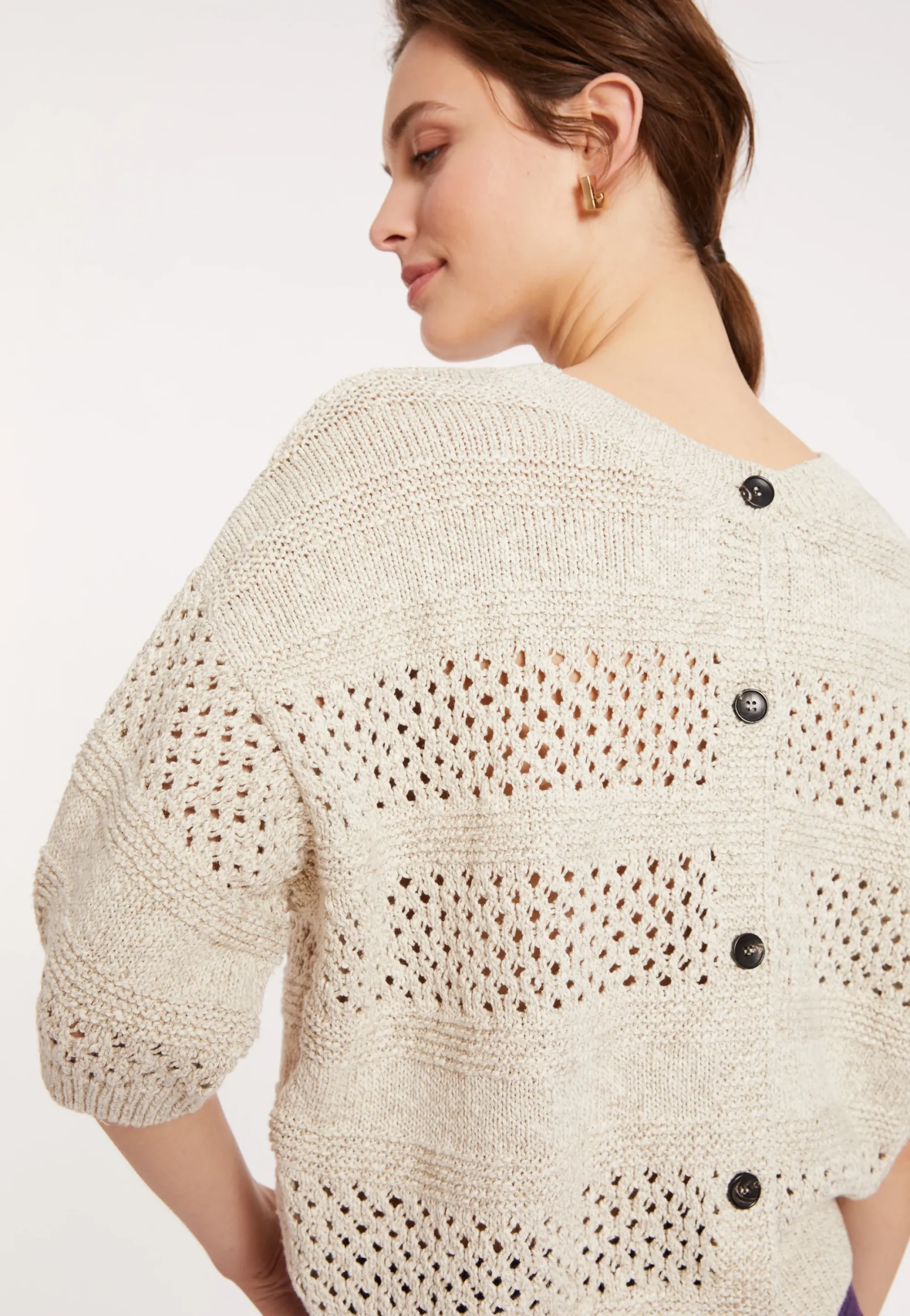 Tricote En Europe A Partir D’Un Melange De Coton Et De Lin De Haute Qualite, Ce Gilet Est A La Fois Leger Et Respirant. Avec Son Design Ajoure Et Sa Coupe Ample, Il Peut Etre Porte Comme Un Pull Ou Comme Une Veste Legere.