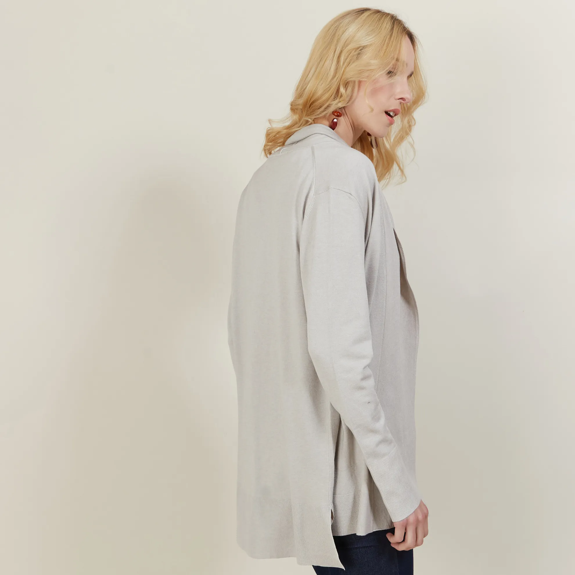 Long Gilet Pour Femme En Laine Et Viscose Tricote Au Portugal. Col Chale, Manches Longues. Deux Poches Plaquees. Deux Fentes De Chaque Cote Du Gilet. Modele Ample.