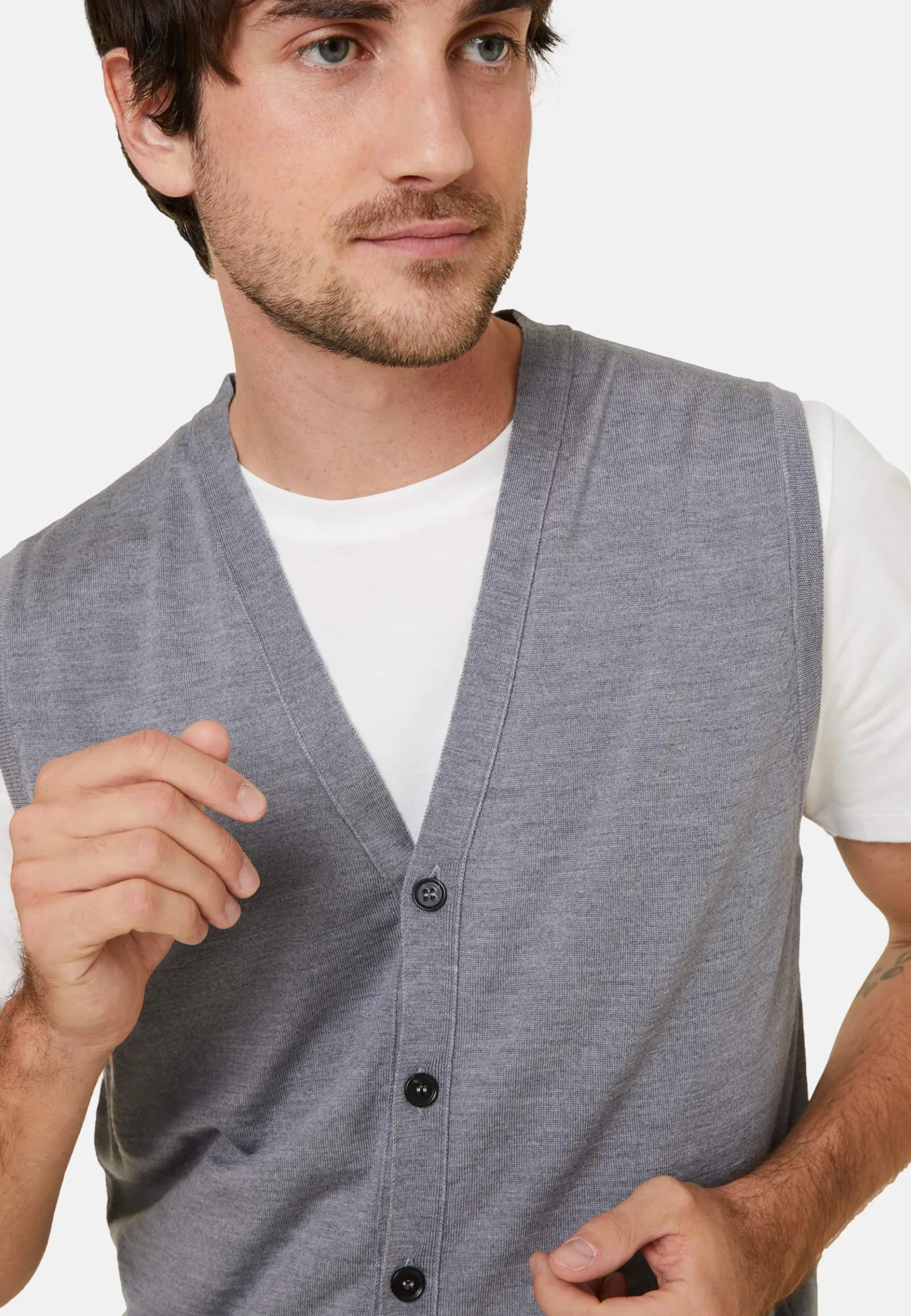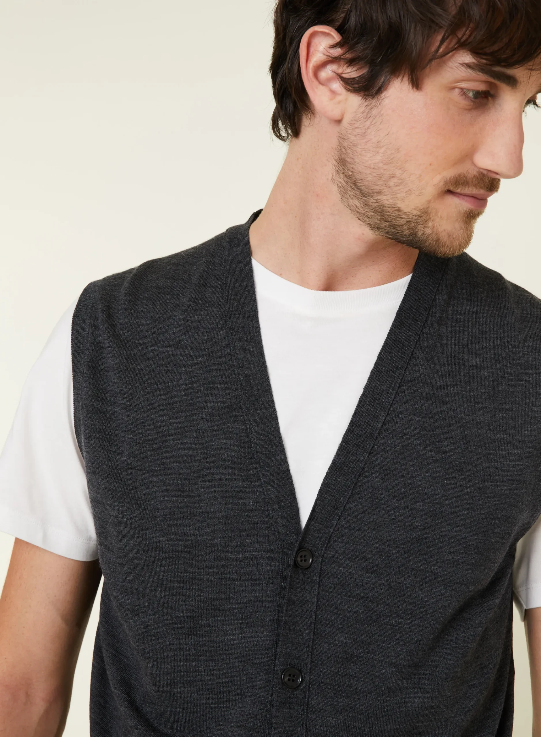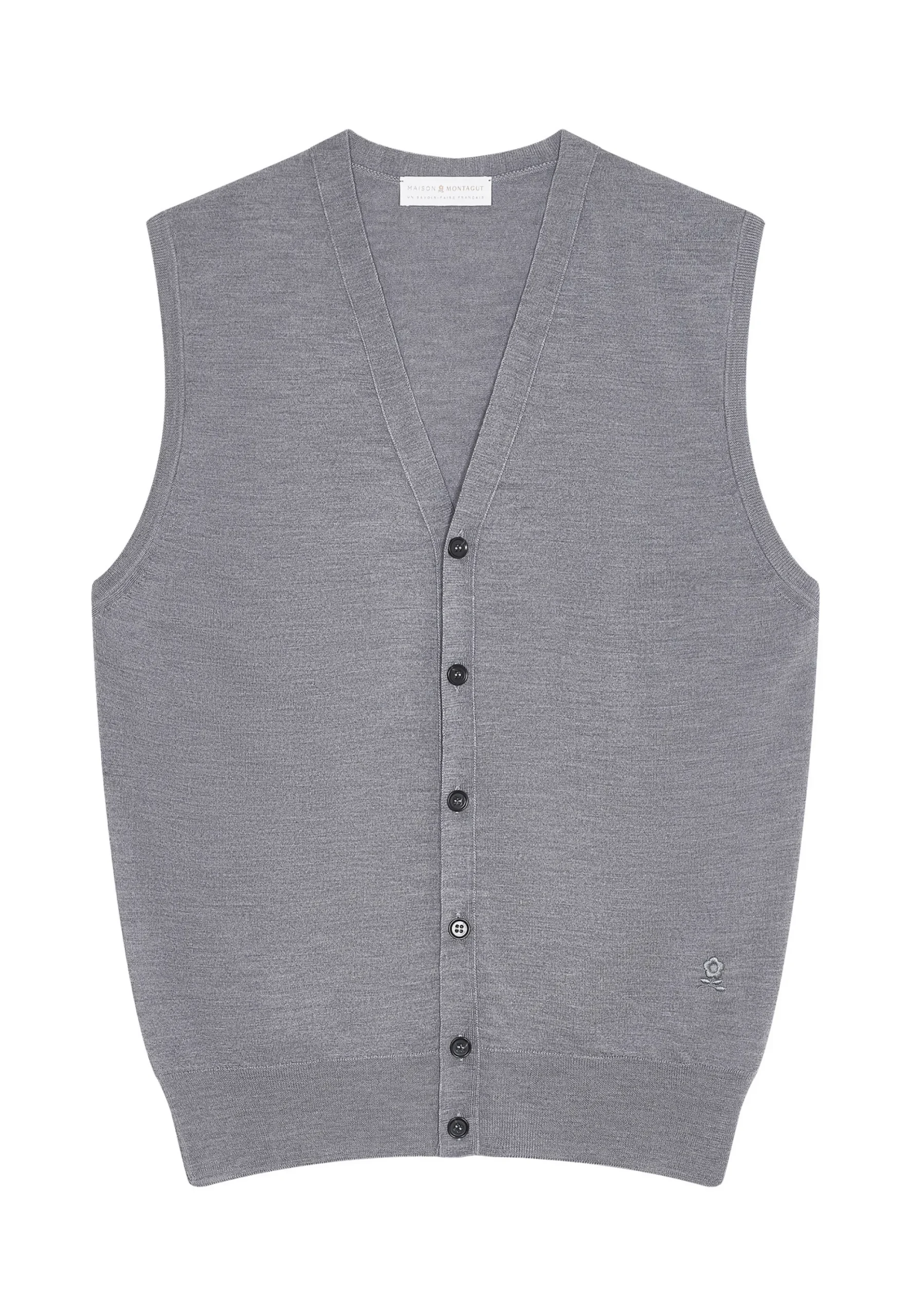 Ce Gilet Sans Manches A Encolure V Tricote En Point Jersey En Laine Merinos Dans Nos Ateliers Reste Une Piece Intemporelle De La Collection Maison Montagut. Notre Modele Se Boutonne Sur Toute Sa Longueur. Ernardo Saura Vous Accompagner Avec Style En Toutes Circonstances. En Bas De Modele Se Presente Le Logo Tricote En Ton Sur Ton. Nous Vous Conseillons De Choisir Votre Taille Habituelle.