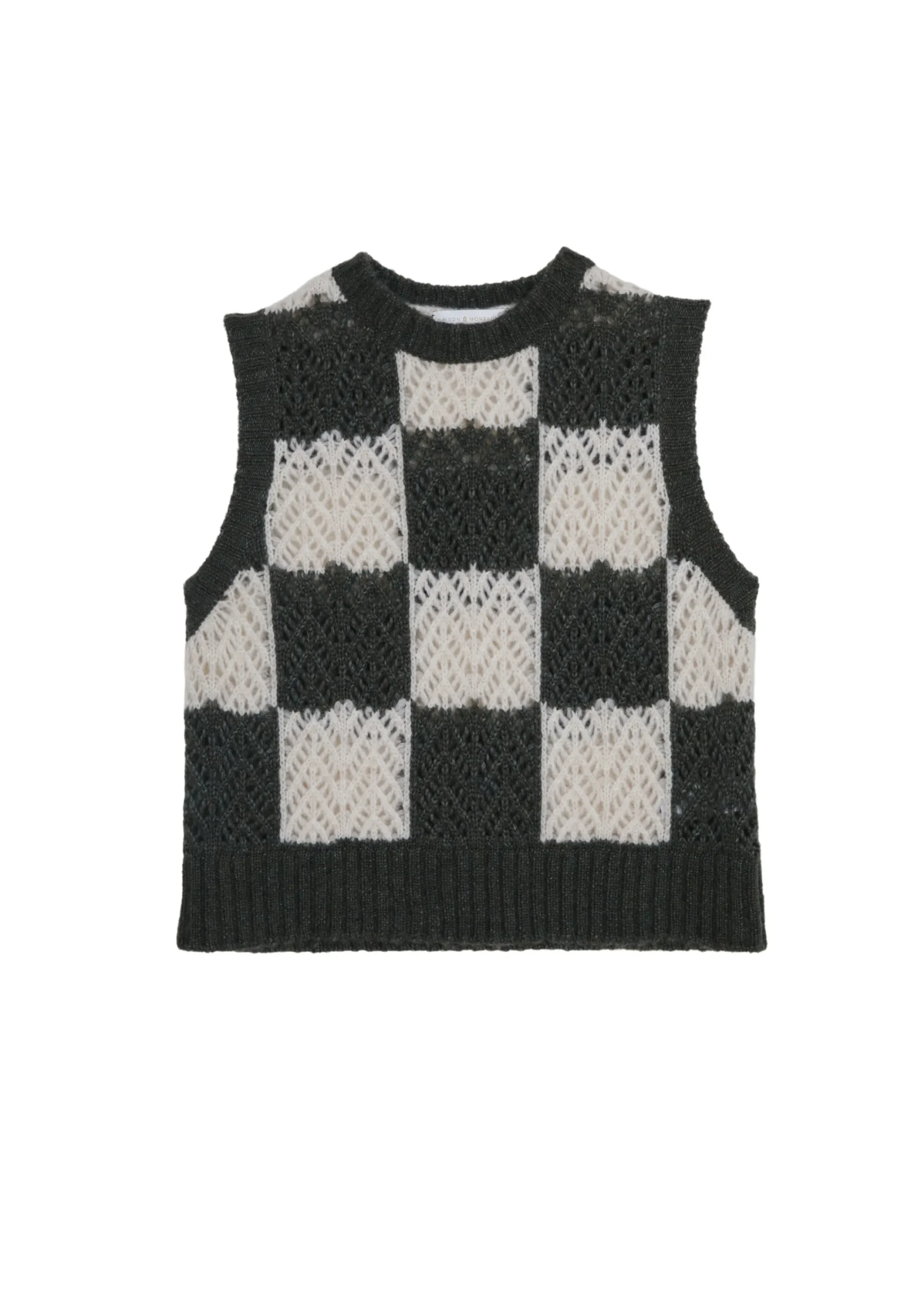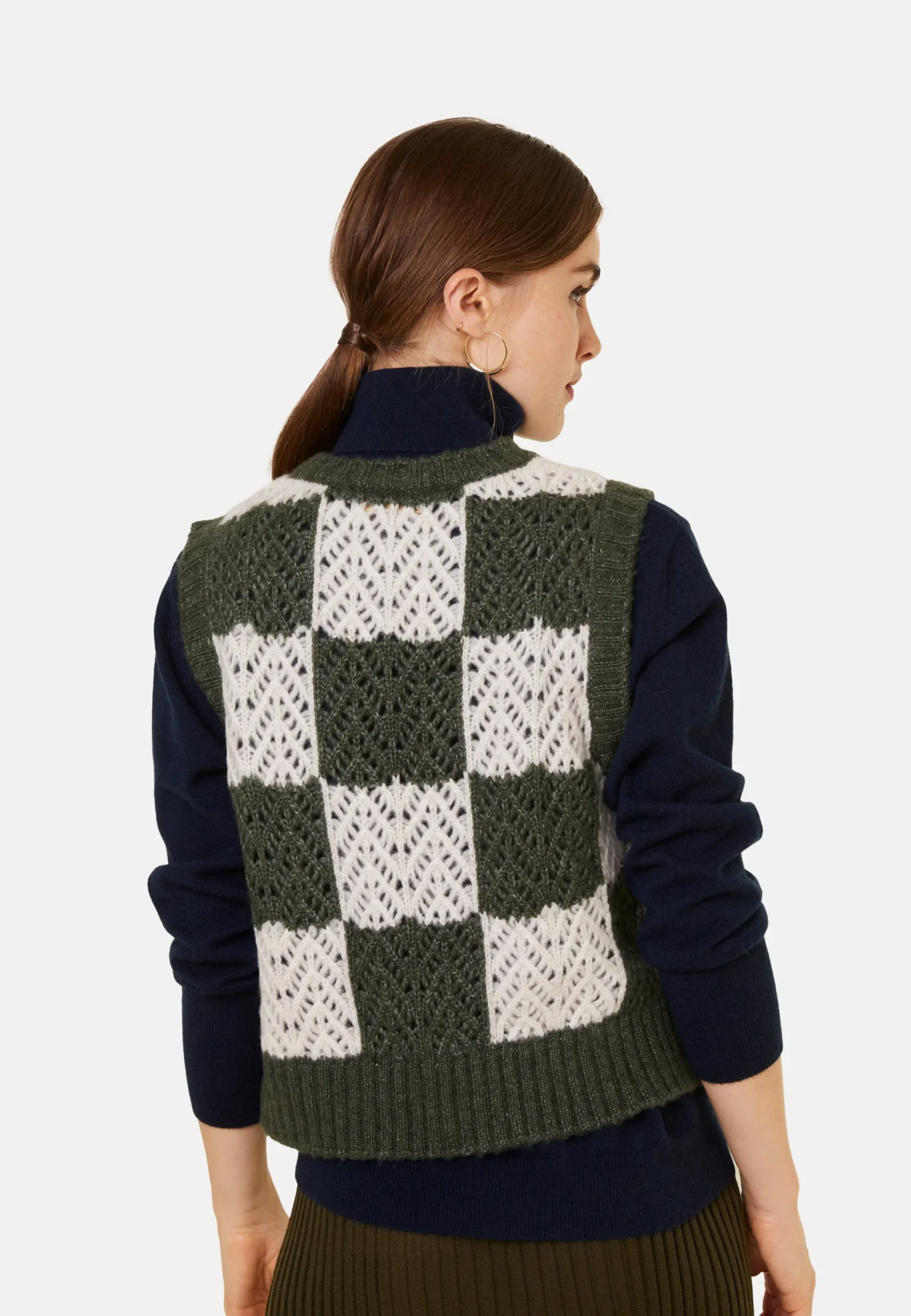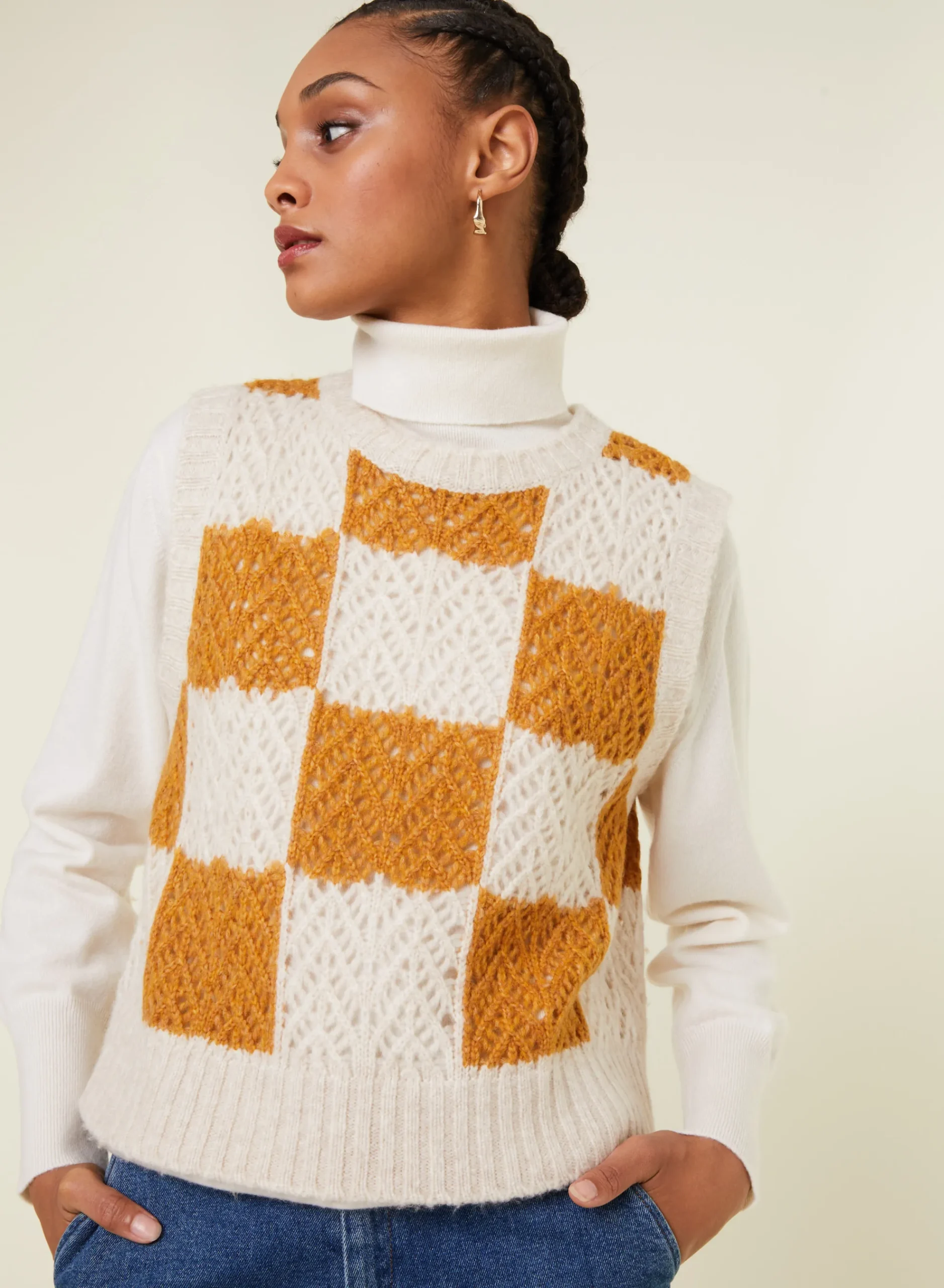 Petit Pull Indemodable Ajoure En Motifs Damier Pour Parfaire Votre Look. Tricote En Laine Merinos Et Polyamide, Ce Petit Pull Sans Manches Ajoutera Une Touche Graphique Et Elegante A Votre Tenue. Associez Ce Modele A Notrecol Roule Anabelle. Un Modele Unique Aux Couleurs D’Automne Qui Se Glissera Parfaitement Dans Votre Vestiaire. Nous Vous Conseillons De Choisir Votre Taille Habituelle.