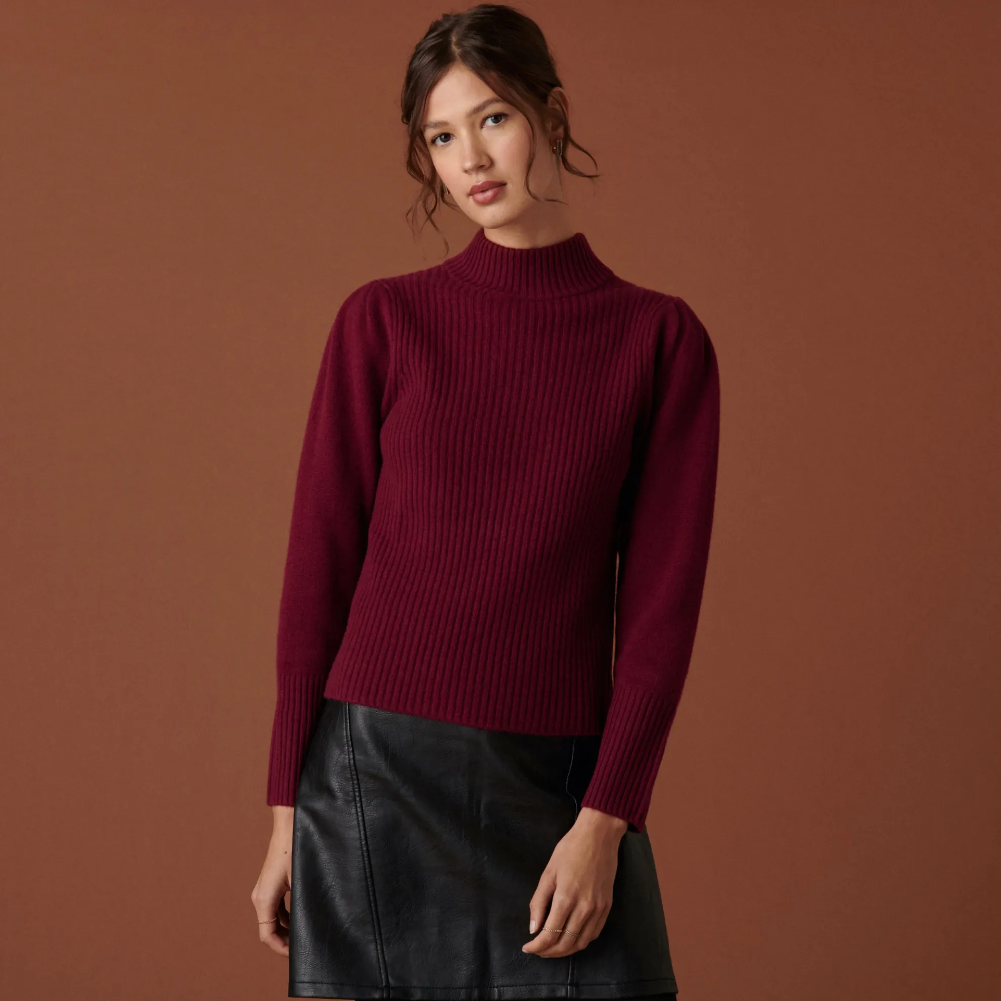 Pull Col Montant En Maille Cotelee Tricote En Cachemire 4 Fils. Manches Ballons, Coupe Droite. Finitions Bords Cotes.