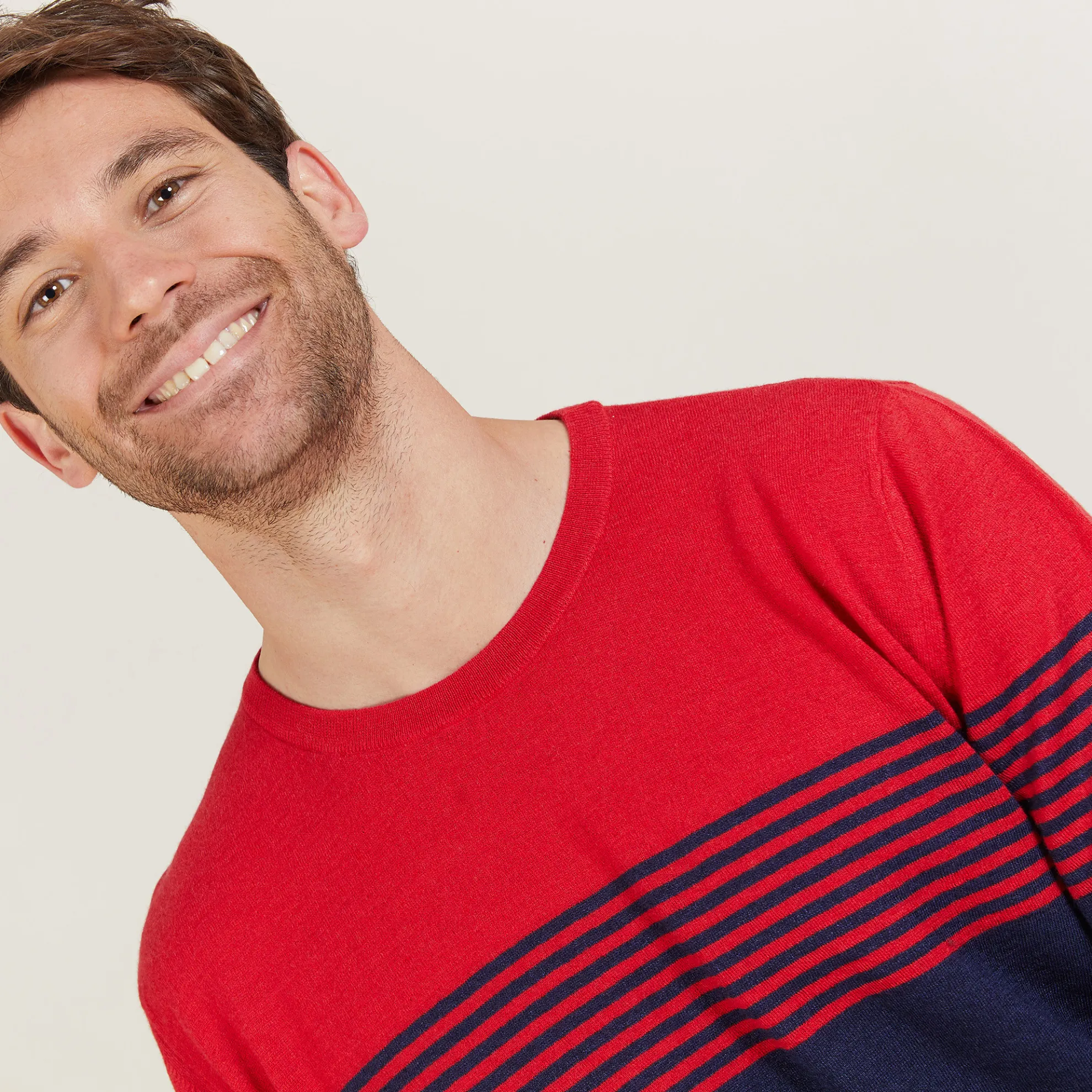 Pull A Rayures En Lin Et Cachemire Homme. Un Indispensable Pour Un Style Moderne Et Decontracte. La Legerete De La Matiere Vous Permet De Porter Le Pull Pour Toutes Occasions.