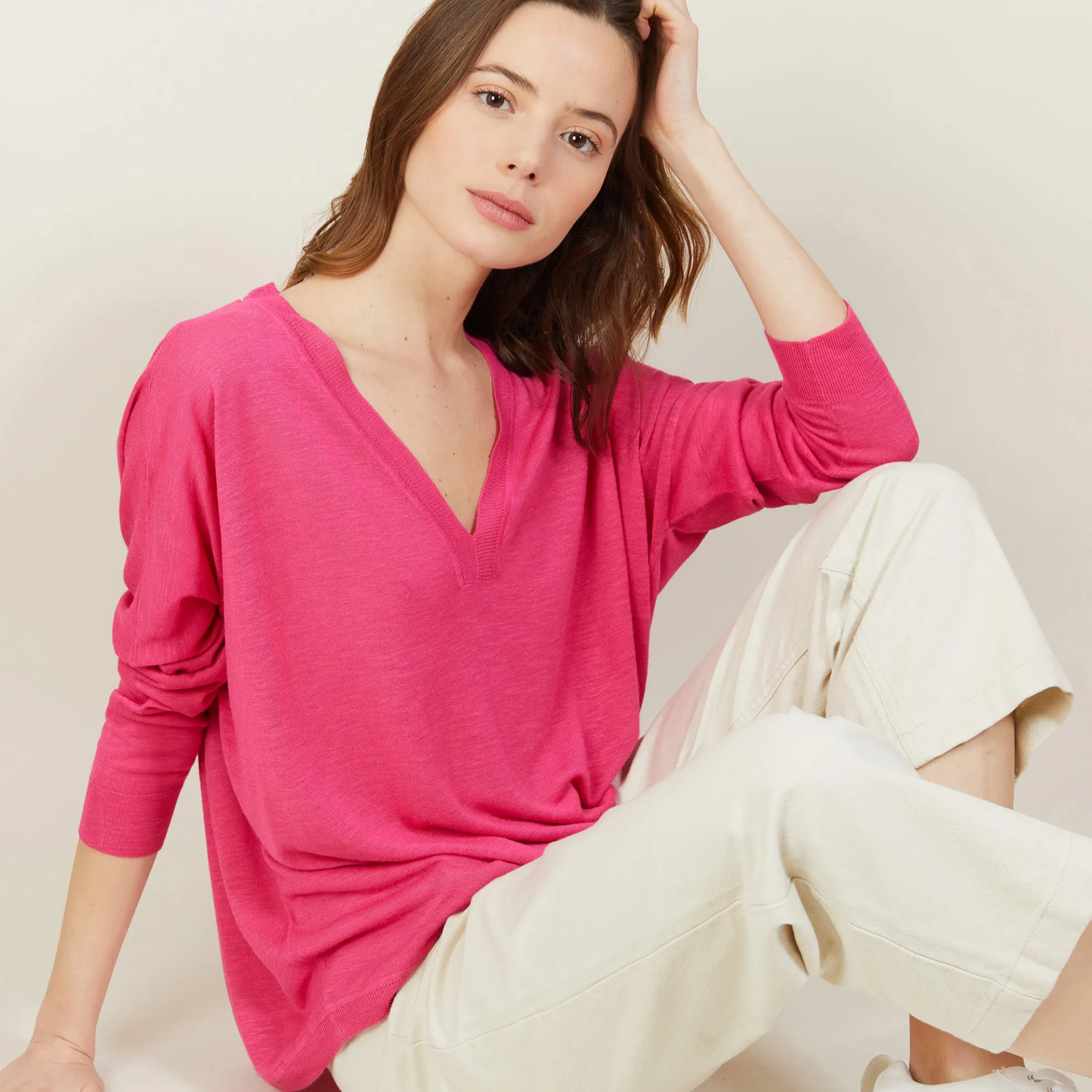 T-Shirt Manches Longues A Encolure En V Tricote En Point Jersey Au Portugal. Emmanchures Basses. Detail Au Niveau Du Col. Matiere Legere, Ideale A Porter En Periode De Forte Chaleur.