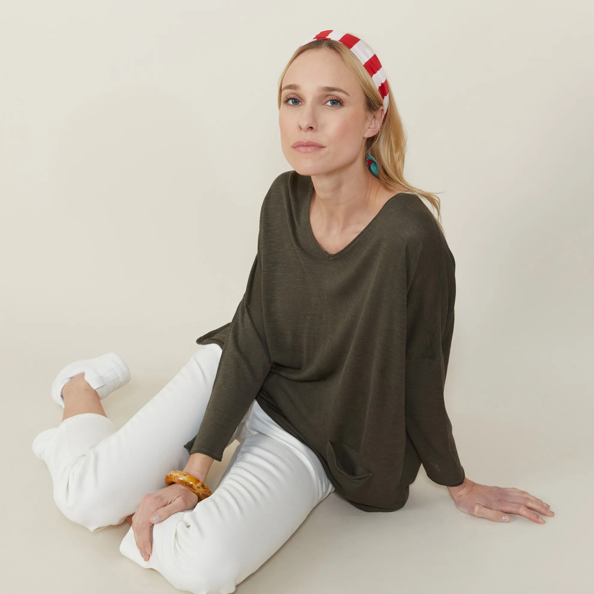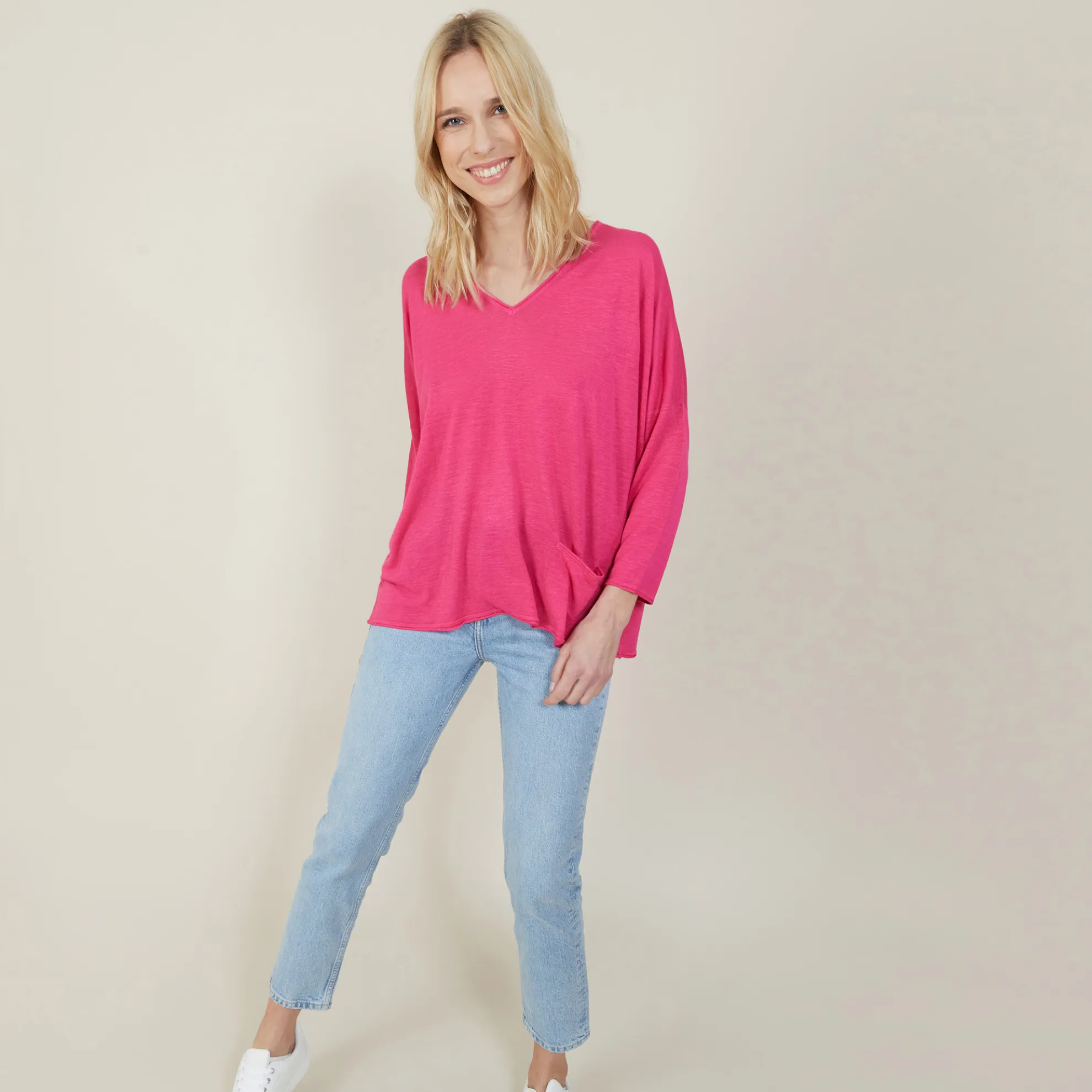 T-Shirt Manches Longues A Encolure En V Tricote En Point Jersey Au Portugal. Emmanchures Basses. Poche Plaquee Avant. Matiere Legere, Ideale A Porter En Periode De Forte Chaleur.