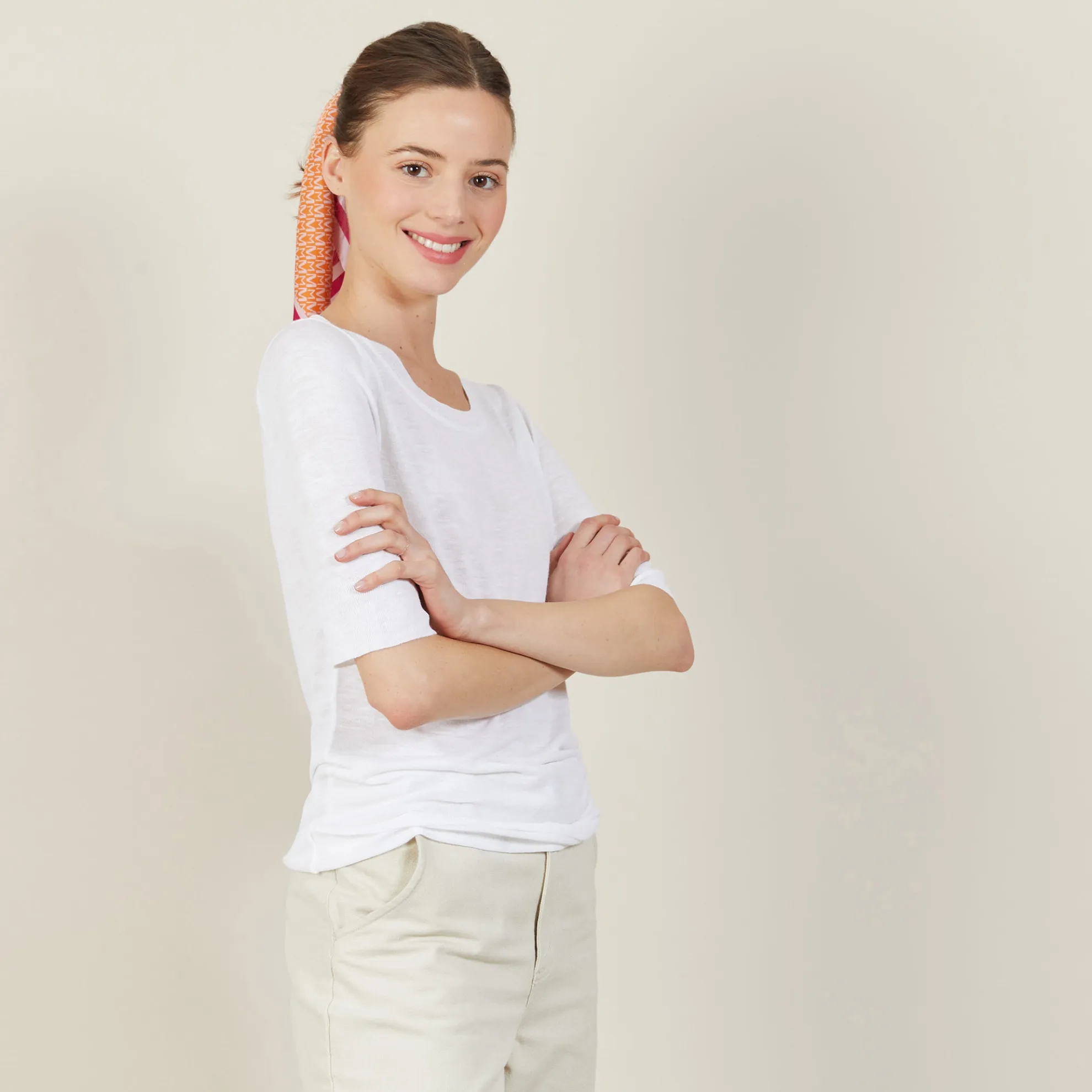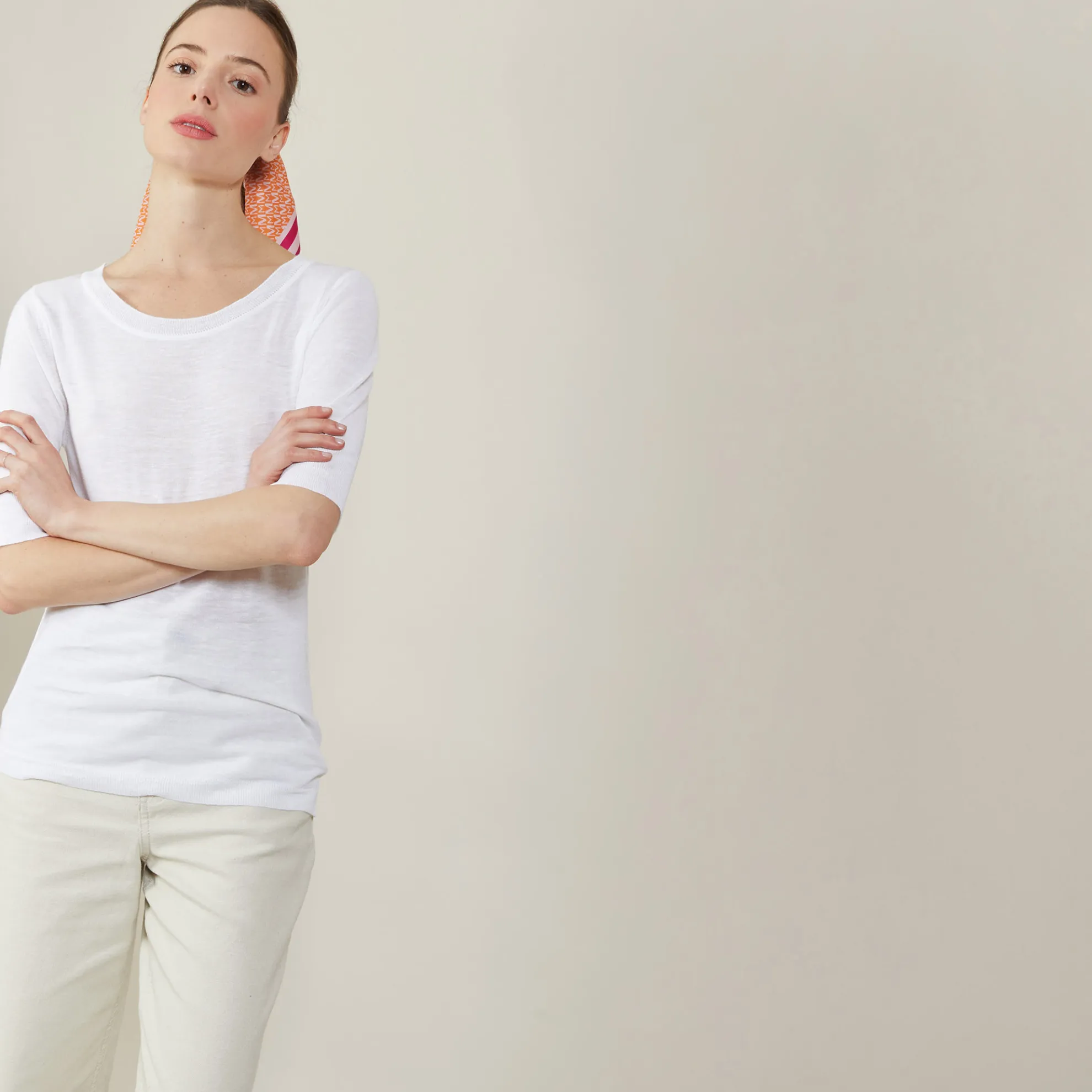 T-Shirt Encolure Ronde Tricote En Point Jersey Au Portugal. Manches Coudes. Coupe Droite. Matiere Legere, Ideale A Porter En Periode De Forte Chaleur.