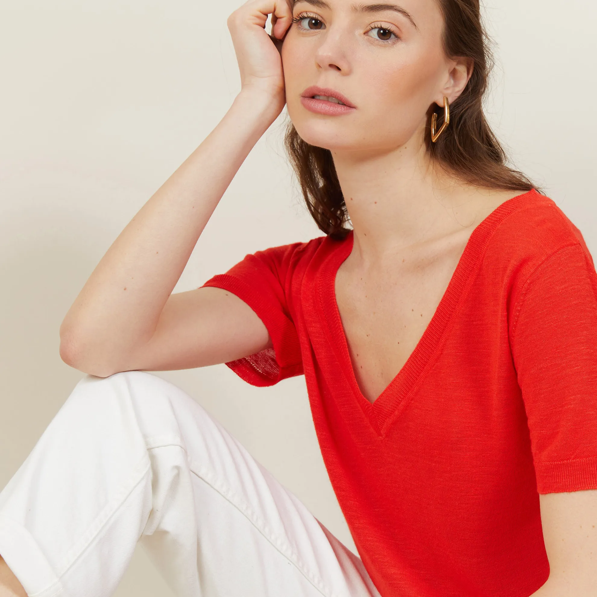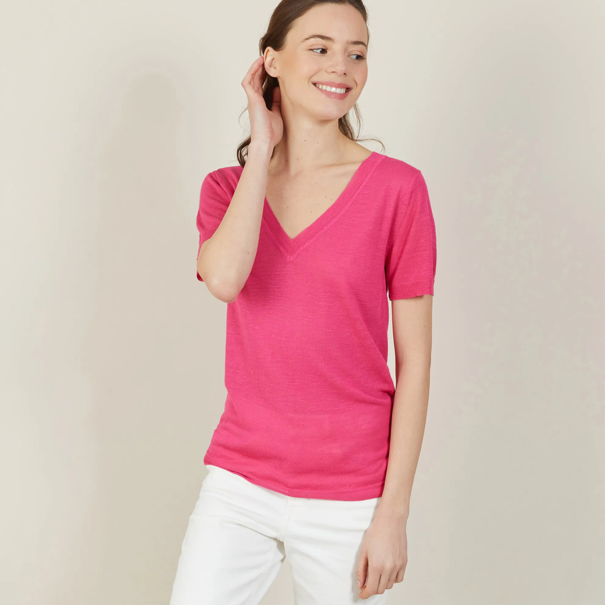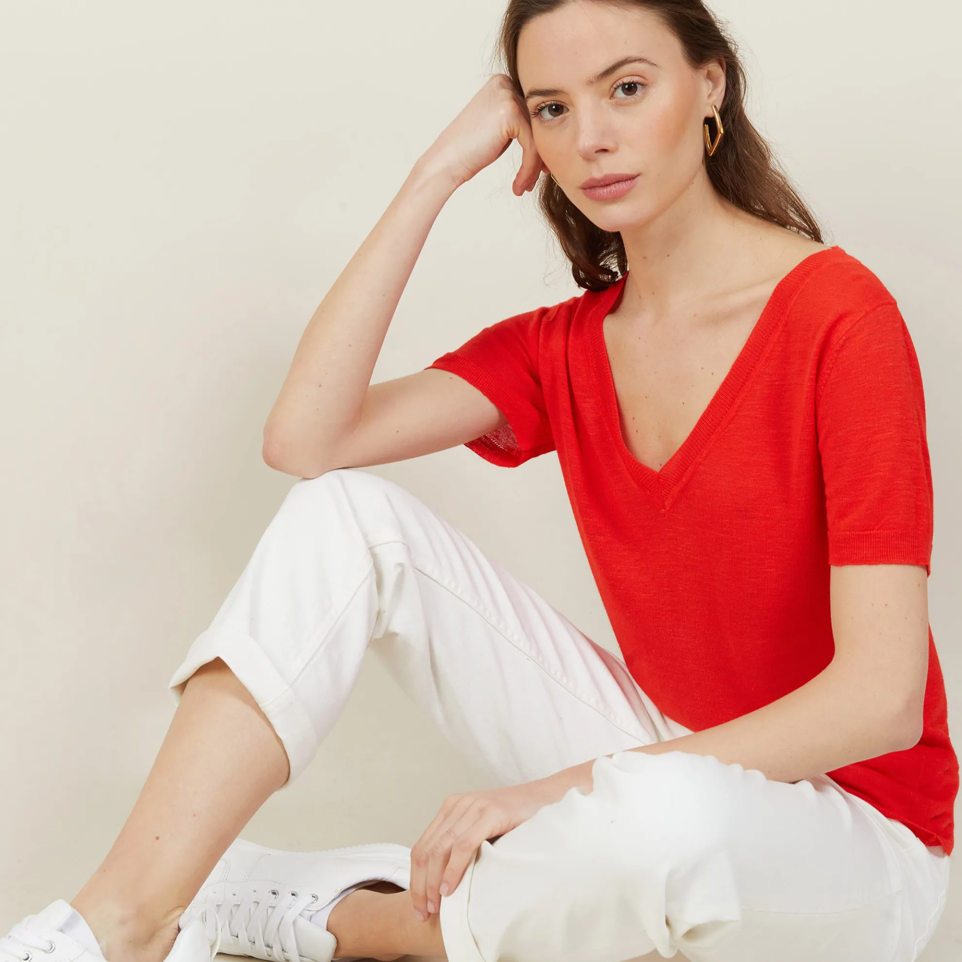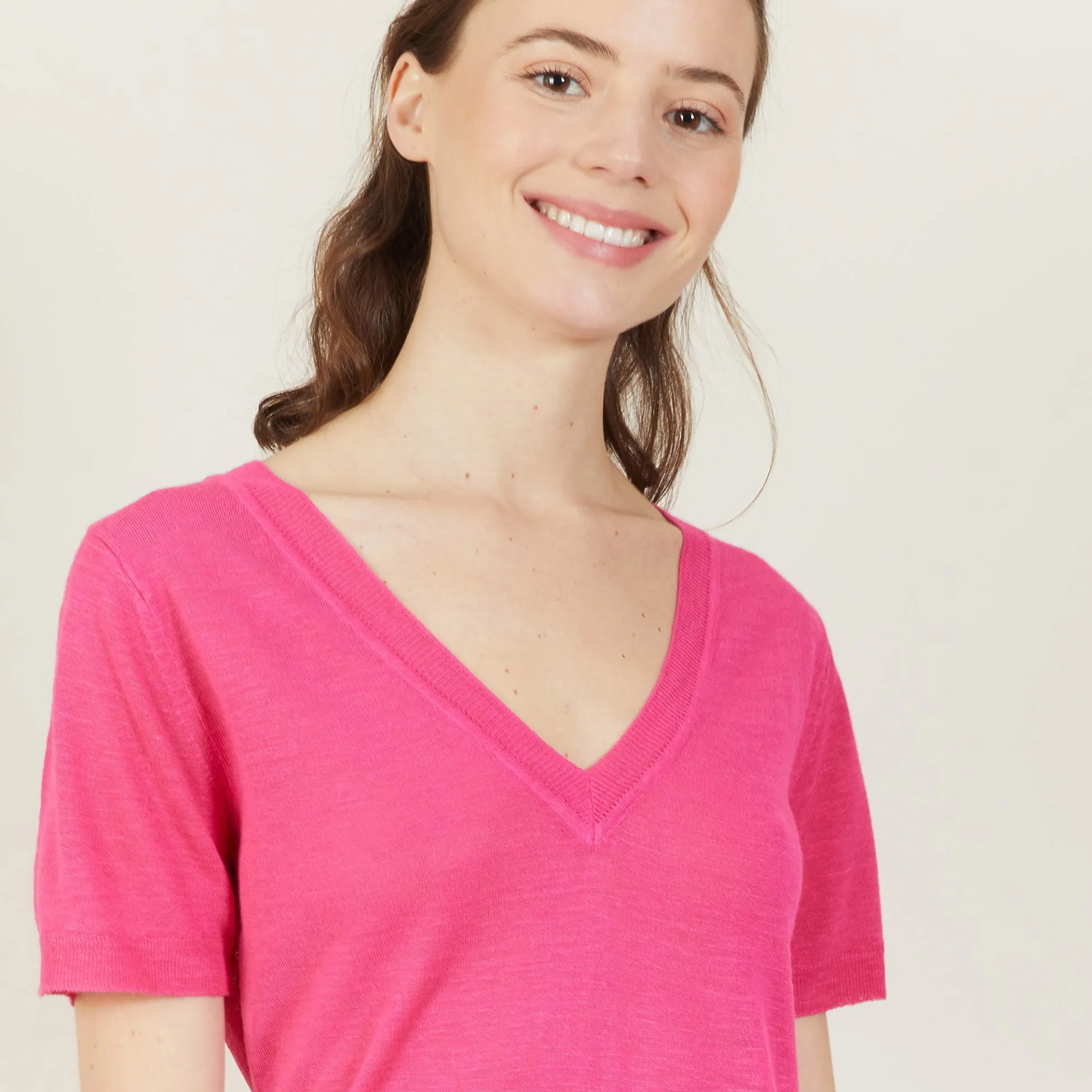 T-Shirt Col Encolure V Tricote En Point Jersey Au Portugal. Coupe Droite. Matiere Legere, Ideale A Porter En Periode De Forte Chaleur.
