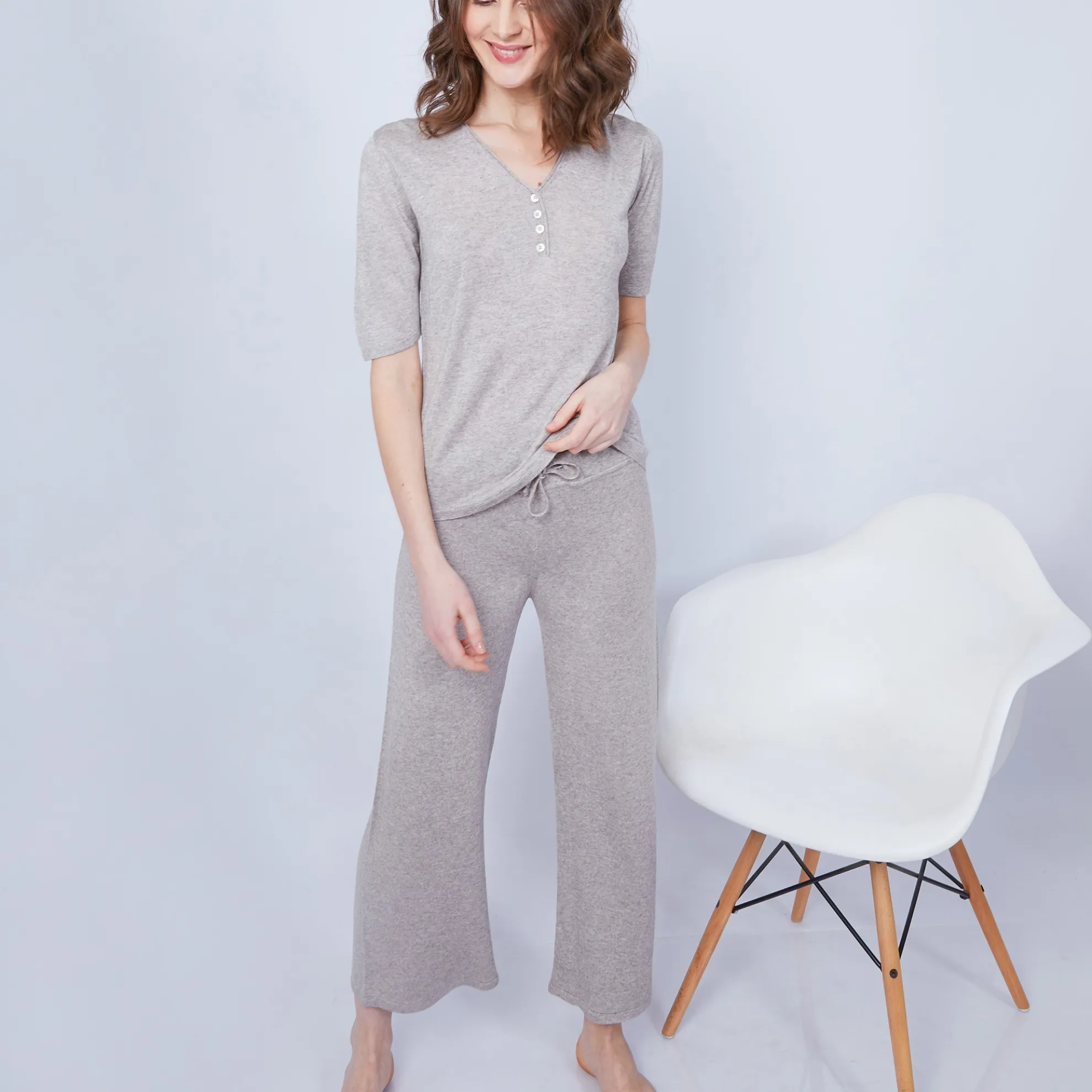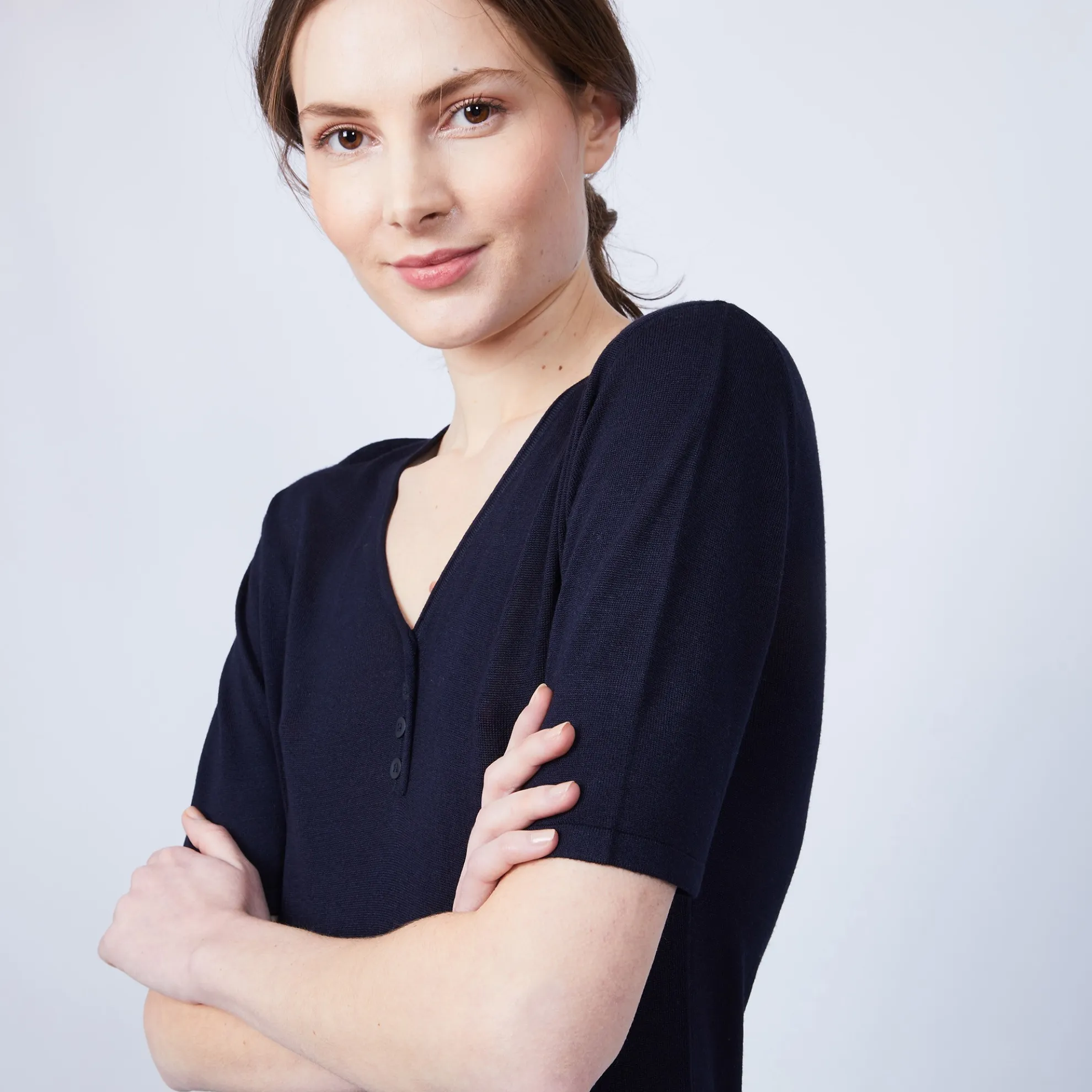 T-Shirt Manches Courtes Pour Femme. Le Col V Se Termine Par Une Petite Rangee De Boutons. Le Melange Bambou Et Cachemire Assure Un Toucher Extremement Doux Et Une Souplesse Incroyable. Notre Mannequin Porte Le Pantalon Hammam.