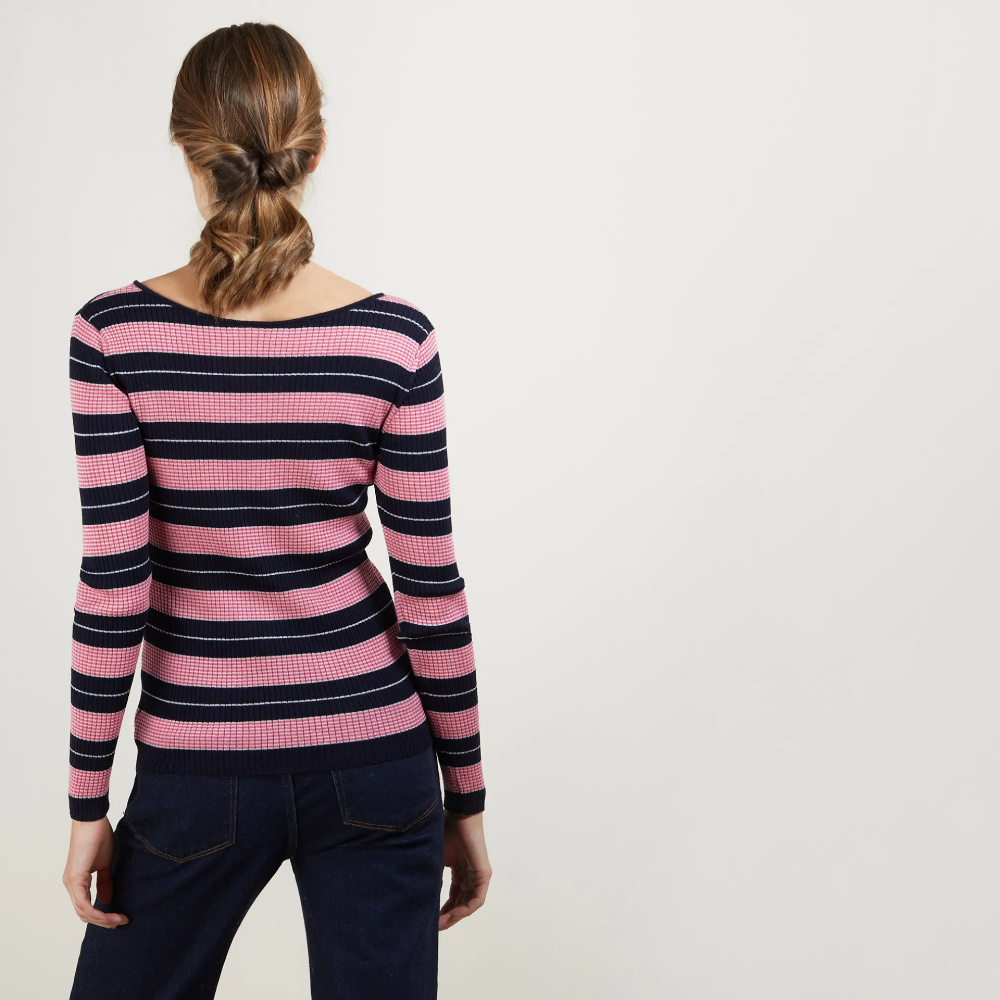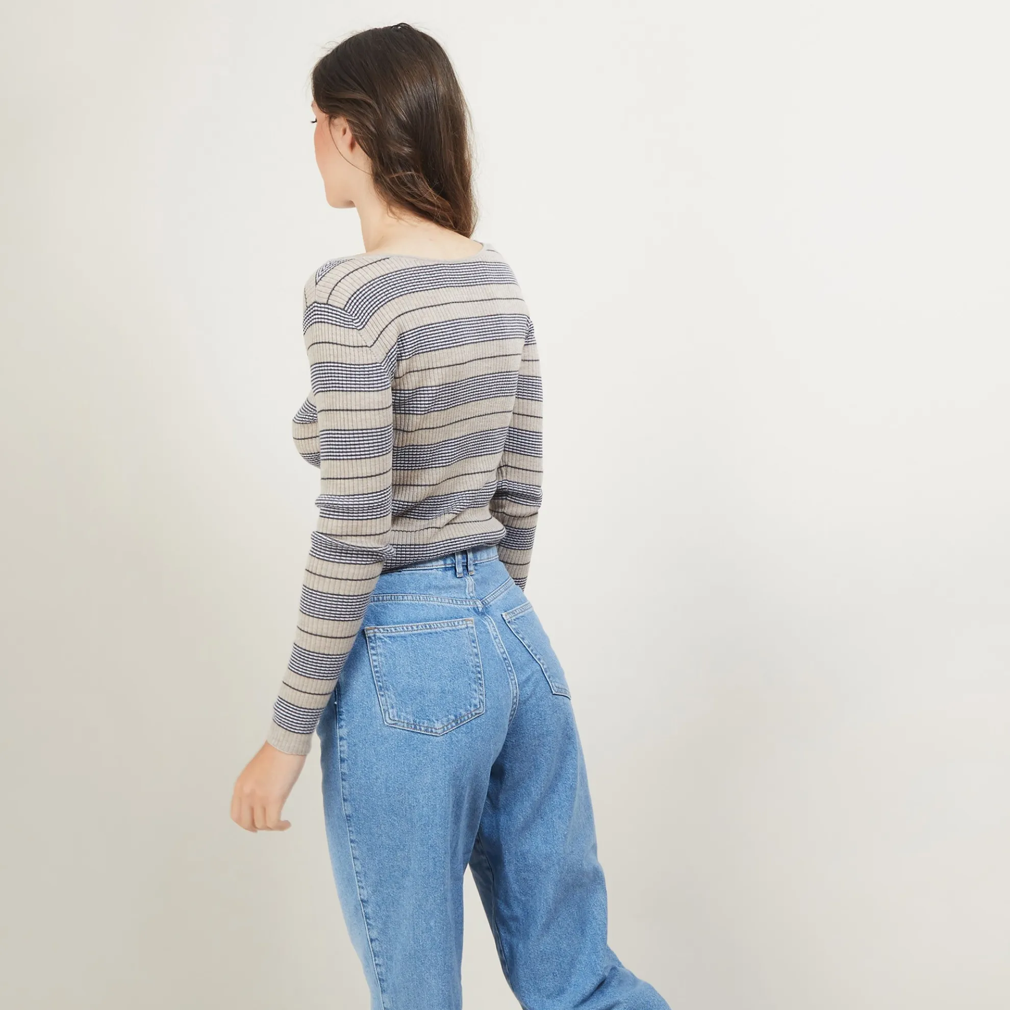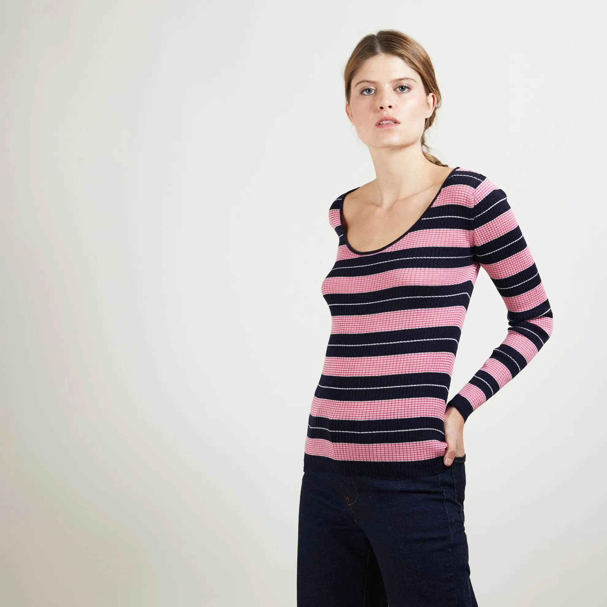 T-Shirt A Manches Longues. En 100% Laine, Ce T-Shirt A Manches Longues Est Pres Du Corps Avec Des Rayures Horizontales Pour Sculpter Votre Jolie Silhouette.