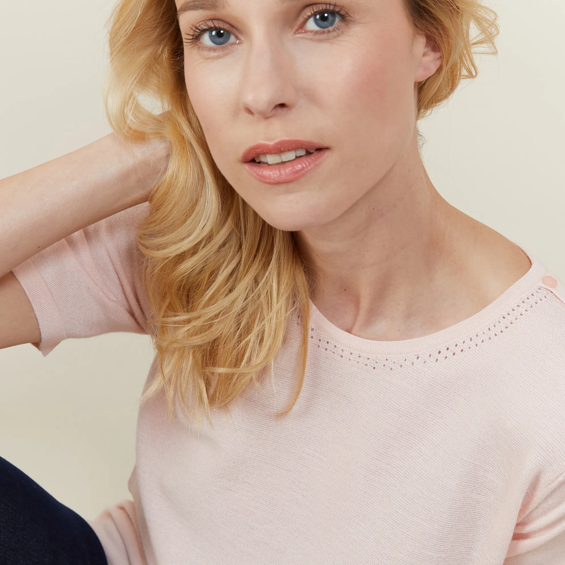 Top Femme En Laine Et Soie Extremement Doux Et Fin Grace A Un Point Mousse. Au Niveau Du Col Rond, La Maille Est Ajouree Pour Un Effet Tres Raffine. Le Melange Laine Et Soie Fait Partie Des Matieres Les Plus Agreables A Porter En Toute Saison. 4 Boutons Cousus Sur Epaule Gauche.
